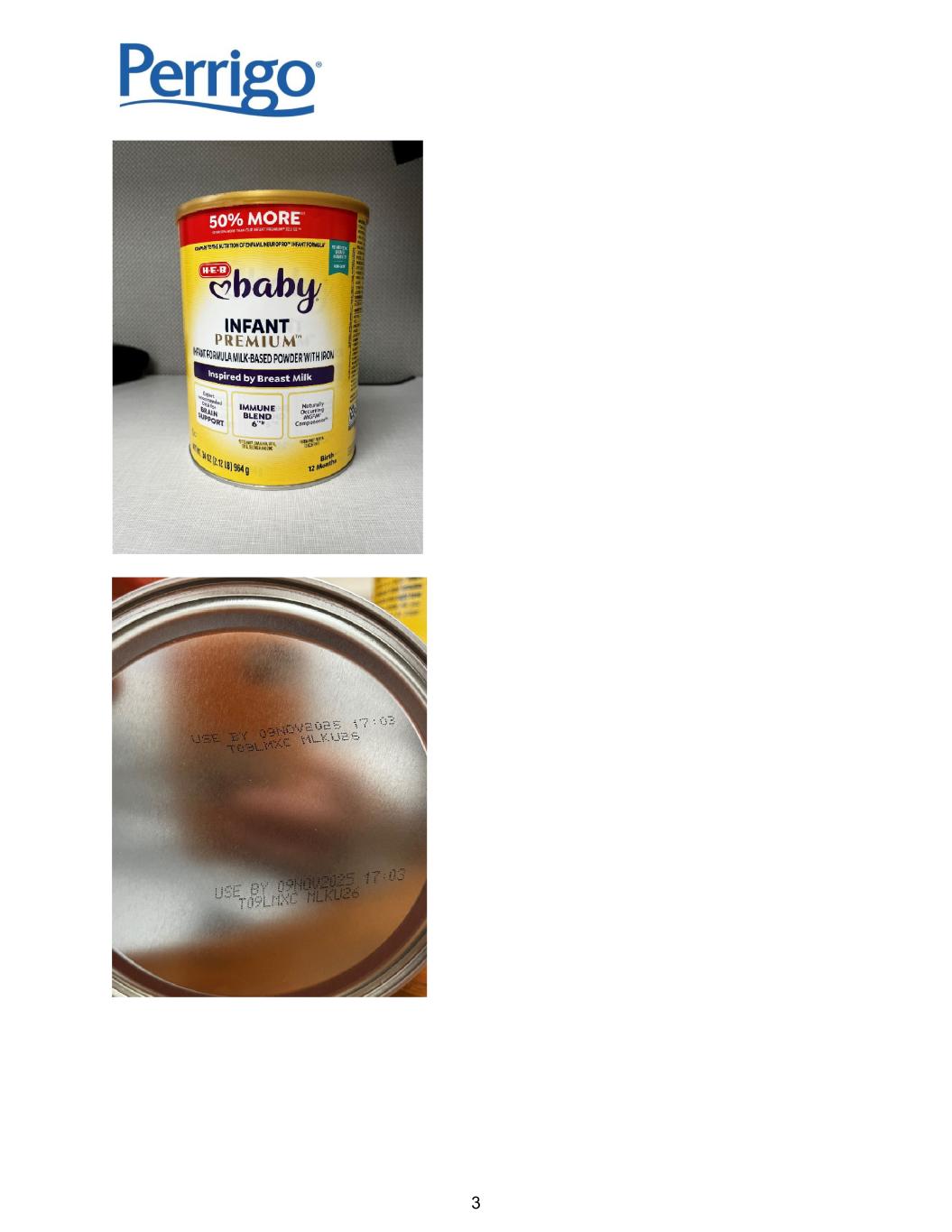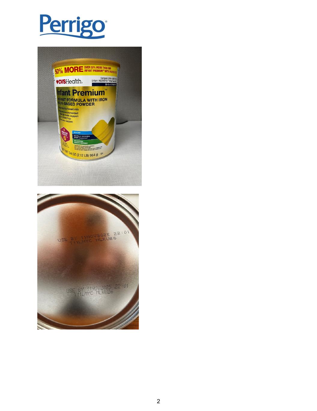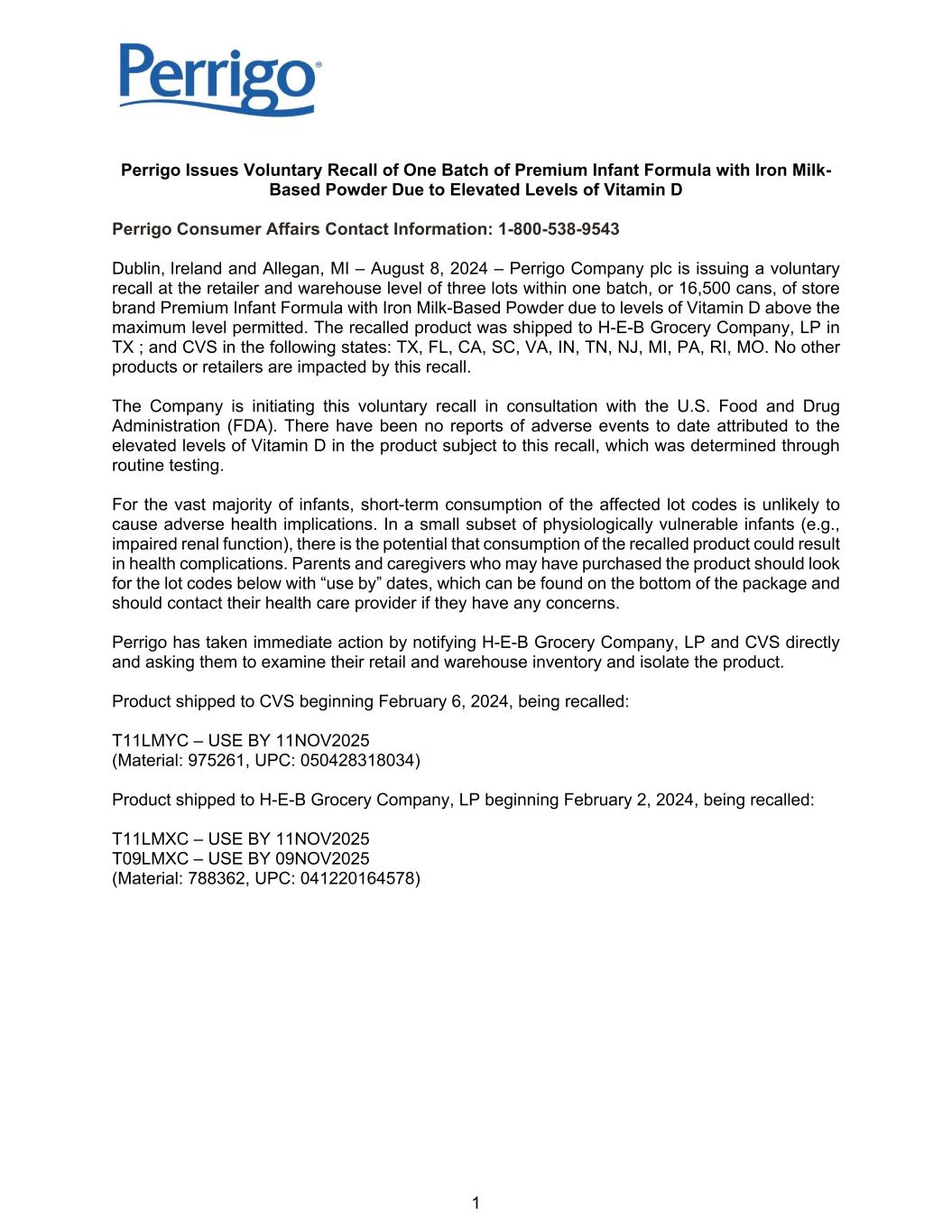 1 Perrigo Issues Voluntary Recall of One Batch of Premium Infant Formula with Iron Milk- Based Powder Due to Elevated Levels of Vitamin D Perrigo Consumer Affairs Contact Information: 1-800-538-9543 Dublin, Ireland and Allegan, MI – August 8, 2024 – Perrigo Company plc is issuing a voluntary recall at the retailer and warehouse level of three lots within one batch, or 16,500 cans, of store brand Premium Infant Formula with Iron Milk-Based Powder due to levels of Vitamin D above the maximum level permitted. The recalled product was shipped to H-E-B Grocery Company, LP in TX ; and CVS in the following states: TX, FL, CA, SC, VA, IN, TN, NJ, MI, PA, RI, MO. No other products or retailers are impacted by this recall. The Company is initiating this voluntary recall in consultation with the U.S. Food and Drug Administration (FDA). There have been no reports of adverse events to date attributed to the elevated levels of Vitamin D in the product subject to this recall, which was determined through routine testing. For the vast majority of infants, short-term consumption of the affected lot codes is unlikely to cause adverse health implications. In a small subset of physiologically vulnerable infants (e.g., impaired renal function), there is the potential that consumption of the recalled product could result in health complications. Parents and caregivers who may have purchased the product should look for the lot codes below with “use by” dates, which can be found on the bottom of the package and should contact their health care provider if they have any concerns. Perrigo has taken immediate action by notifying H-E-B Grocery Company, LP and CVS directly and asking them to examine their retail and warehouse inventory and isolate the product. Product shipped to CVS beginning February 6, 2024, being recalled: T11LMYC – USE BY 11NOV2025 (Material: 975261, UPC: 050428318034) Product shipped to H-E-B Grocery Company, LP beginning February 2, 2024, being recalled: T11LMXC – USE BY 11NOV2025 T09LMXC – USE BY 09NOV2025 (Material: 788362, UPC: 041220164578)