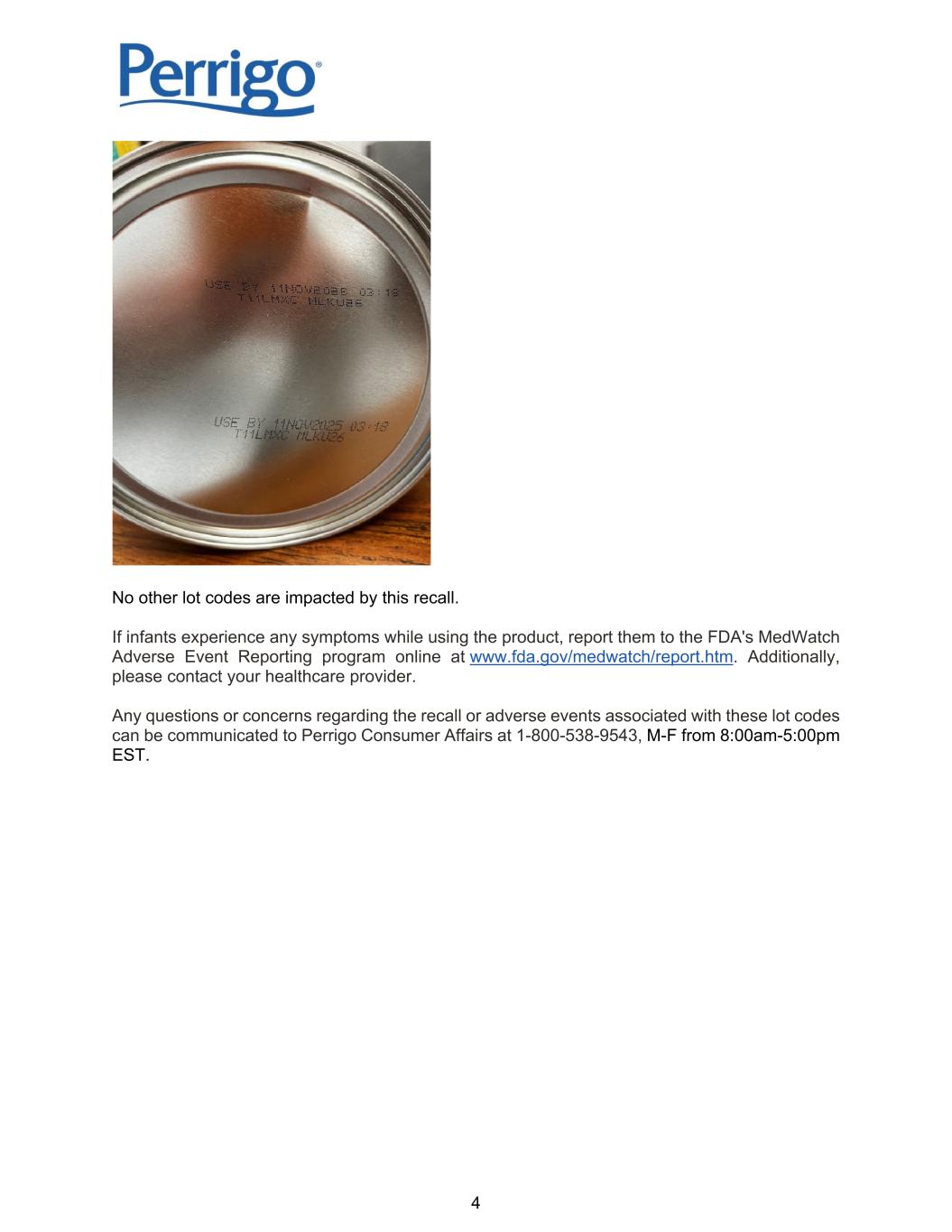 4 No other lot codes are impacted by this recall. If infants experience any symptoms while using the product, report them to the FDA's MedWatch Adverse Event Reporting program online at www.fda.gov/medwatch/report.htm. Additionally, please contact your healthcare provider. Any questions or concerns regarding the recall or adverse events associated with these lot codes can be communicated to Perrigo Consumer Affairs at 1-800-538-9543, M-F from 8:00am-5:00pm EST.