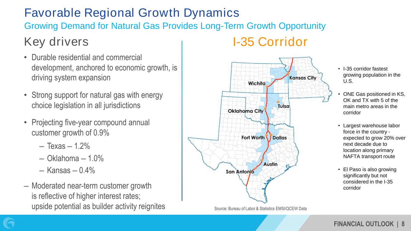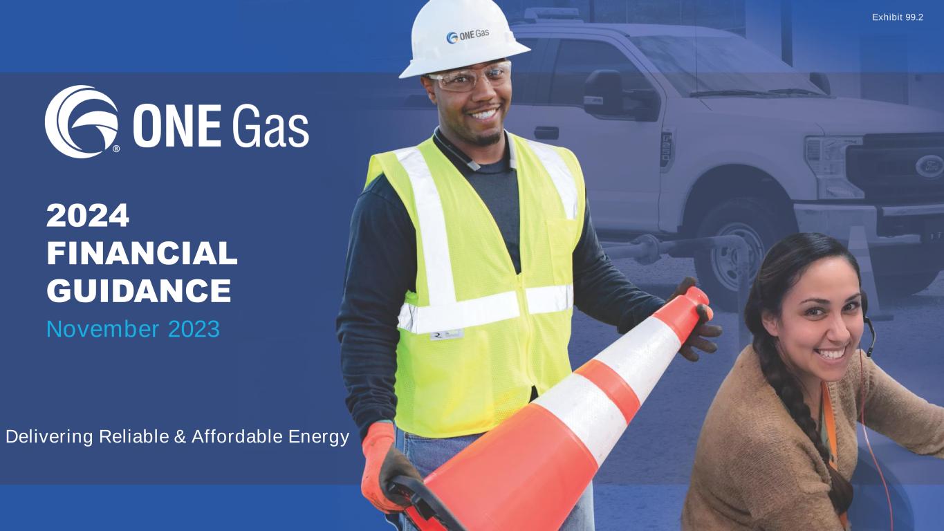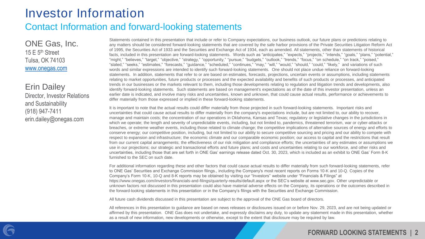 FORWARD LOOKING STATEMENTS | 2FORWARD LOOKING STATEMENTS | 2 Investor Information Contact Information and forward-looking statements Statements contained in this presentation that include or refer to Company expectations, our business outlook, our future plans or predictions relating to any matters should be considered forward-looking statements that are covered by the safe harbor provisions of the Private Securities Litigation Reform Act of 1995, the Securities Act of 1933 and the Securities and Exchange Act of 1934, each as amended. All statements, other than statements of historical facts, included in this presentation are forward-looking statements. Words such as “anticipates,” “expects,” “projects,” “intends,” “goals,” “plans,” “potential,” “might,” “believes,” “target,” “objective,” “strategy,” “opportunity,” “pursue,” “budgets,” “outlook,” “trends,” “focus,” “on schedule,” “on track,” “poised,” “slated,” “seeks,” “estimates,” “forecasts,” “guidance,” “scheduled,” “continues,” “may,” “will,” “would,” “should,” “could,” “likely,” and variations of such words and similar expressions are intended to identify such forward-looking statements. One should not place undue reliance on forward-looking statements. In addition, statements that refer to or are based on estimates, forecasts, projections, uncertain events or assumptions, including statements relating to market opportunities, future products or processes and the expected availability and benefits of such products or processes, and anticipated trends in our businesses or the markets relevant to them, including those developments relating to regulation and litigation trends and developments, also identify forward-looking statements. Such statements are based on management's expectations as of the date of this investor presentation, unless an earlier date is indicated, and involve many risks and uncertainties, known and unknown, that could cause actual results, performance or achievements to differ materially from those expressed or implied in these forward-looking statements. It is important to note that the actual results could differ materially from those projected in such forward-looking statements. Important risks and uncertainties that could cause actual results to differ materially from the company's expectations include, but are not limited to, our ability to recover, manage and maintain costs; the concentration of our operations in Oklahoma, Kansas and Texas; regulatory or legislative changes in the jurisdictions in which we operate; the length and severity of unpredictable events, including, but not limited to, pandemics, threatened terrorism, war or cyber-attacks or breaches, or extreme weather events, including those related to climate change; the competitive implications of alternative sources of energy and efforts to conserve energy; our competitive position, including, but not limited to our ability to secure competitive sourcing and pricing and our ability to compete with respect to expansion and infrastructure; the economic climate and our comparable economic position; our access to capital and the restrictions that result from our current capital arrangements; the effectiveness of our risk mitigation and compliance efforts; the uncertainties of any estimates or assumptions we use in our projections; our strategic and transactional efforts and future plans; and costs and uncertainties relating to our workforce, and other risks and uncertainties, including those that are set forth in ONE Gas’ earnings release dated Oct. 30, 2023, which is included as an exhibit to ONE Gas’ Form 8-K furnished to the SEC on such date. For additional information regarding these and other factors that could cause actual results to differ materially from such forward-looking statements, refer to ONE Gas’ Securities and Exchange Commission filings., including the Company's most recent reports on Forms 10-K and 10-Q. Copies of the Company’s Form 10-K, 10-Q and 8-K reports may be obtained by visiting our “Investors” website under “Financials & Filings” at https://www.onegas.com/investors/financials-and-filings/quarterly-results/default.aspx or the SEC’s website at www.sec.gov. Other unpredictable or unknown factors not discussed in this presentation could also have material adverse effects on the Company, its operations or the outcomes described in the forward-looking statements in this presentation or in the Company’s filings with the Securities and Exchange Commission. All future cash dividends discussed in this presentation are subject to the approval of the ONE Gas board of directors. All references in this presentation to guidance are based on news releases or disclosures issued on or before Nov. 29, 2023, and are not being updated or affirmed by this presentation. ONE Gas does not undertake, and expressly disclaims any duty, to update any statement made in this presentation, whether as a result of new information, new developments or otherwise, except to the extent that disclosure may be required by law. ONE Gas, Inc. 15 E 5th Street Tulsa, OK 74103 www.onegas.com Erin Dailey Director, Investor Relations and Sustainability (918) 947-7411 erin.dailey@onegas.com