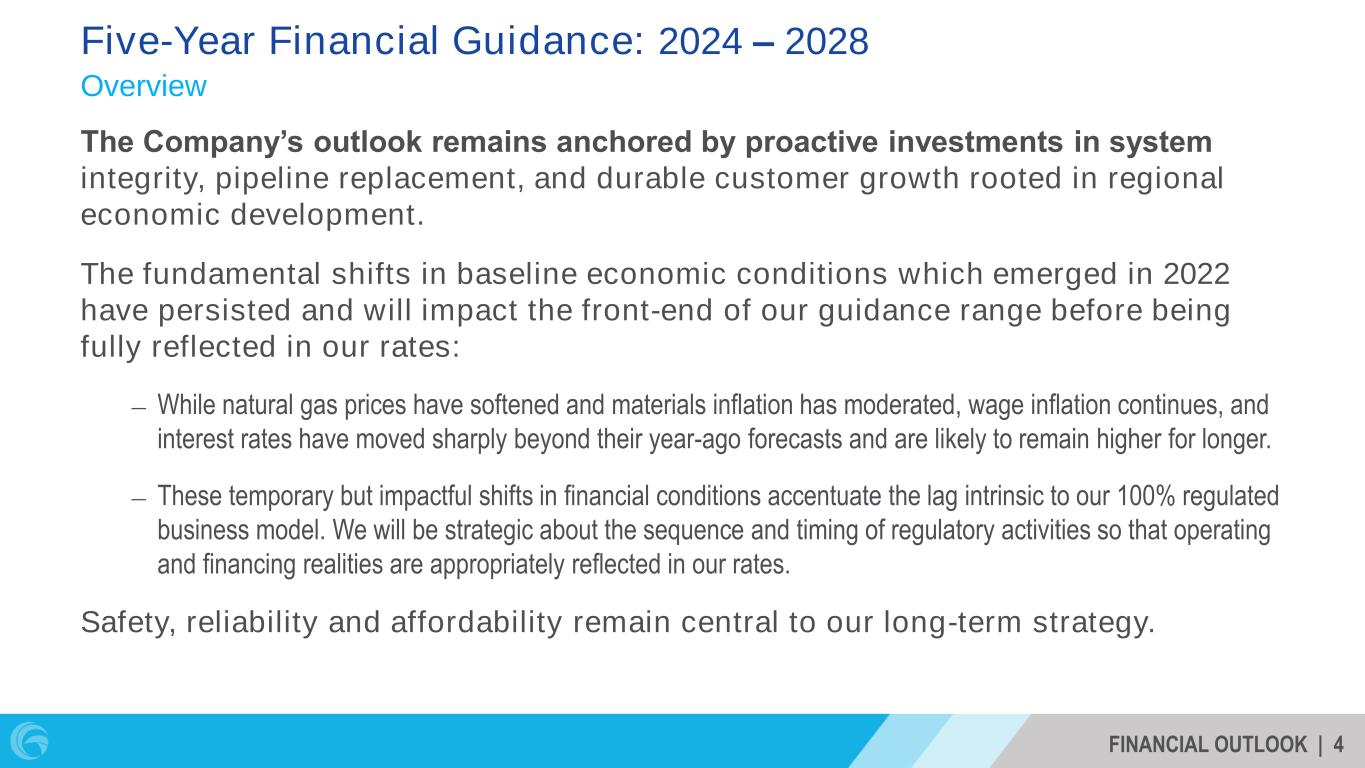 FINANCIAL OUTLOOK | 4 Five-Year Financial Guidance: 2024 – 2028 The Company’s outlook remains anchored by proactive investments in system integrity, pipeline replacement, and durable customer growth rooted in regional economic development. The fundamental shifts in baseline economic conditions which emerged in 2022 have persisted and will impact the front-end of our guidance range before being fully reflected in our rates: – While natural gas prices have softened and materials inflation has moderated, wage inflation continues, and interest rates have moved sharply beyond their year-ago forecasts and are likely to remain higher for longer. – These temporary but impactful shifts in financial conditions accentuate the lag intrinsic to our 100% regulated business model. We will be strategic about the sequence and timing of regulatory activities so that operating and financing realities are appropriately reflected in our rates. Safety, reliability and affordability remain central to our long-term strategy. Overview