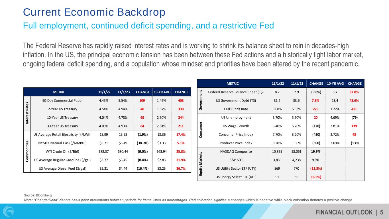 FINANCIAL OUTLOOK | 5 Current Economic Backdrop The Federal Reserve has rapidly raised interest rates and is working to shrink its balance sheet to rein in decades-high inflation. In the US, the principal economic tension has been between these Fed actions and a historically tight labor market, ongoing federal deficit spending, and a population whose mindset and priorities have been altered by the recent pandemic. Full employment, continued deficit spending, and a restrictive Fed Note: “Change/Delta” denote basis point movements between periods for items listed as percentages. Red coloration signifies a changes which is negative while black coloration denotes a positive change. Source: Bloomberg 11/1/22 11/1/23 CHANGE 10-YR AVG CHANGE 11/1/22 11/1/23 CHANGE 10-YR AVG CHANGE Federal Reserve Balance Sheet (T$) 8.7 7.9 (9.8%) 5.7 37.8% 90-Day Commercial Paper 4.45% 5.54% 109 1.46% 408 US Government Debt (T$) 31.2 33.6 7.8% 23.4 43.6% 2-Year US Treasury 4.54% 4.94% 40 1.57% 338 Fed Funds Rate 3.08% 5.33% 225 1.22% 411 10-Year US Treasury 4.04% 4.73% 69 2.30% 244 US Unemployment 3.70% 3.90% 20 4.69% (79) 30-Year US Treasury 4.09% 4.93% 84 2.81% 211 US Wage Growth 6.40% 5.20% (120) 3.81% 139 US Average Retail Electricity (¢/kWh) 15.99 15.68 (1.9%) 13.36 17.4% Consumer Price Index 7.70% 3.20% (450) 2.72% 48 NYMEX Natural Gas ($/MMBtu) $5.71 $3.49 (38.9%) $3.33 5.1% Producer Price Index 8.20% 1.30% (690) 2.69% (139) WTI Crude Oil ($/Bbl) $88.37 $80.44 (9.0%) $63.94 25.8% NASDAQ Composite 10,891 13,061 19.9% US Average Regular Gasoline ($/gal) $3.77 $3.45 (8.4%) $2.83 21.9% S&P 500 3,856 4,238 9.9% US Average Diesel Fuel ($/gal) $5.31 $4.44 (16.4%) $3.25 36.7% US Utility Sector ETF (UTY) 869 770 (11.5%) US Energy Select ETF (XLE) 91 85 (6.5%) METRIC METRIC In te re st R at e s Eq u it y M ar ke ts C o m m o d it ie s G o ve rn m e n t C o n su m e r