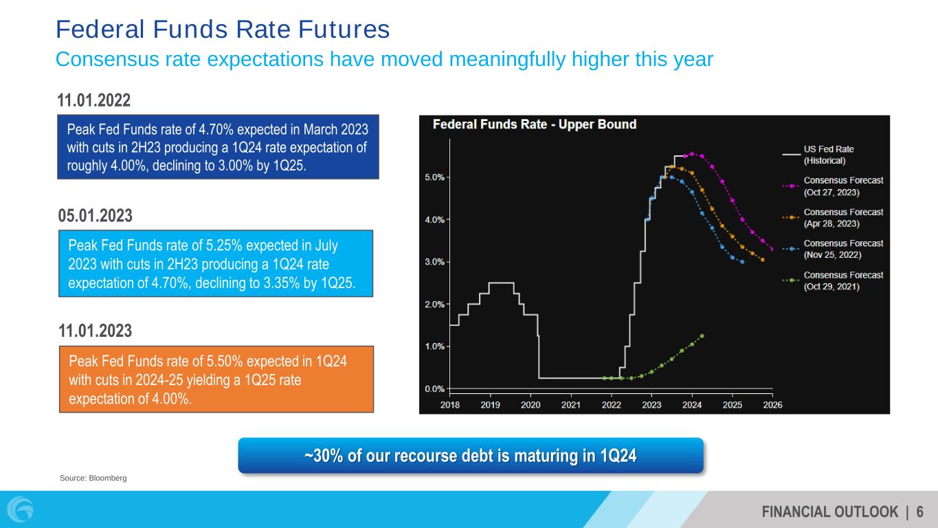 FINANCIAL OUTLOOK | 6 Federal Funds Rate Futures Consensus rate expectations have moved meaningfully higher this year 11.01.2022 Peak Fed Funds rate of 4.70% expected in March 2023 with cuts in 2H23 producing a 1Q24 rate expectation of roughly 4.00%, declining to 3.00% by 1Q25. 05.01.2023 Peak Fed Funds rate of 5.25% expected in July 2023 with cuts in 2H23 producing a 1Q24 rate expectation of 4.70%, declining to 3.35% by 1Q25. 11.01.2023 Peak Fed Funds rate of 5.50% expected in 1Q24 with cuts in 2024-25 yielding a 1Q25 rate expectation of 4.00%. Source: Bloomberg ~30% of our recourse debt is maturing in 1Q24