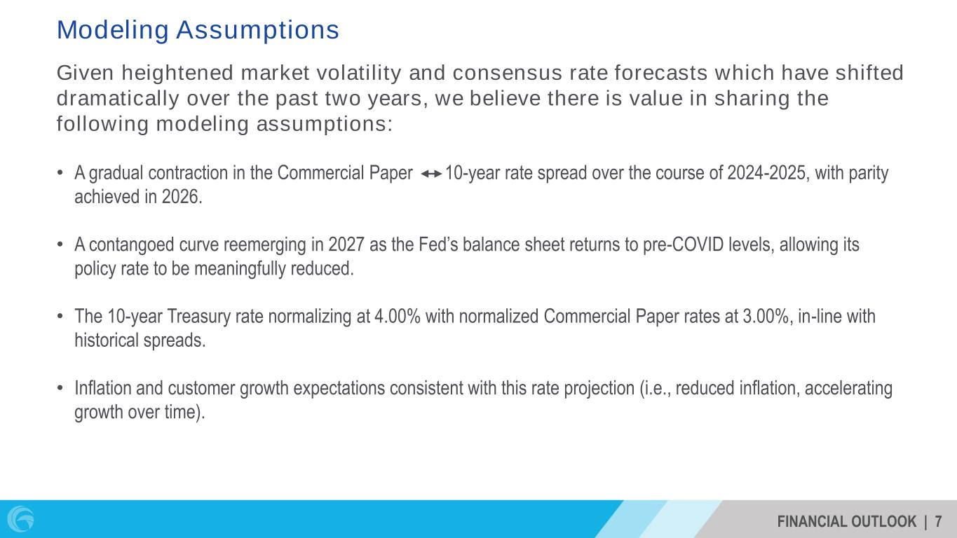 FINANCIAL OUTLOOK | 7 Modeling Assumptions • A gradual contraction in the Commercial Paper 10-year rate spread over the course of 2024-2025, with parity achieved in 2026. • A contangoed curve reemerging in 2027 as the Fed’s balance sheet returns to pre-COVID levels, allowing its policy rate to be meaningfully reduced. • The 10-year Treasury rate normalizing at 4.00% with normalized Commercial Paper rates at 3.00%, in-line with historical spreads. • Inflation and customer growth expectations consistent with this rate projection (i.e., reduced inflation, accelerating growth over time). Given heightened market volatility and consensus rate forecasts which have shifted dramatically over the past two years, we believe there is value in sharing the following modeling assumptions: