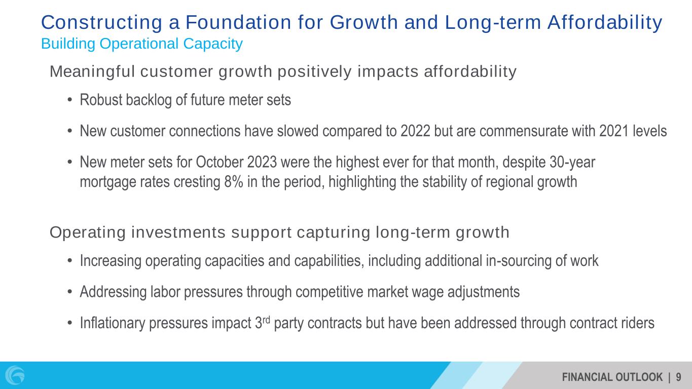 FINANCIAL OUTLOOK | 9 Constructing a Foundation for Growth and Long-term Affordability Meaningful customer growth positively impacts affordability • Robust backlog of future meter sets • New customer connections have slowed compared to 2022 but are commensurate with 2021 levels • New meter sets for October 2023 were the highest ever for that month, despite 30-year mortgage rates cresting 8% in the period, highlighting the stability of regional growth Operating investments support capturing long-term growth • Increasing operating capacities and capabilities, including additional in-sourcing of work • Addressing labor pressures through competitive market wage adjustments • Inflationary pressures impact 3rd party contracts but have been addressed through contract riders Building Operational Capacity