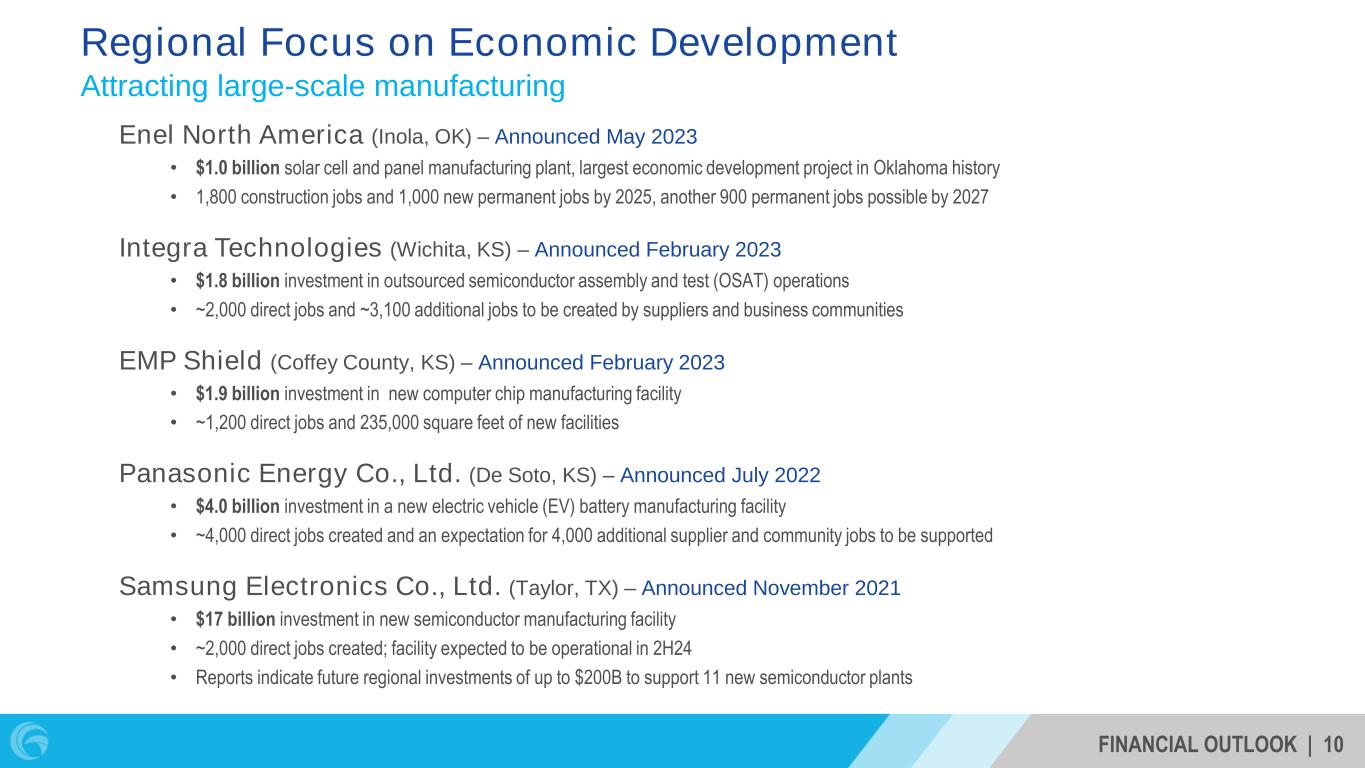FINANCIAL OUTLOOK | 10 Regional Focus on Economic Development Attracting large-scale manufacturing Enel North America (Inola, OK) – Announced May 2023 • $1.0 billion solar cell and panel manufacturing plant, largest economic development project in Oklahoma history • 1,800 construction jobs and 1,000 new permanent jobs by 2025, another 900 permanent jobs possible by 2027 Integra Technologies (Wichita, KS) – Announced February 2023 • $1.8 billion investment in outsourced semiconductor assembly and test (OSAT) operations • ~2,000 direct jobs and ~3,100 additional jobs to be created by suppliers and business communities EMP Shield (Coffey County, KS) – Announced February 2023 • $1.9 billion investment in new computer chip manufacturing facility • ~1,200 direct jobs and 235,000 square feet of new facilities Panasonic Energy Co., Ltd. (De Soto, KS) – Announced July 2022 • $4.0 billion investment in a new electric vehicle (EV) battery manufacturing facility • ~4,000 direct jobs created and an expectation for 4,000 additional supplier and community jobs to be supported Samsung Electronics Co., Ltd. (Taylor, TX) – Announced November 2021 • $17 billion investment in new semiconductor manufacturing facility • ~2,000 direct jobs created; facility expected to be operational in 2H24 • Reports indicate future regional investments of up to $200B to support 11 new semiconductor plants