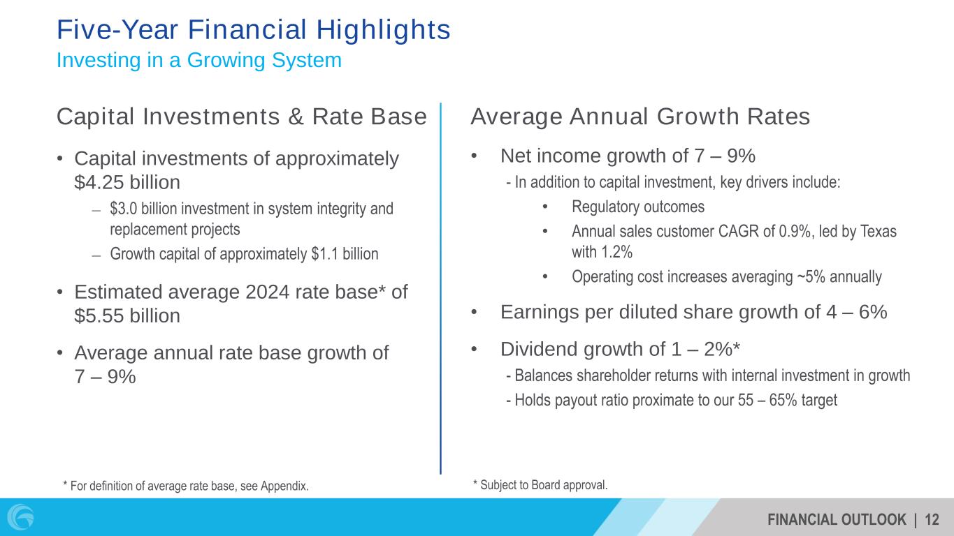 FINANCIAL OUTLOOK | 12 Five-Year Financial Highlights Capital Investments & Rate Base • Capital investments of approximately $4.25 billion – $3.0 billion investment in system integrity and replacement projects – Growth capital of approximately $1.1 billion • Estimated average 2024 rate base* of $5.55 billion • Average annual rate base growth of 7 – 9% Investing in a Growing System Average Annual Growth Rates • Net income growth of 7 – 9% - In addition to capital investment, key drivers include: • Regulatory outcomes • Annual sales customer CAGR of 0.9%, led by Texas with 1.2% • Operating cost increases averaging ~5% annually • Earnings per diluted share growth of 4 – 6% • Dividend growth of 1 – 2%* - Balances shareholder returns with internal investment in growth - Holds payout ratio proximate to our 55 – 65% target * For definition of average rate base, see Appendix. * Subject to Board approval.