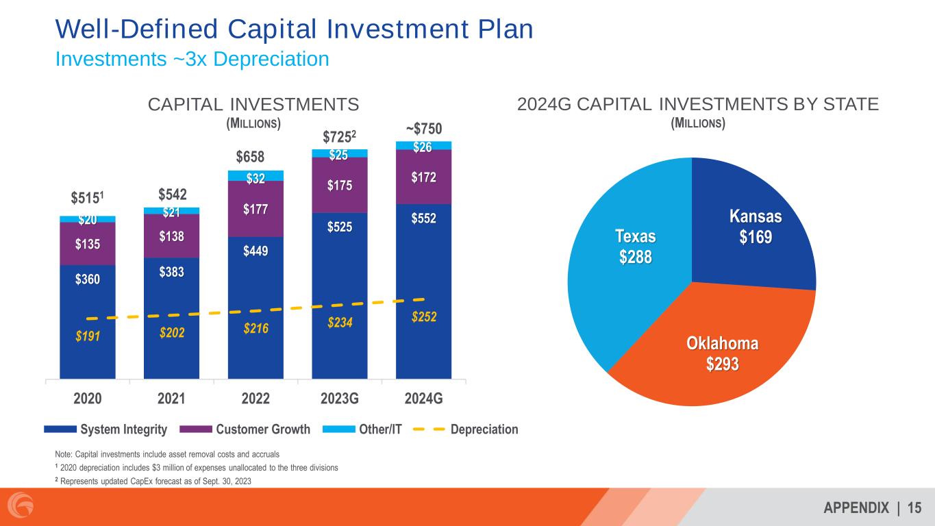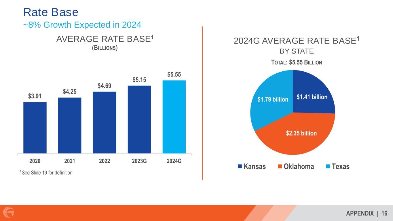 APPENDIX | 15 $360 $383 $449 $525 $552 $135 $138 $177 $175 $172 $20 $21 $32 $25 $26 $191 $202 $216 $234 $252 2020 2021 2022 2023G 2024G CAPITAL INVESTMENTS (MILLIONS) System Integrity Customer Growth Other/IT Depreciation $5151 $542 $658 $7252 ~$750 Well-Defined Capital Investment Plan Investments ~3x Depreciation Kansas $169 Oklahoma $293 Texas $288 2024G CAPITAL INVESTMENTS BY STATE (MILLIONS) Note: Capital investments include asset removal costs and accruals 1 2020 depreciation includes $3 million of expenses unallocated to the three divisions 2 Represents updated CapEx forecast as of Sept. 30, 2023