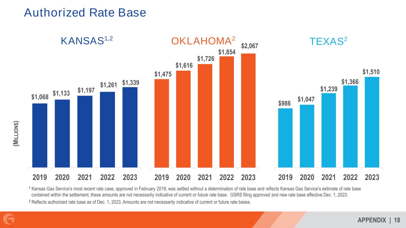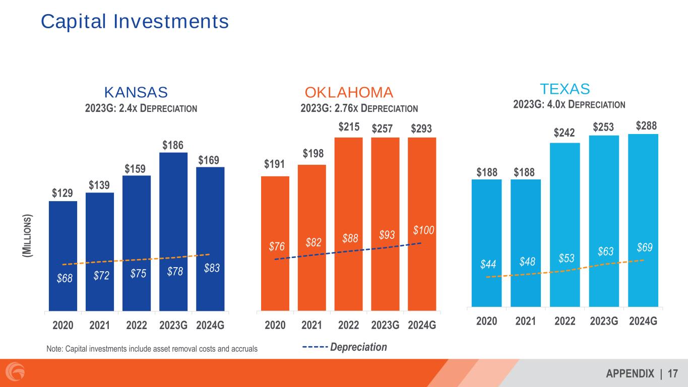 APPENDIX | 17 Capital Investments $129 $139 $159 $186 $169 $68 $72 $75 $78 $83 2020 2021 2022 2023G 2024G KANSAS 2023G: 2.4X DEPRECIATION $191 $198 $215 $257 $293 $76 $82 $88 $93 $100 2020 2021 2022 2023G 2024G OKLAHOMA Depreciation 2023G: 2.76X DEPRECIATION $188 $188 $242 $253 $288 $44 $48 $53 $63 $69 2020 2021 2022 2023G 2024G TEXAS 2023G: 4.0X DEPRECIATION (M IL L IO N S ) Note: Capital investments include asset removal costs and accruals