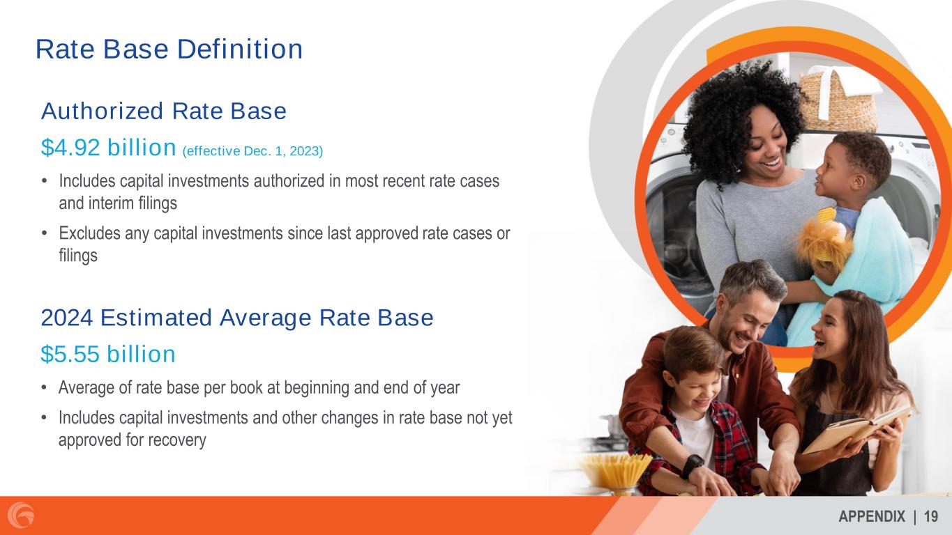APPENDIX | 18 Authorized Rate Base $1,475 $1,616 $1,726 $1,854 $2,067 2019 2020 2021 2022 2023 OKLAHOMA2 1 Kansas Gas Service’s most recent rate case, approved in February 2019, was settled without a determination of rate base and reflects Kansas Gas Service’s estimate of rate base contained within the settlement; these amounts are not necessarily indicative of current or future rate base. GSRS filing approved and new rate base effective Dec. 1, 2023. 2 Reflects authorized rate base as of Dec. 1, 2023. Amounts are not necessarily indicative of current or future rate bases. (M IL L IO N S ) $1,068 $1,133 $1,197 $1,261 $1,339 2019 2020 2021 2022 2023 KANSAS1,2 $986 $1,047 $1,239 $1,366 $1,510 2019 2020 2021 2022 2023 TEXAS2