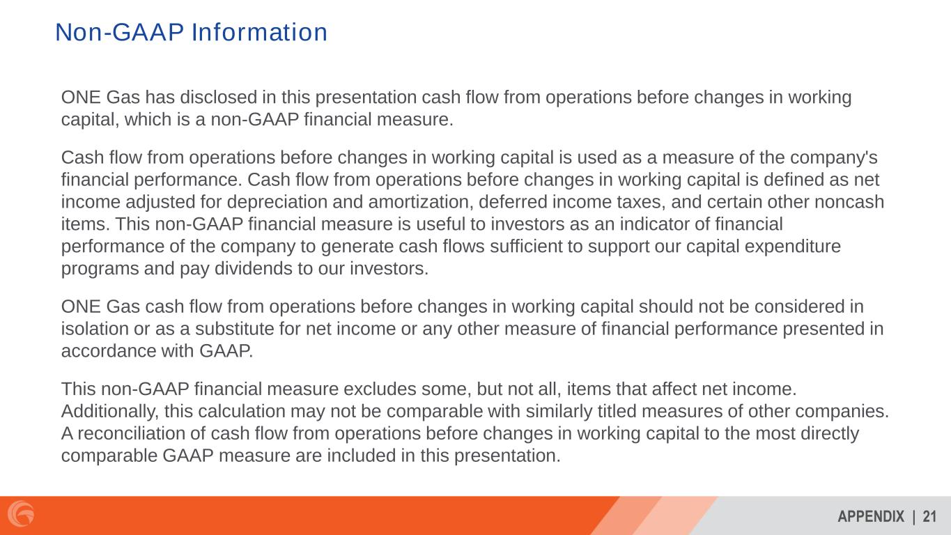 APPENDIX | 21 Non-GAAP Information ONE Gas has disclosed in this presentation cash flow from operations before changes in working capital, which is a non-GAAP financial measure. Cash flow from operations before changes in working capital is used as a measure of the company's financial performance. Cash flow from operations before changes in working capital is defined as net income adjusted for depreciation and amortization, deferred income taxes, and certain other noncash items. This non-GAAP financial measure is useful to investors as an indicator of financial performance of the company to generate cash flows sufficient to support our capital expenditure programs and pay dividends to our investors. ONE Gas cash flow from operations before changes in working capital should not be considered in isolation or as a substitute for net income or any other measure of financial performance presented in accordance with GAAP. This non-GAAP financial measure excludes some, but not all, items that affect net income. Additionally, this calculation may not be comparable with similarly titled measures of other companies. A reconciliation of cash flow from operations before changes in working capital to the most directly comparable GAAP measure are included in this presentation.