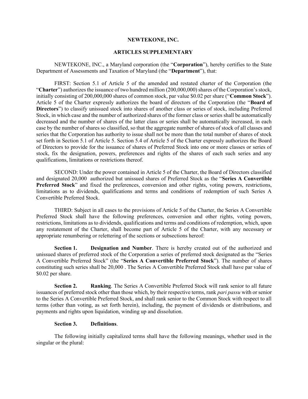 NEWTEKONE, INC. ARTICLES SUPPLEMENTARY NEWTEKONE, INC., a Maryland corporation (the “Corporation”), hereby certifies to the State Department of Assessments and Taxation of Maryland (the “Department”), that: FIRST: Section 5.1 of Article 5 of the amended and restated charter of the Corporation (the “Charter”) authorizes the issuance of two hundred million (200,000,000) shares of the Corporation’s stock, initially consisting of 200,000,000 shares of common stock, par value $0.02 per share (“Common Stock”). Article 5 of the Charter expressly authorizes the board of directors of the Corporation (the “Board of Directors”) to classify unissued stock into shares of another class or series of stock, including Preferred Stock, in which case and the number of authorized shares of the former class or series shall be automatically decreased and the number of shares of the latter class or series shall be automatically increased, in each case by the number of shares so classified, so that the aggregate number of shares of stock of all classes and series that the Corporation has authority to issue shall not be more than the total number of shares of stock set forth in Section 5.1 of Article 5. Section 5.4 of Article 5 of the Charter expressly authorizes the Board of Directors to provide for the issuance of shares of Preferred Stock into one or more classes or series of stock, fix the designation, powers, preferences and rights of the shares of each such series and any qualifications, limitations or restrictions thereof. SECOND: Under the power contained in Article 5 of the Charter, the Board of Directors classified and designated 20,000 authorized but unissued shares of Preferred Stock as the “Series A Convertible Preferred Stock” and fixed the preferences, conversion and other rights, voting powers, restrictions, limitations as to dividends, qualifications and terms and conditions of redemption of such Series A Convertible Preferred Stock. THIRD: Subject in all cases to the provisions of Article 5 of the Charter, the Series A Convertible Preferred Stock shall have the following preferences, conversion and other rights, voting powers, restrictions, limitations as to dividends, qualifications and terms and conditions of redemption, which, upon any restatement of the Charter, shall become part of Article 5 of the Charter, with any necessary or appropriate renumbering or relettering of the sections or subsections hereof: Section 1. Designation and Number. There is hereby created out of the authorized and unissued shares of preferred stock of the Corporation a series of preferred stock designated as the “Series A Convertible Preferred Stock” (the “Series A Convertible Preferred Stock”). The number of shares constituting such series shall be 20,000 . The Series A Convertible Preferred Stock shall have par value of $0.02 per share. Section 2. Ranking. The Series A Convertible Preferred Stock will rank senior to all future issuances of preferred stock other than those which, by their respective terms, rank pari passu with or senior to the Series A Convertible Preferred Stock, and shall rank senior to the Common Stock with respect to all terms (other than voting, as set forth herein), including, the payment of dividends or distributions, and payments and rights upon liquidation, winding up and dissolution. Section 3. Definitions. The following initially capitalized terms shall have the following meanings, whether used in the singular or the plural: