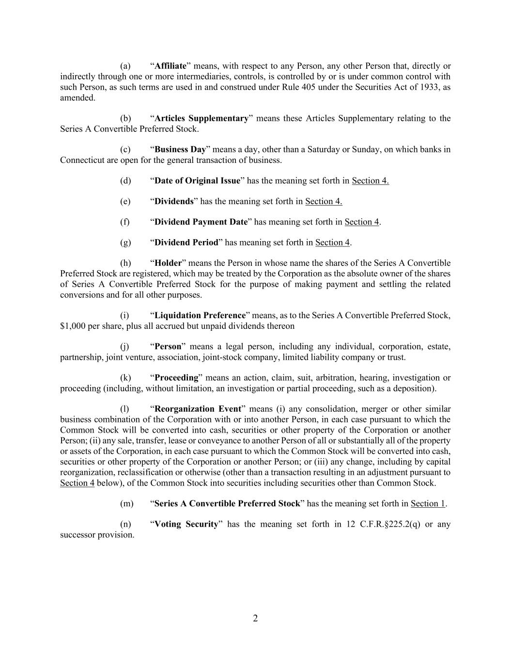 2 (a) “Affiliate” means, with respect to any Person, any other Person that, directly or indirectly through one or more intermediaries, controls, is controlled by or is under common control with such Person, as such terms are used in and construed under Rule 405 under the Securities Act of 1933, as amended. (b) “Articles Supplementary” means these Articles Supplementary relating to the Series A Convertible Preferred Stock. (c) “Business Day” means a day, other than a Saturday or Sunday, on which banks in Connecticut are open for the general transaction of business. (d) “Date of Original Issue” has the meaning set forth in Section 4. (e) “Dividends” has the meaning set forth in Section 4. (f) “Dividend Payment Date” has meaning set forth in Section 4. (g) “Dividend Period” has meaning set forth in Section 4. (h) “Holder” means the Person in whose name the shares of the Series A Convertible Preferred Stock are registered, which may be treated by the Corporation as the absolute owner of the shares of Series A Convertible Preferred Stock for the purpose of making payment and settling the related conversions and for all other purposes. (i) “Liquidation Preference” means, as to the Series A Convertible Preferred Stock, $1,000 per share, plus all accrued but unpaid dividends thereon (j) “Person” means a legal person, including any individual, corporation, estate, partnership, joint venture, association, joint-stock company, limited liability company or trust. (k) “Proceeding” means an action, claim, suit, arbitration, hearing, investigation or proceeding (including, without limitation, an investigation or partial proceeding, such as a deposition). (l) “Reorganization Event” means (i) any consolidation, merger or other similar business combination of the Corporation with or into another Person, in each case pursuant to which the Common Stock will be converted into cash, securities or other property of the Corporation or another Person; (ii) any sale, transfer, lease or conveyance to another Person of all or substantially all of the property or assets of the Corporation, in each case pursuant to which the Common Stock will be converted into cash, securities or other property of the Corporation or another Person; or (iii) any change, including by capital reorganization, reclassification or otherwise (other than a transaction resulting in an adjustment pursuant to Section 4 below), of the Common Stock into securities including securities other than Common Stock. (m) “Series A Convertible Preferred Stock” has the meaning set forth in Section 1. (n) “Voting Security” has the meaning set forth in 12 C.F.R.§225.2(q) or any successor provision.