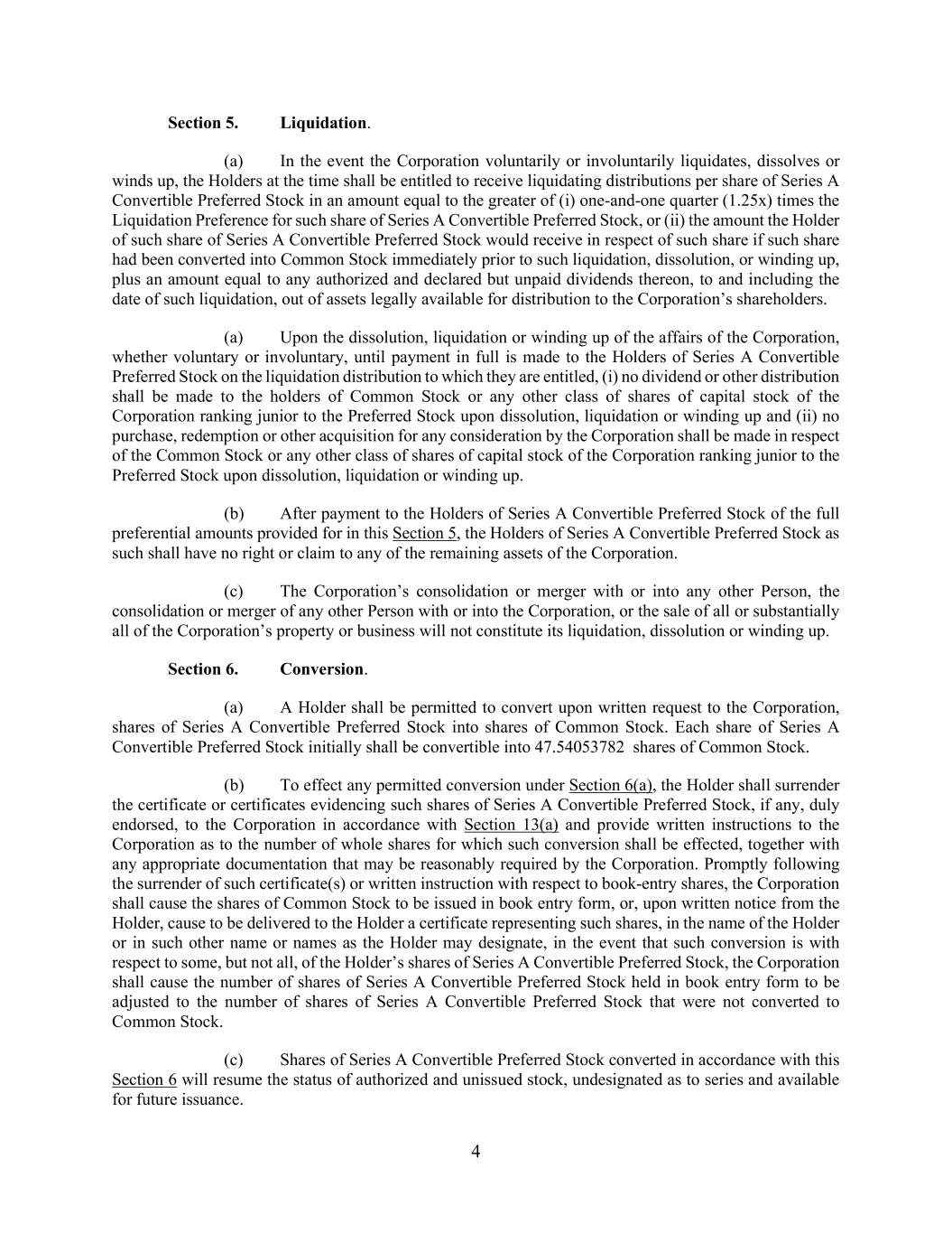 4 Section 5. Liquidation. (a) In the event the Corporation voluntarily or involuntarily liquidates, dissolves or winds up, the Holders at the time shall be entitled to receive liquidating distributions per share of Series A Convertible Preferred Stock in an amount equal to the greater of (i) one-and-one quarter (1.25x) times the Liquidation Preference for such share of Series A Convertible Preferred Stock, or (ii) the amount the Holder of such share of Series A Convertible Preferred Stock would receive in respect of such share if such share had been converted into Common Stock immediately prior to such liquidation, dissolution, or winding up, plus an amount equal to any authorized and declared but unpaid dividends thereon, to and including the date of such liquidation, out of assets legally available for distribution to the Corporation’s shareholders. (a) Upon the dissolution, liquidation or winding up of the affairs of the Corporation, whether voluntary or involuntary, until payment in full is made to the Holders of Series A Convertible Preferred Stock on the liquidation distribution to which they are entitled, (i) no dividend or other distribution shall be made to the holders of Common Stock or any other class of shares of capital stock of the Corporation ranking junior to the Preferred Stock upon dissolution, liquidation or winding up and (ii) no purchase, redemption or other acquisition for any consideration by the Corporation shall be made in respect of the Common Stock or any other class of shares of capital stock of the Corporation ranking junior to the Preferred Stock upon dissolution, liquidation or winding up. (b) After payment to the Holders of Series A Convertible Preferred Stock of the full preferential amounts provided for in this Section 5, the Holders of Series A Convertible Preferred Stock as such shall have no right or claim to any of the remaining assets of the Corporation. (c) The Corporation’s consolidation or merger with or into any other Person, the consolidation or merger of any other Person with or into the Corporation, or the sale of all or substantially all of the Corporation’s property or business will not constitute its liquidation, dissolution or winding up. Section 6. Conversion. (a) A Holder shall be permitted to convert upon written request to the Corporation, shares of Series A Convertible Preferred Stock into shares of Common Stock. Each share of Series A Convertible Preferred Stock initially shall be convertible into 47.54053782 shares of Common Stock. (b) To effect any permitted conversion under Section 6(a), the Holder shall surrender the certificate or certificates evidencing such shares of Series A Convertible Preferred Stock, if any, duly endorsed, to the Corporation in accordance with Section 13(a) and provide written instructions to the Corporation as to the number of whole shares for which such conversion shall be effected, together with any appropriate documentation that may be reasonably required by the Corporation. Promptly following the surrender of such certificate(s) or written instruction with respect to book-entry shares, the Corporation shall cause the shares of Common Stock to be issued in book entry form, or, upon written notice from the Holder, cause to be delivered to the Holder a certificate representing such shares, in the name of the Holder or in such other name or names as the Holder may designate, in the event that such conversion is with respect to some, but not all, of the Holder’s shares of Series A Convertible Preferred Stock, the Corporation shall cause the number of shares of Series A Convertible Preferred Stock held in book entry form to be adjusted to the number of shares of Series A Convertible Preferred Stock that were not converted to Common Stock. (c) Shares of Series A Convertible Preferred Stock converted in accordance with this Section 6 will resume the status of authorized and unissued stock, undesignated as to series and available for future issuance.