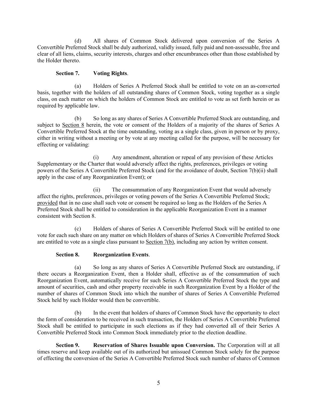 5 (d) All shares of Common Stock delivered upon conversion of the Series A Convertible Preferred Stock shall be duly authorized, validly issued, fully paid and non-assessable, free and clear of all liens, claims, security interests, charges and other encumbrances other than those established by the Holder thereto. Section 7. Voting Rights. (a) Holders of Series A Preferred Stock shall be entitled to vote on an as-converted basis, together with the holders of all outstanding shares of Common Stock, voting together as a single class, on each matter on which the holders of Common Stock are entitled to vote as set forth herein or as required by applicable law. (b) So long as any shares of Series A Convertible Preferred Stock are outstanding, and subject to Section 8 herein, the vote or consent of the Holders of a majority of the shares of Series A Convertible Preferred Stock at the time outstanding, voting as a single class, given in person or by proxy, either in writing without a meeting or by vote at any meeting called for the purpose, will be necessary for effecting or validating: (i) Any amendment, alteration or repeal of any provision of these Articles Supplementary or the Charter that would adversely affect the rights, preferences, privileges or voting powers of the Series A Convertible Preferred Stock (and for the avoidance of doubt, Section 7(b)(ii) shall apply in the case of any Reorganization Event); or (ii) The consummation of any Reorganization Event that would adversely affect the rights, preferences, privileges or voting powers of the Series A Convertible Preferred Stock; provided that in no case shall such vote or consent be required so long as the Holders of the Series A Preferred Stock shall be entitled to consideration in the applicable Reorganization Event in a manner consistent with Section 8. (c) Holders of shares of Series A Convertible Preferred Stock will be entitled to one vote for each such share on any matter on which Holders of shares of Series A Convertible Preferred Stock are entitled to vote as a single class pursuant to Section 7(b), including any action by written consent. Section 8. Reorganization Events. (a) So long as any shares of Series A Convertible Preferred Stock are outstanding, if there occurs a Reorganization Event, then a Holder shall, effective as of the consummation of such Reorganization Event, automatically receive for such Series A Convertible Preferred Stock the type and amount of securities, cash and other property receivable in such Reorganization Event by a Holder of the number of shares of Common Stock into which the number of shares of Series A Convertible Preferred Stock held by such Holder would then be convertible. (b) In the event that holders of shares of Common Stock have the opportunity to elect the form of consideration to be received in such transaction, the Holders of Series A Convertible Preferred Stock shall be entitled to participate in such elections as if they had converted all of their Series A Convertible Preferred Stock into Common Stock immediately prior to the election deadline. Section 9. Reservation of Shares Issuable upon Conversion. The Corporation will at all times reserve and keep available out of its authorized but unissued Common Stock solely for the purpose of effecting the conversion of the Series A Convertible Preferred Stock such number of shares of Common