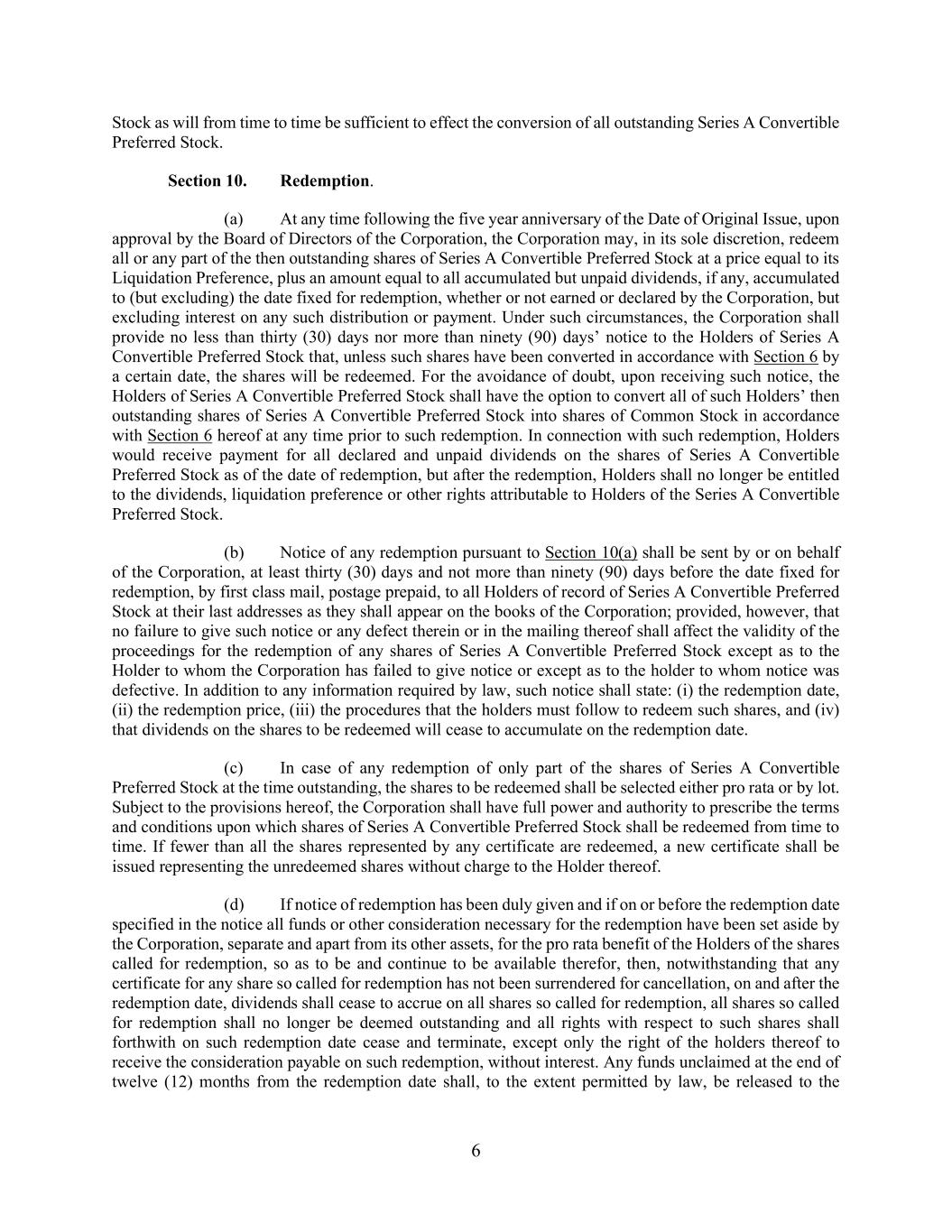 6 Stock as will from time to time be sufficient to effect the conversion of all outstanding Series A Convertible Preferred Stock. Section 10. Redemption. (a) At any time following the five year anniversary of the Date of Original Issue, upon approval by the Board of Directors of the Corporation, the Corporation may, in its sole discretion, redeem all or any part of the then outstanding shares of Series A Convertible Preferred Stock at a price equal to its Liquidation Preference, plus an amount equal to all accumulated but unpaid dividends, if any, accumulated to (but excluding) the date fixed for redemption, whether or not earned or declared by the Corporation, but excluding interest on any such distribution or payment. Under such circumstances, the Corporation shall provide no less than thirty (30) days nor more than ninety (90) days’ notice to the Holders of Series A Convertible Preferred Stock that, unless such shares have been converted in accordance with Section 6 by a certain date, the shares will be redeemed. For the avoidance of doubt, upon receiving such notice, the Holders of Series A Convertible Preferred Stock shall have the option to convert all of such Holders’ then outstanding shares of Series A Convertible Preferred Stock into shares of Common Stock in accordance with Section 6 hereof at any time prior to such redemption. In connection with such redemption, Holders would receive payment for all declared and unpaid dividends on the shares of Series A Convertible Preferred Stock as of the date of redemption, but after the redemption, Holders shall no longer be entitled to the dividends, liquidation preference or other rights attributable to Holders of the Series A Convertible Preferred Stock. (b) Notice of any redemption pursuant to Section 10(a) shall be sent by or on behalf of the Corporation, at least thirty (30) days and not more than ninety (90) days before the date fixed for redemption, by first class mail, postage prepaid, to all Holders of record of Series A Convertible Preferred Stock at their last addresses as they shall appear on the books of the Corporation; provided, however, that no failure to give such notice or any defect therein or in the mailing thereof shall affect the validity of the proceedings for the redemption of any shares of Series A Convertible Preferred Stock except as to the Holder to whom the Corporation has failed to give notice or except as to the holder to whom notice was defective. In addition to any information required by law, such notice shall state: (i) the redemption date, (ii) the redemption price, (iii) the procedures that the holders must follow to redeem such shares, and (iv) that dividends on the shares to be redeemed will cease to accumulate on the redemption date. (c) In case of any redemption of only part of the shares of Series A Convertible Preferred Stock at the time outstanding, the shares to be redeemed shall be selected either pro rata or by lot. Subject to the provisions hereof, the Corporation shall have full power and authority to prescribe the terms and conditions upon which shares of Series A Convertible Preferred Stock shall be redeemed from time to time. If fewer than all the shares represented by any certificate are redeemed, a new certificate shall be issued representing the unredeemed shares without charge to the Holder thereof. (d) If notice of redemption has been duly given and if on or before the redemption date specified in the notice all funds or other consideration necessary for the redemption have been set aside by the Corporation, separate and apart from its other assets, for the pro rata benefit of the Holders of the shares called for redemption, so as to be and continue to be available therefor, then, notwithstanding that any certificate for any share so called for redemption has not been surrendered for cancellation, on and after the redemption date, dividends shall cease to accrue on all shares so called for redemption, all shares so called for redemption shall no longer be deemed outstanding and all rights with respect to such shares shall forthwith on such redemption date cease and terminate, except only the right of the holders thereof to receive the consideration payable on such redemption, without interest. Any funds unclaimed at the end of twelve (12) months from the redemption date shall, to the extent permitted by law, be released to the