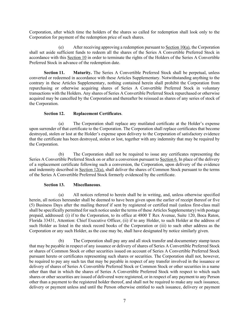 7 Corporation, after which time the holders of the shares so called for redemption shall look only to the Corporation for payment of the redemption price of such shares. (e) After receiving approving a redemption pursuant to Section 10(a), the Corporation shall set aside sufficient funds to redeem all the shares of the Series A Convertible Preferred Stock in accordance with this Section 10 in order to terminate the rights of the Holders of the Series A Convertible Preferred Stock in advance of the redemption date. Section 11. Maturity. The Series A Convertible Preferred Stock shall be perpetual, unless converted or redeemed in accordance with these Articles Supplementary. Notwithstanding anything to the contrary in these Articles Supplementary, nothing contained herein shall prohibit the Corporation from repurchasing or otherwise acquiring shares of Series A Convertible Preferred Stock in voluntary transactions with the Holders. Any shares of Series A Convertible Preferred Stock repurchased or otherwise acquired may be cancelled by the Corporation and thereafter be reissued as shares of any series of stock of the Corporation. Section 12. Replacement Certificates. (a) The Corporation shall replace any mutilated certificate at the Holder’s expense upon surrender of that certificate to the Corporation. The Corporation shall replace certificates that become destroyed, stolen or lost at the Holder’s expense upon delivery to the Corporation of satisfactory evidence that the certificate has been destroyed, stolen or lost, together with any indemnity that may be required by the Corporation. (b) The Corporation shall not be required to issue any certificates representing the Series A Convertible Preferred Stock on or after a conversion pursuant to Section 6. In place of the delivery of a replacement certificate following such a conversion, the Corporation, upon delivery of the evidence and indemnity described in Section 12(a), shall deliver the shares of Common Stock pursuant to the terms of the Series A Convertible Preferred Stock formerly evidenced by the certificate. Section 13. Miscellaneous. (a) All notices referred to herein shall be in writing, and, unless otherwise specified herein, all notices hereunder shall be deemed to have been given upon the earlier of receipt thereof or five (5) Business Days after the mailing thereof if sent by registered or certified mail (unless first-class mail shall be specifically permitted for such notice under the terms of these Articles Supplementary) with postage prepaid, addressed: (i) if to the Corporation, to its office at 4800 T Rex Avenue, Suite 120, Boca Raton, Florida 33431, Attention: Chief Executive Officer, (ii) if to any Holder, to such Holder at the address of such Holder as listed in the stock record books of the Corporation or (iii) to such other address as the Corporation or any such Holder, as the case may be, shall have designated by notice similarly given. (b) The Corporation shall pay any and all stock transfer and documentary stamp taxes that may be payable in respect of any issuance or delivery of shares of Series A Convertible Preferred Stock or shares of Common Stock or other securities issued on account of Series A Convertible Preferred Stock pursuant hereto or certificates representing such shares or securities. The Corporation shall not, however, be required to pay any such tax that may be payable in respect of any transfer involved in the issuance or delivery of shares of Series A Convertible Preferred Stock or Common Stock or other securities in a name other than that in which the shares of Series A Convertible Preferred Stock with respect to which such shares or other securities are issued of delivered were registered, or in respect of any payment to any Person other than a payment to the registered holder thereof, and shall not be required to make any such issuance, delivery or payment unless and until the Person otherwise entitled to such issuance, delivery or payment