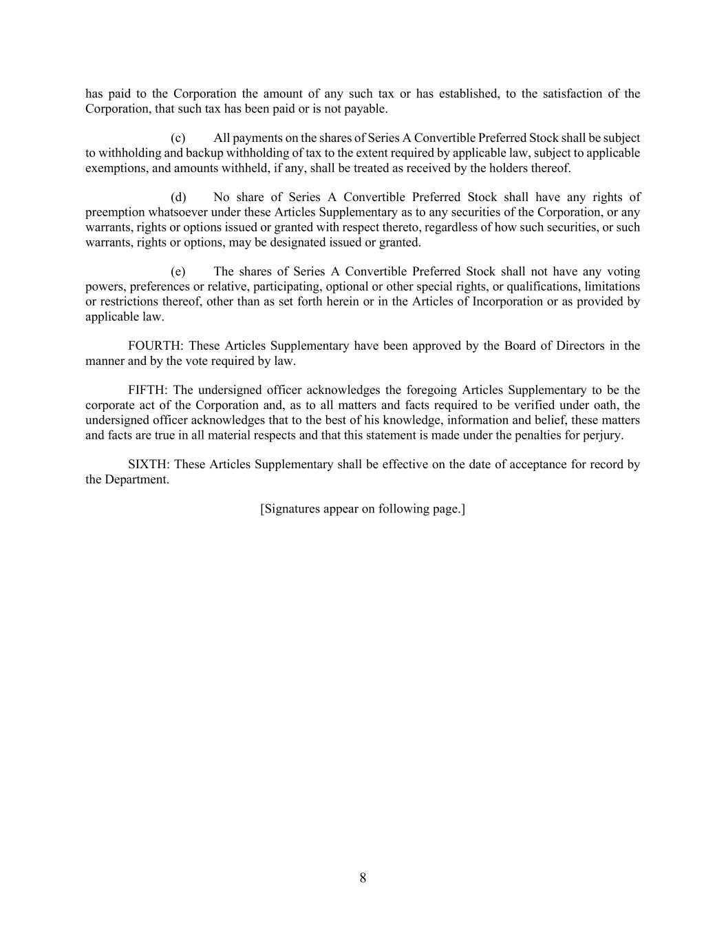 8 has paid to the Corporation the amount of any such tax or has established, to the satisfaction of the Corporation, that such tax has been paid or is not payable. (c) All payments on the shares of Series A Convertible Preferred Stock shall be subject to withholding and backup withholding of tax to the extent required by applicable law, subject to applicable exemptions, and amounts withheld, if any, shall be treated as received by the holders thereof. (d) No share of Series A Convertible Preferred Stock shall have any rights of preemption whatsoever under these Articles Supplementary as to any securities of the Corporation, or any warrants, rights or options issued or granted with respect thereto, regardless of how such securities, or such warrants, rights or options, may be designated issued or granted. (e) The shares of Series A Convertible Preferred Stock shall not have any voting powers, preferences or relative, participating, optional or other special rights, or qualifications, limitations or restrictions thereof, other than as set forth herein or in the Articles of Incorporation or as provided by applicable law. FOURTH: These Articles Supplementary have been approved by the Board of Directors in the manner and by the vote required by law. FIFTH: The undersigned officer acknowledges the foregoing Articles Supplementary to be the corporate act of the Corporation and, as to all matters and facts required to be verified under oath, the undersigned officer acknowledges that to the best of his knowledge, information and belief, these matters and facts are true in all material respects and that this statement is made under the penalties for perjury. SIXTH: These Articles Supplementary shall be effective on the date of acceptance for record by the Department. [Signatures appear on following page.]