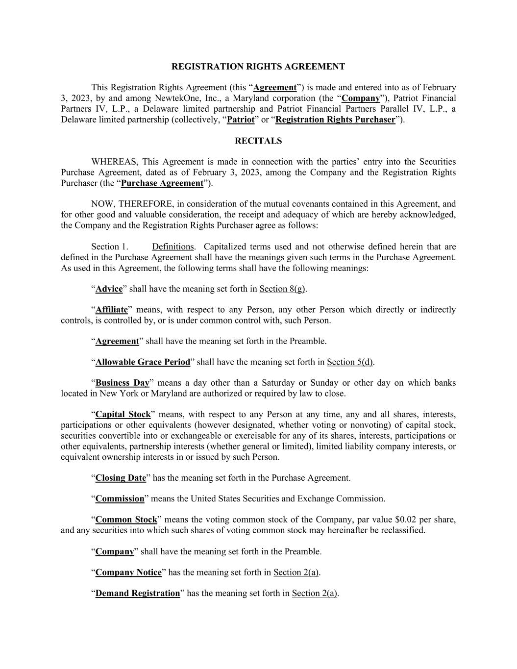 REGISTRATION RIGHTS AGREEMENT This Registration Rights Agreement (this “Agreement”) is made and entered into as of February 3, 2023, by and among NewtekOne, Inc., a Maryland corporation (the “Company”), Patriot Financial Partners IV, L.P., a Delaware limited partnership and Patriot Financial Partners Parallel IV, L.P., a Delaware limited partnership (collectively, “Patriot” or “Registration Rights Purchaser”). RECITALS WHEREAS, This Agreement is made in connection with the parties’ entry into the Securities Purchase Agreement, dated as of February 3, 2023, among the Company and the Registration Rights Purchaser (the “Purchase Agreement”). NOW, THEREFORE, in consideration of the mutual covenants contained in this Agreement, and for other good and valuable consideration, the receipt and adequacy of which are hereby acknowledged, the Company and the Registration Rights Purchaser agree as follows: Section 1. Definitions. Capitalized terms used and not otherwise defined herein that are defined in the Purchase Agreement shall have the meanings given such terms in the Purchase Agreement. As used in this Agreement, the following terms shall have the following meanings: “Advice” shall have the meaning set forth in Section 8(g). “Affiliate” means, with respect to any Person, any other Person which directly or indirectly controls, is controlled by, or is under common control with, such Person. “Agreement” shall have the meaning set forth in the Preamble. “Allowable Grace Period” shall have the meaning set forth in Section 5(d). “Business Day” means a day other than a Saturday or Sunday or other day on which banks located in New York or Maryland are authorized or required by law to close. “Capital Stock” means, with respect to any Person at any time, any and all shares, interests, participations or other equivalents (however designated, whether voting or nonvoting) of capital stock, securities convertible into or exchangeable or exercisable for any of its shares, interests, participations or other equivalents, partnership interests (whether general or limited), limited liability company interests, or equivalent ownership interests in or issued by such Person. “Closing Date” has the meaning set forth in the Purchase Agreement. “Commission” means the United States Securities and Exchange Commission. “Common Stock” means the voting common stock of the Company, par value $0.02 per share, and any securities into which such shares of voting common stock may hereinafter be reclassified. “Company” shall have the meaning set forth in the Preamble. “Company Notice” has the meaning set forth in Section 2(a). “Demand Registration” has the meaning set forth in Section 2(a).
