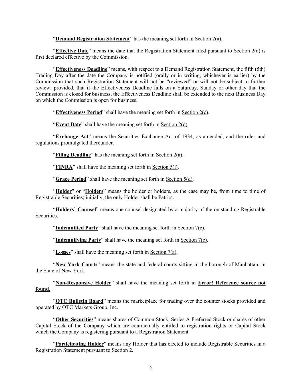 2 “Demand Registration Statement” has the meaning set forth in Section 2(a). “Effective Date” means the date that the Registration Statement filed pursuant to Section 2(a) is first declared effective by the Commission. “Effectiveness Deadline” means, with respect to a Demand Registration Statement, the fifth (5th) Trading Day after the date the Company is notified (orally or in writing, whichever is earlier) by the Commission that such Registration Statement will not be “reviewed” or will not be subject to further review; provided, that if the Effectiveness Deadline falls on a Saturday, Sunday or other day that the Commission is closed for business, the Effectiveness Deadline shall be extended to the next Business Day on which the Commission is open for business. “Effectiveness Period” shall have the meaning set forth in Section 2(c). “Event Date” shall have the meaning set forth in Section 2(d). “Exchange Act” means the Securities Exchange Act of 1934, as amended, and the rules and regulations promulgated thereunder. “Filing Deadline” has the meaning set forth in Section 2(a). “FINRA” shall have the meaning set forth in Section 5(l). “Grace Period” shall have the meaning set forth in Section 5(d). “Holder” or “Holders” means the holder or holders, as the case may be, from time to time of Registrable Securities; initially, the only Holder shall be Patriot. “Holders’ Counsel” means one counsel designated by a majority of the outstanding Registrable Securities. “Indemnified Party” shall have the meaning set forth in Section 7(c). “Indemnifying Party” shall have the meaning set forth in Section 7(c). “Losses” shall have the meaning set forth in Section 7(a). “New York Courts” means the state and federal courts sitting in the borough of Manhattan, in the State of New York. “Non-Responsive Holder” shall have the meaning set forth in Error! Reference source not found.. “OTC Bulletin Board” means the marketplace for trading over the counter stocks provided and operated by OTC Markets Group, Inc. “Other Securities” means shares of Common Stock, Series A Preferred Stock or shares of other Capital Stock of the Company which are contractually entitled to registration rights or Capital Stock which the Company is registering pursuant to a Registration Statement. “Participating Holder” means any Holder that has elected to include Registrable Securities in a Registration Statement pursuant to Section 2.