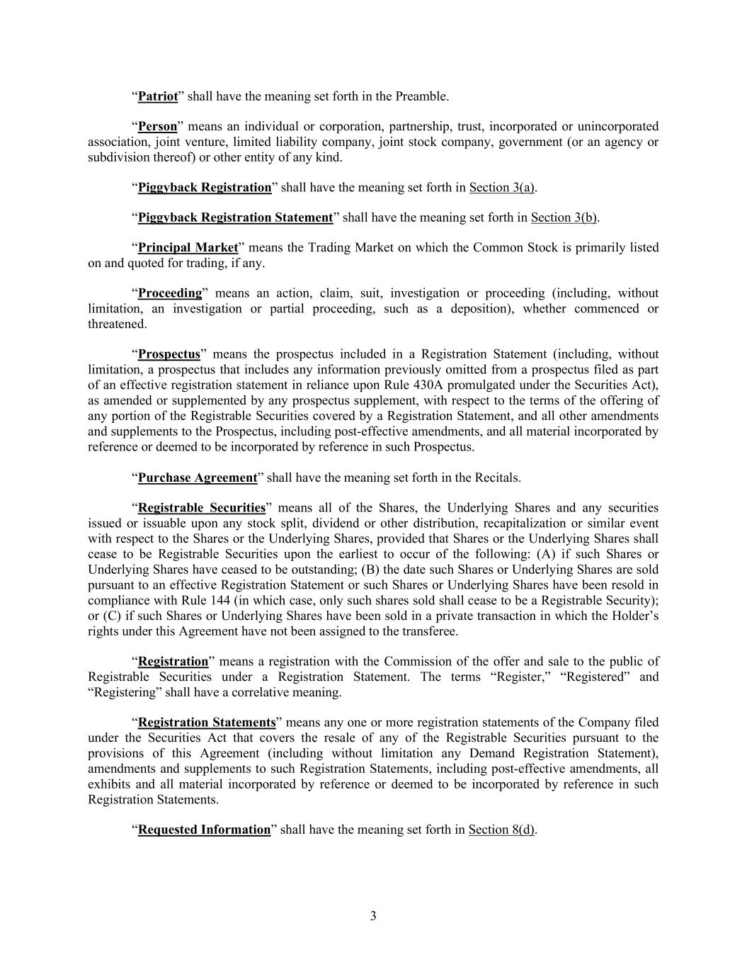 3 “Patriot” shall have the meaning set forth in the Preamble. “Person” means an individual or corporation, partnership, trust, incorporated or unincorporated association, joint venture, limited liability company, joint stock company, government (or an agency or subdivision thereof) or other entity of any kind. “Piggyback Registration” shall have the meaning set forth in Section 3(a). “Piggyback Registration Statement” shall have the meaning set forth in Section 3(b). “Principal Market” means the Trading Market on which the Common Stock is primarily listed on and quoted for trading, if any. “Proceeding” means an action, claim, suit, investigation or proceeding (including, without limitation, an investigation or partial proceeding, such as a deposition), whether commenced or threatened. “Prospectus” means the prospectus included in a Registration Statement (including, without limitation, a prospectus that includes any information previously omitted from a prospectus filed as part of an effective registration statement in reliance upon Rule 430A promulgated under the Securities Act), as amended or supplemented by any prospectus supplement, with respect to the terms of the offering of any portion of the Registrable Securities covered by a Registration Statement, and all other amendments and supplements to the Prospectus, including post-effective amendments, and all material incorporated by reference or deemed to be incorporated by reference in such Prospectus. “Purchase Agreement” shall have the meaning set forth in the Recitals. “Registrable Securities” means all of the Shares, the Underlying Shares and any securities issued or issuable upon any stock split, dividend or other distribution, recapitalization or similar event with respect to the Shares or the Underlying Shares, provided that Shares or the Underlying Shares shall cease to be Registrable Securities upon the earliest to occur of the following: (A) if such Shares or Underlying Shares have ceased to be outstanding; (B) the date such Shares or Underlying Shares are sold pursuant to an effective Registration Statement or such Shares or Underlying Shares have been resold in compliance with Rule 144 (in which case, only such shares sold shall cease to be a Registrable Security); or (C) if such Shares or Underlying Shares have been sold in a private transaction in which the Holder’s rights under this Agreement have not been assigned to the transferee. “Registration” means a registration with the Commission of the offer and sale to the public of Registrable Securities under a Registration Statement. The terms “Register,” “Registered” and “Registering” shall have a correlative meaning. “Registration Statements” means any one or more registration statements of the Company filed under the Securities Act that covers the resale of any of the Registrable Securities pursuant to the provisions of this Agreement (including without limitation any Demand Registration Statement), amendments and supplements to such Registration Statements, including post-effective amendments, all exhibits and all material incorporated by reference or deemed to be incorporated by reference in such Registration Statements. “Requested Information” shall have the meaning set forth in Section 8(d).