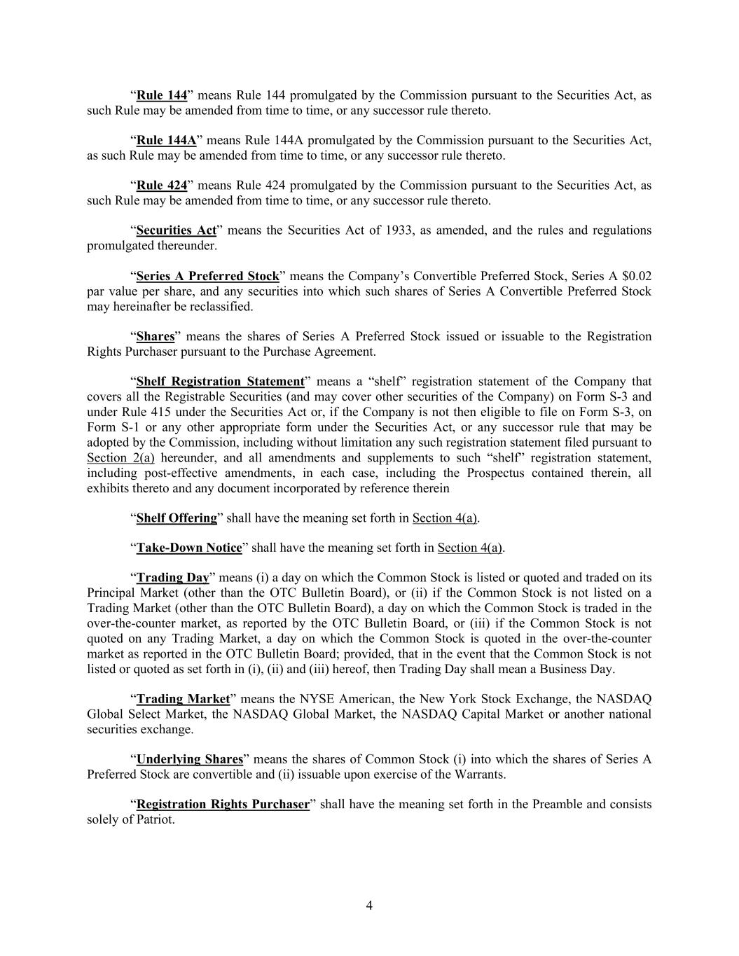 4 “Rule 144” means Rule 144 promulgated by the Commission pursuant to the Securities Act, as such Rule may be amended from time to time, or any successor rule thereto. “Rule 144A” means Rule 144A promulgated by the Commission pursuant to the Securities Act, as such Rule may be amended from time to time, or any successor rule thereto. “Rule 424” means Rule 424 promulgated by the Commission pursuant to the Securities Act, as such Rule may be amended from time to time, or any successor rule thereto. “Securities Act” means the Securities Act of 1933, as amended, and the rules and regulations promulgated thereunder. “Series A Preferred Stock” means the Company’s Convertible Preferred Stock, Series A $0.02 par value per share, and any securities into which such shares of Series A Convertible Preferred Stock may hereinafter be reclassified. “Shares” means the shares of Series A Preferred Stock issued or issuable to the Registration Rights Purchaser pursuant to the Purchase Agreement. “Shelf Registration Statement” means a “shelf” registration statement of the Company that covers all the Registrable Securities (and may cover other securities of the Company) on Form S-3 and under Rule 415 under the Securities Act or, if the Company is not then eligible to file on Form S-3, on Form S-1 or any other appropriate form under the Securities Act, or any successor rule that may be adopted by the Commission, including without limitation any such registration statement filed pursuant to Section 2(a) hereunder, and all amendments and supplements to such “shelf” registration statement, including post-effective amendments, in each case, including the Prospectus contained therein, all exhibits thereto and any document incorporated by reference therein “Shelf Offering” shall have the meaning set forth in Section 4(a). “Take-Down Notice” shall have the meaning set forth in Section 4(a). “Trading Day” means (i) a day on which the Common Stock is listed or quoted and traded on its Principal Market (other than the OTC Bulletin Board), or (ii) if the Common Stock is not listed on a Trading Market (other than the OTC Bulletin Board), a day on which the Common Stock is traded in the over-the-counter market, as reported by the OTC Bulletin Board, or (iii) if the Common Stock is not quoted on any Trading Market, a day on which the Common Stock is quoted in the over-the-counter market as reported in the OTC Bulletin Board; provided, that in the event that the Common Stock is not listed or quoted as set forth in (i), (ii) and (iii) hereof, then Trading Day shall mean a Business Day. “Trading Market” means the NYSE American, the New York Stock Exchange, the NASDAQ Global Select Market, the NASDAQ Global Market, the NASDAQ Capital Market or another national securities exchange. “Underlying Shares” means the shares of Common Stock (i) into which the shares of Series A Preferred Stock are convertible and (ii) issuable upon exercise of the Warrants. “Registration Rights Purchaser” shall have the meaning set forth in the Preamble and consists solely of Patriot.