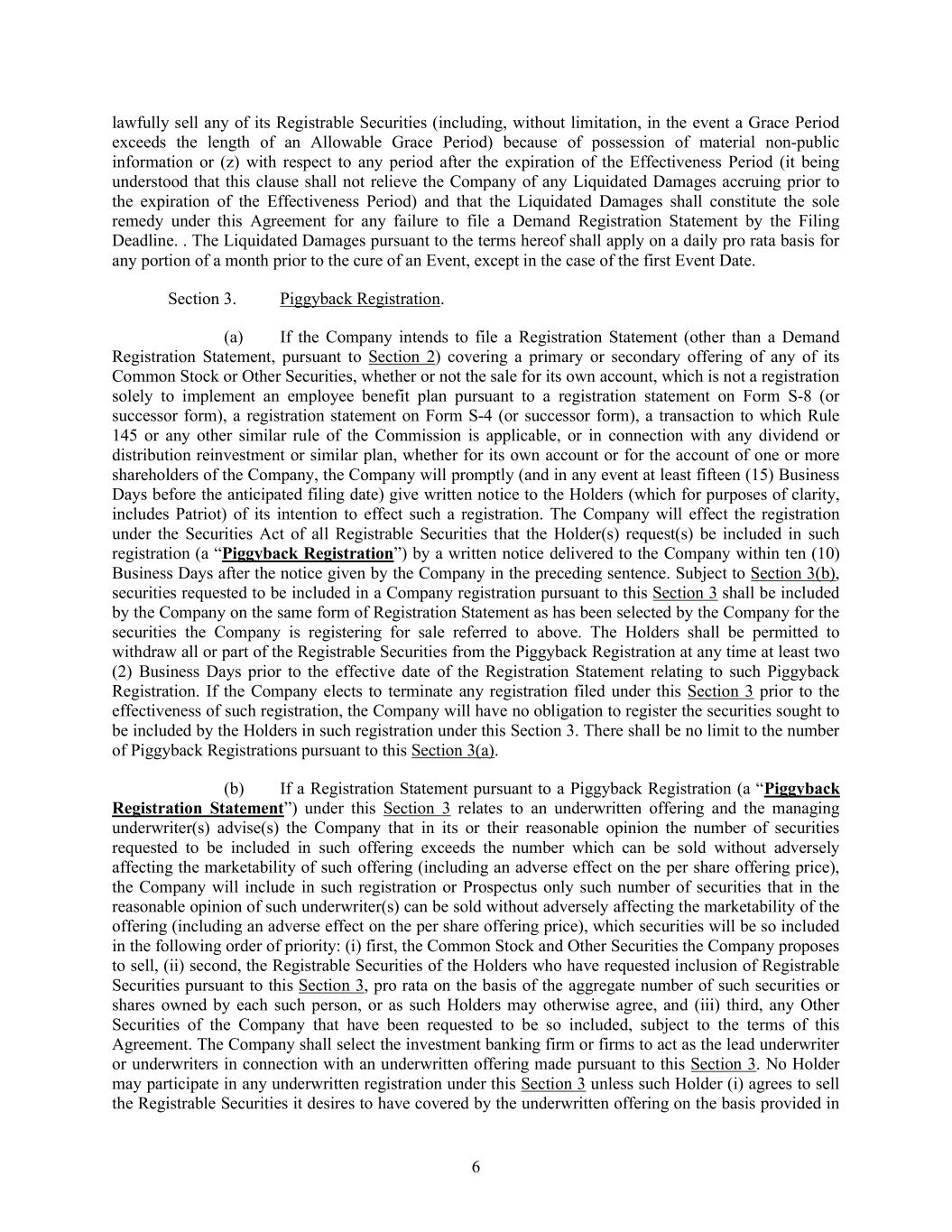 6 lawfully sell any of its Registrable Securities (including, without limitation, in the event a Grace Period exceeds the length of an Allowable Grace Period) because of possession of material non-public information or (z) with respect to any period after the expiration of the Effectiveness Period (it being understood that this clause shall not relieve the Company of any Liquidated Damages accruing prior to the expiration of the Effectiveness Period) and that the Liquidated Damages shall constitute the sole remedy under this Agreement for any failure to file a Demand Registration Statement by the Filing Deadline. . The Liquidated Damages pursuant to the terms hereof shall apply on a daily pro rata basis for any portion of a month prior to the cure of an Event, except in the case of the first Event Date. Section 3. Piggyback Registration. (a) If the Company intends to file a Registration Statement (other than a Demand Registration Statement, pursuant to Section 2) covering a primary or secondary offering of any of its Common Stock or Other Securities, whether or not the sale for its own account, which is not a registration solely to implement an employee benefit plan pursuant to a registration statement on Form S-8 (or successor form), a registration statement on Form S-4 (or successor form), a transaction to which Rule 145 or any other similar rule of the Commission is applicable, or in connection with any dividend or distribution reinvestment or similar plan, whether for its own account or for the account of one or more shareholders of the Company, the Company will promptly (and in any event at least fifteen (15) Business Days before the anticipated filing date) give written notice to the Holders (which for purposes of clarity, includes Patriot) of its intention to effect such a registration. The Company will effect the registration under the Securities Act of all Registrable Securities that the Holder(s) request(s) be included in such registration (a “Piggyback Registration”) by a written notice delivered to the Company within ten (10) Business Days after the notice given by the Company in the preceding sentence. Subject to Section 3(b), securities requested to be included in a Company registration pursuant to this Section 3 shall be included by the Company on the same form of Registration Statement as has been selected by the Company for the securities the Company is registering for sale referred to above. The Holders shall be permitted to withdraw all or part of the Registrable Securities from the Piggyback Registration at any time at least two (2) Business Days prior to the effective date of the Registration Statement relating to such Piggyback Registration. If the Company elects to terminate any registration filed under this Section 3 prior to the effectiveness of such registration, the Company will have no obligation to register the securities sought to be included by the Holders in such registration under this Section 3. There shall be no limit to the number of Piggyback Registrations pursuant to this Section 3(a). (b) If a Registration Statement pursuant to a Piggyback Registration (a “Piggyback Registration Statement”) under this Section 3 relates to an underwritten offering and the managing underwriter(s) advise(s) the Company that in its or their reasonable opinion the number of securities requested to be included in such offering exceeds the number which can be sold without adversely affecting the marketability of such offering (including an adverse effect on the per share offering price), the Company will include in such registration or Prospectus only such number of securities that in the reasonable opinion of such underwriter(s) can be sold without adversely affecting the marketability of the offering (including an adverse effect on the per share offering price), which securities will be so included in the following order of priority: (i) first, the Common Stock and Other Securities the Company proposes to sell, (ii) second, the Registrable Securities of the Holders who have requested inclusion of Registrable Securities pursuant to this Section 3, pro rata on the basis of the aggregate number of such securities or shares owned by each such person, or as such Holders may otherwise agree, and (iii) third, any Other Securities of the Company that have been requested to be so included, subject to the terms of this Agreement. The Company shall select the investment banking firm or firms to act as the lead underwriter or underwriters in connection with an underwritten offering made pursuant to this Section 3. No Holder may participate in any underwritten registration under this Section 3 unless such Holder (i) agrees to sell the Registrable Securities it desires to have covered by the underwritten offering on the basis provided in