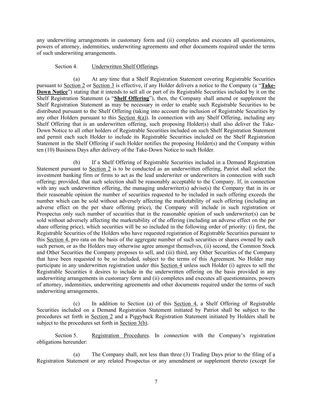 7 any underwriting arrangements in customary form and (ii) completes and executes all questionnaires, powers of attorney, indemnities, underwriting agreements and other documents required under the terms of such underwriting arrangements. Section 4. Underwritten Shelf Offerings. (a) At any time that a Shelf Registration Statement covering Registrable Securities pursuant to Section 2 or Section 3 is effective, if any Holder delivers a notice to the Company (a “Take- Down Notice”) stating that it intends to sell all or part of its Registrable Securities included by it on the Shelf Registration Statement (a “Shelf Offering”), then, the Company shall amend or supplement the Shelf Registration Statement as may be necessary in order to enable such Registrable Securities to be distributed pursuant to the Shelf Offering (taking into account the inclusion of Registrable Securities by any other Holders pursuant to this Section 4(a)). In connection with any Shelf Offering, including any Shelf Offering that is an underwritten offering, such proposing Holder(s) shall also deliver the Take- Down Notice to all other holders of Registrable Securities included on such Shelf Registration Statement and permit each such Holder to include its Registrable Securities included on the Shelf Registration Statement in the Shelf Offering if such Holder notifies the proposing Holder(s) and the Company within ten (10) Business Days after delivery of the Take-Down Notice to such Holder. (b) If a Shelf Offering of Registrable Securities included in a Demand Registration Statement pursuant to Section 2 is to be conducted as an underwritten offering, Patriot shall select the investment banking firm or firms to act as the lead underwriter or underwriters in connection with such offering; provided, that such selection shall be reasonably acceptable to the Company. If, in connection with any such underwritten offering, the managing underwriter(s) advise(s) the Company that in its or their reasonable opinion the number of securities requested to be included in such offering exceeds the number which can be sold without adversely affecting the marketability of such offering (including an adverse effect on the per share offering price), the Company will include in such registration or Prospectus only such number of securities that in the reasonable opinion of such underwriter(s) can be sold without adversely affecting the marketability of the offering (including an adverse effect on the per share offering price), which securities will be so included in the following order of priority: (i) first, the Registrable Securities of the Holders who have requested registration of Registrable Securities pursuant to this Section 4, pro rata on the basis of the aggregate number of such securities or shares owned by each such person, or as the Holders may otherwise agree amongst themselves, (ii) second, the Common Stock and Other Securities the Company proposes to sell, and (iii) third, any Other Securities of the Company that have been requested to be so included, subject to the terms of this Agreement. No Holder may participate in any underwritten registration under this Section 4 unless such Holder (i) agrees to sell the Registrable Securities it desires to include in the underwritten offering on the basis provided in any underwriting arrangements in customary form and (ii) completes and executes all questionnaires, powers of attorney, indemnities, underwriting agreements and other documents required under the terms of such underwriting arrangements. (c) In addition to Section (a) of this Section 4, a Shelf Offering of Registrable Securities included on a Demand Registration Statement initiated by Patriot shall be subject to the procedures set forth in Section 2 and a Piggyback Registration Statement initiated by Holders shall be subject to the procedures set forth in Section 3(b). Section 5. Registration Procedures. In connection with the Company’s registration obligations hereunder: (a) The Company shall, not less than three (3) Trading Days prior to the filing of a Registration Statement or any related Prospectus or any amendment or supplement thereto (except for