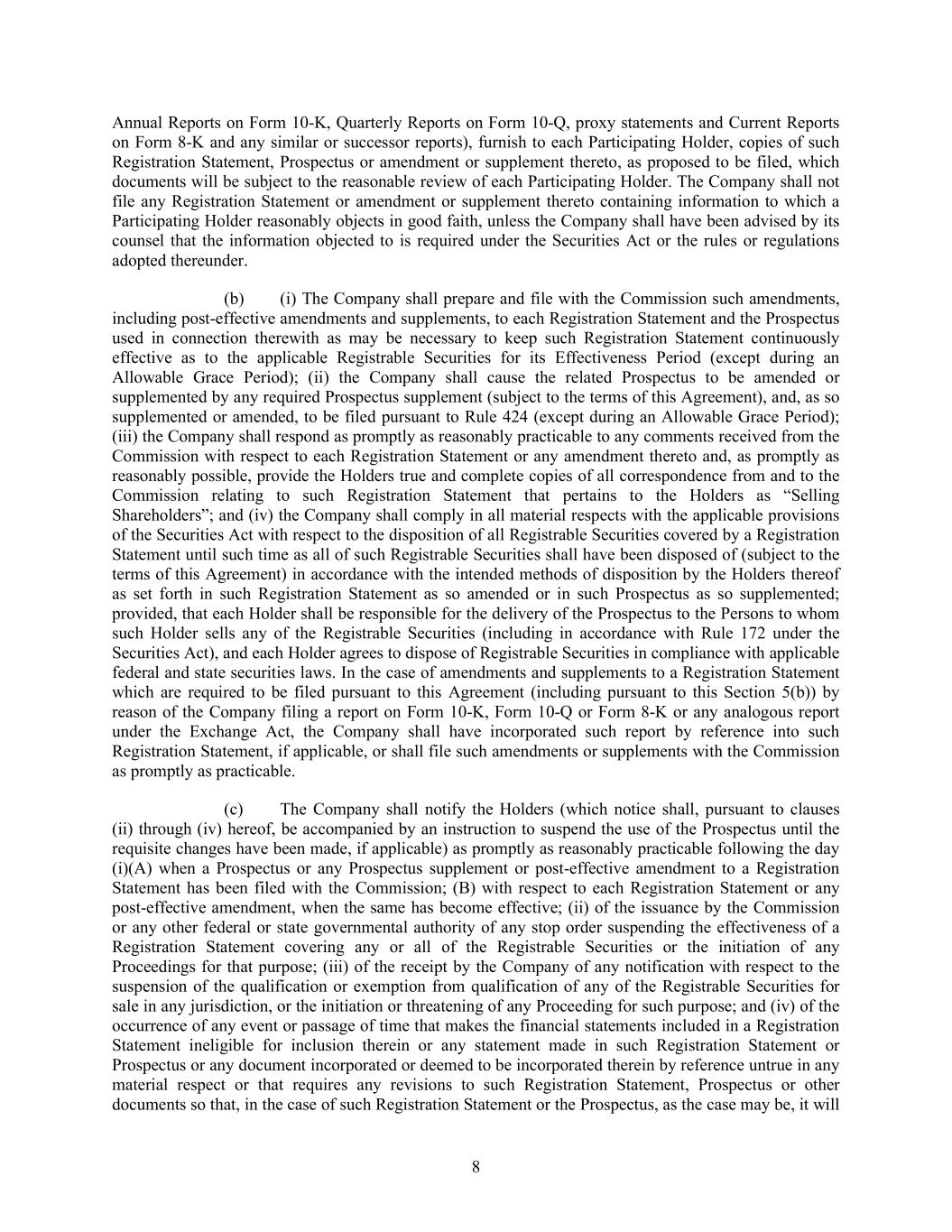 8 Annual Reports on Form 10-K, Quarterly Reports on Form 10-Q, proxy statements and Current Reports on Form 8-K and any similar or successor reports), furnish to each Participating Holder, copies of such Registration Statement, Prospectus or amendment or supplement thereto, as proposed to be filed, which documents will be subject to the reasonable review of each Participating Holder. The Company shall not file any Registration Statement or amendment or supplement thereto containing information to which a Participating Holder reasonably objects in good faith, unless the Company shall have been advised by its counsel that the information objected to is required under the Securities Act or the rules or regulations adopted thereunder. (b) (i) The Company shall prepare and file with the Commission such amendments, including post-effective amendments and supplements, to each Registration Statement and the Prospectus used in connection therewith as may be necessary to keep such Registration Statement continuously effective as to the applicable Registrable Securities for its Effectiveness Period (except during an Allowable Grace Period); (ii) the Company shall cause the related Prospectus to be amended or supplemented by any required Prospectus supplement (subject to the terms of this Agreement), and, as so supplemented or amended, to be filed pursuant to Rule 424 (except during an Allowable Grace Period); (iii) the Company shall respond as promptly as reasonably practicable to any comments received from the Commission with respect to each Registration Statement or any amendment thereto and, as promptly as reasonably possible, provide the Holders true and complete copies of all correspondence from and to the Commission relating to such Registration Statement that pertains to the Holders as “Selling Shareholders”; and (iv) the Company shall comply in all material respects with the applicable provisions of the Securities Act with respect to the disposition of all Registrable Securities covered by a Registration Statement until such time as all of such Registrable Securities shall have been disposed of (subject to the terms of this Agreement) in accordance with the intended methods of disposition by the Holders thereof as set forth in such Registration Statement as so amended or in such Prospectus as so supplemented; provided, that each Holder shall be responsible for the delivery of the Prospectus to the Persons to whom such Holder sells any of the Registrable Securities (including in accordance with Rule 172 under the Securities Act), and each Holder agrees to dispose of Registrable Securities in compliance with applicable federal and state securities laws. In the case of amendments and supplements to a Registration Statement which are required to be filed pursuant to this Agreement (including pursuant to this Section 5(b)) by reason of the Company filing a report on Form 10-K, Form 10-Q or Form 8-K or any analogous report under the Exchange Act, the Company shall have incorporated such report by reference into such Registration Statement, if applicable, or shall file such amendments or supplements with the Commission as promptly as practicable. (c) The Company shall notify the Holders (which notice shall, pursuant to clauses (ii) through (iv) hereof, be accompanied by an instruction to suspend the use of the Prospectus until the requisite changes have been made, if applicable) as promptly as reasonably practicable following the day (i)(A) when a Prospectus or any Prospectus supplement or post-effective amendment to a Registration Statement has been filed with the Commission; (B) with respect to each Registration Statement or any post-effective amendment, when the same has become effective; (ii) of the issuance by the Commission or any other federal or state governmental authority of any stop order suspending the effectiveness of a Registration Statement covering any or all of the Registrable Securities or the initiation of any Proceedings for that purpose; (iii) of the receipt by the Company of any notification with respect to the suspension of the qualification or exemption from qualification of any of the Registrable Securities for sale in any jurisdiction, or the initiation or threatening of any Proceeding for such purpose; and (iv) of the occurrence of any event or passage of time that makes the financial statements included in a Registration Statement ineligible for inclusion therein or any statement made in such Registration Statement or Prospectus or any document incorporated or deemed to be incorporated therein by reference untrue in any material respect or that requires any revisions to such Registration Statement, Prospectus or other documents so that, in the case of such Registration Statement or the Prospectus, as the case may be, it will