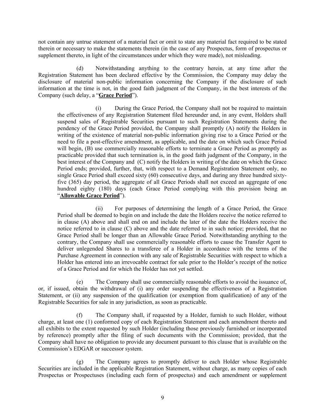 9 not contain any untrue statement of a material fact or omit to state any material fact required to be stated therein or necessary to make the statements therein (in the case of any Prospectus, form of prospectus or supplement thereto, in light of the circumstances under which they were made), not misleading. (d) Notwithstanding anything to the contrary herein, at any time after the Registration Statement has been declared effective by the Commission, the Company may delay the disclosure of material non-public information concerning the Company if the disclosure of such information at the time is not, in the good faith judgment of the Company, in the best interests of the Company (such delay, a “Grace Period”). (i) During the Grace Period, the Company shall not be required to maintain the effectiveness of any Registration Statement filed hereunder and, in any event, Holders shall suspend sales of Registrable Securities pursuant to such Registration Statements during the pendency of the Grace Period provided, the Company shall promptly (A) notify the Holders in writing of the existence of material non-public information giving rise to a Grace Period or the need to file a post-effective amendment, as applicable, and the date on which such Grace Period will begin, (B) use commercially reasonable efforts to terminate a Grace Period as promptly as practicable provided that such termination is, in the good faith judgment of the Company, in the best interest of the Company and (C) notify the Holders in writing of the date on which the Grace Period ends; provided, further, that, with respect to a Demand Registration Statement only, no single Grace Period shall exceed sixty (60) consecutive days, and during any three hundred sixty- five (365) day period, the aggregate of all Grace Periods shall not exceed an aggregate of one hundred eighty (180) days (each Grace Period complying with this provision being an “Allowable Grace Period”). (ii) For purposes of determining the length of a Grace Period, the Grace Period shall be deemed to begin on and include the date the Holders receive the notice referred to in clause (A) above and shall end on and include the later of the date the Holders receive the notice referred to in clause (C) above and the date referred to in such notice; provided, that no Grace Period shall be longer than an Allowable Grace Period. Notwithstanding anything to the contrary, the Company shall use commercially reasonable efforts to cause the Transfer Agent to deliver unlegended Shares to a transferee of a Holder in accordance with the terms of the Purchase Agreement in connection with any sale of Registrable Securities with respect to which a Holder has entered into an irrevocable contract for sale prior to the Holder’s receipt of the notice of a Grace Period and for which the Holder has not yet settled. (e) The Company shall use commercially reasonable efforts to avoid the issuance of, or, if issued, obtain the withdrawal of (i) any order suspending the effectiveness of a Registration Statement, or (ii) any suspension of the qualification (or exemption from qualification) of any of the Registrable Securities for sale in any jurisdiction, as soon as practicable. (f) The Company shall, if requested by a Holder, furnish to such Holder, without charge, at least one (1) conformed copy of each Registration Statement and each amendment thereto and all exhibits to the extent requested by such Holder (including those previously furnished or incorporated by reference) promptly after the filing of such documents with the Commission; provided, that the Company shall have no obligation to provide any document pursuant to this clause that is available on the Commission’s EDGAR or successor system. (g) The Company agrees to promptly deliver to each Holder whose Registrable Securities are included in the applicable Registration Statement, without charge, as many copies of each Prospectus or Prospectuses (including each form of prospectus) and each amendment or supplement