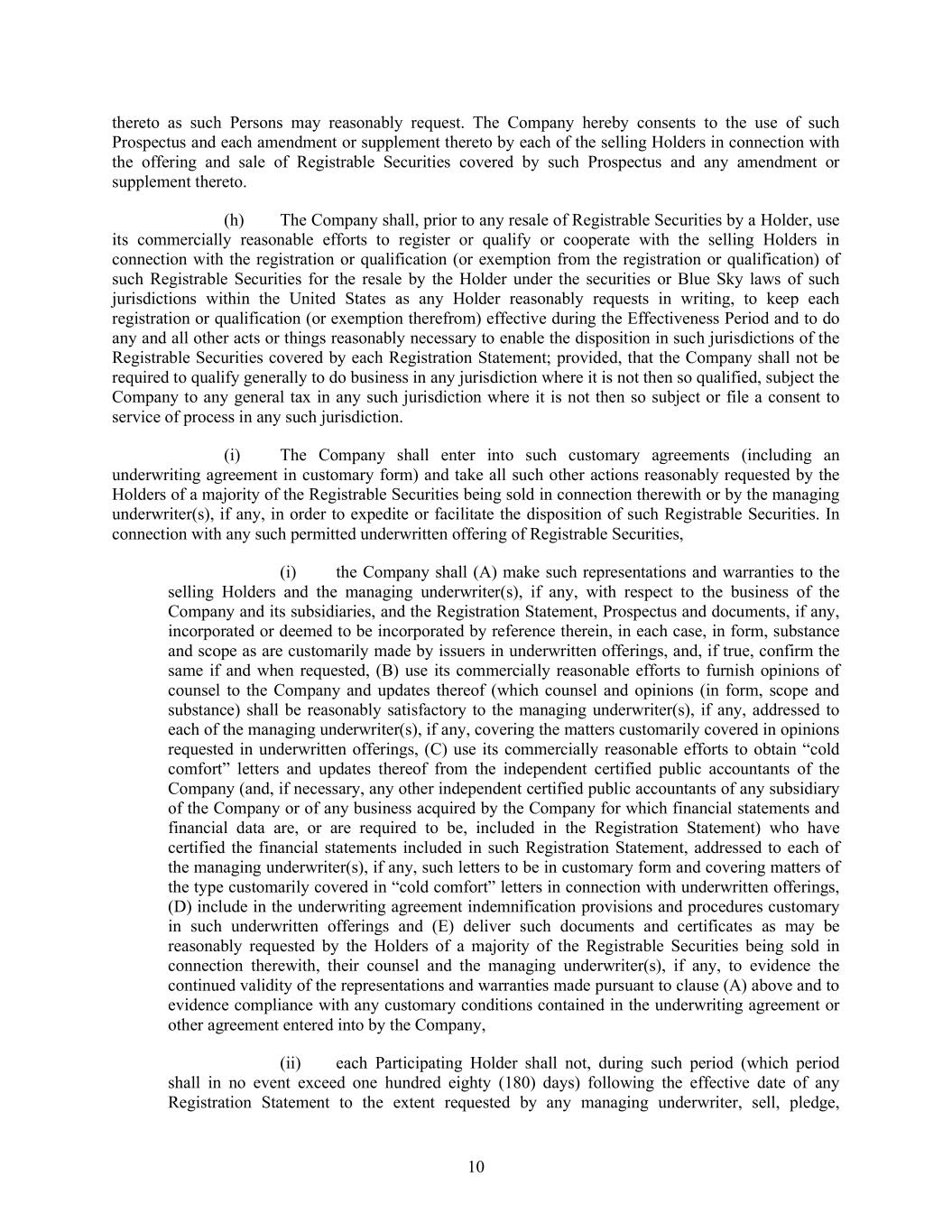 10 thereto as such Persons may reasonably request. The Company hereby consents to the use of such Prospectus and each amendment or supplement thereto by each of the selling Holders in connection with the offering and sale of Registrable Securities covered by such Prospectus and any amendment or supplement thereto. (h) The Company shall, prior to any resale of Registrable Securities by a Holder, use its commercially reasonable efforts to register or qualify or cooperate with the selling Holders in connection with the registration or qualification (or exemption from the registration or qualification) of such Registrable Securities for the resale by the Holder under the securities or Blue Sky laws of such jurisdictions within the United States as any Holder reasonably requests in writing, to keep each registration or qualification (or exemption therefrom) effective during the Effectiveness Period and to do any and all other acts or things reasonably necessary to enable the disposition in such jurisdictions of the Registrable Securities covered by each Registration Statement; provided, that the Company shall not be required to qualify generally to do business in any jurisdiction where it is not then so qualified, subject the Company to any general tax in any such jurisdiction where it is not then so subject or file a consent to service of process in any such jurisdiction. (i) The Company shall enter into such customary agreements (including an underwriting agreement in customary form) and take all such other actions reasonably requested by the Holders of a majority of the Registrable Securities being sold in connection therewith or by the managing underwriter(s), if any, in order to expedite or facilitate the disposition of such Registrable Securities. In connection with any such permitted underwritten offering of Registrable Securities, (i) the Company shall (A) make such representations and warranties to the selling Holders and the managing underwriter(s), if any, with respect to the business of the Company and its subsidiaries, and the Registration Statement, Prospectus and documents, if any, incorporated or deemed to be incorporated by reference therein, in each case, in form, substance and scope as are customarily made by issuers in underwritten offerings, and, if true, confirm the same if and when requested, (B) use its commercially reasonable efforts to furnish opinions of counsel to the Company and updates thereof (which counsel and opinions (in form, scope and substance) shall be reasonably satisfactory to the managing underwriter(s), if any, addressed to each of the managing underwriter(s), if any, covering the matters customarily covered in opinions requested in underwritten offerings, (C) use its commercially reasonable efforts to obtain “cold comfort” letters and updates thereof from the independent certified public accountants of the Company (and, if necessary, any other independent certified public accountants of any subsidiary of the Company or of any business acquired by the Company for which financial statements and financial data are, or are required to be, included in the Registration Statement) who have certified the financial statements included in such Registration Statement, addressed to each of the managing underwriter(s), if any, such letters to be in customary form and covering matters of the type customarily covered in “cold comfort” letters in connection with underwritten offerings, (D) include in the underwriting agreement indemnification provisions and procedures customary in such underwritten offerings and (E) deliver such documents and certificates as may be reasonably requested by the Holders of a majority of the Registrable Securities being sold in connection therewith, their counsel and the managing underwriter(s), if any, to evidence the continued validity of the representations and warranties made pursuant to clause (A) above and to evidence compliance with any customary conditions contained in the underwriting agreement or other agreement entered into by the Company, (ii) each Participating Holder shall not, during such period (which period shall in no event exceed one hundred eighty (180) days) following the effective date of any Registration Statement to the extent requested by any managing underwriter, sell, pledge,