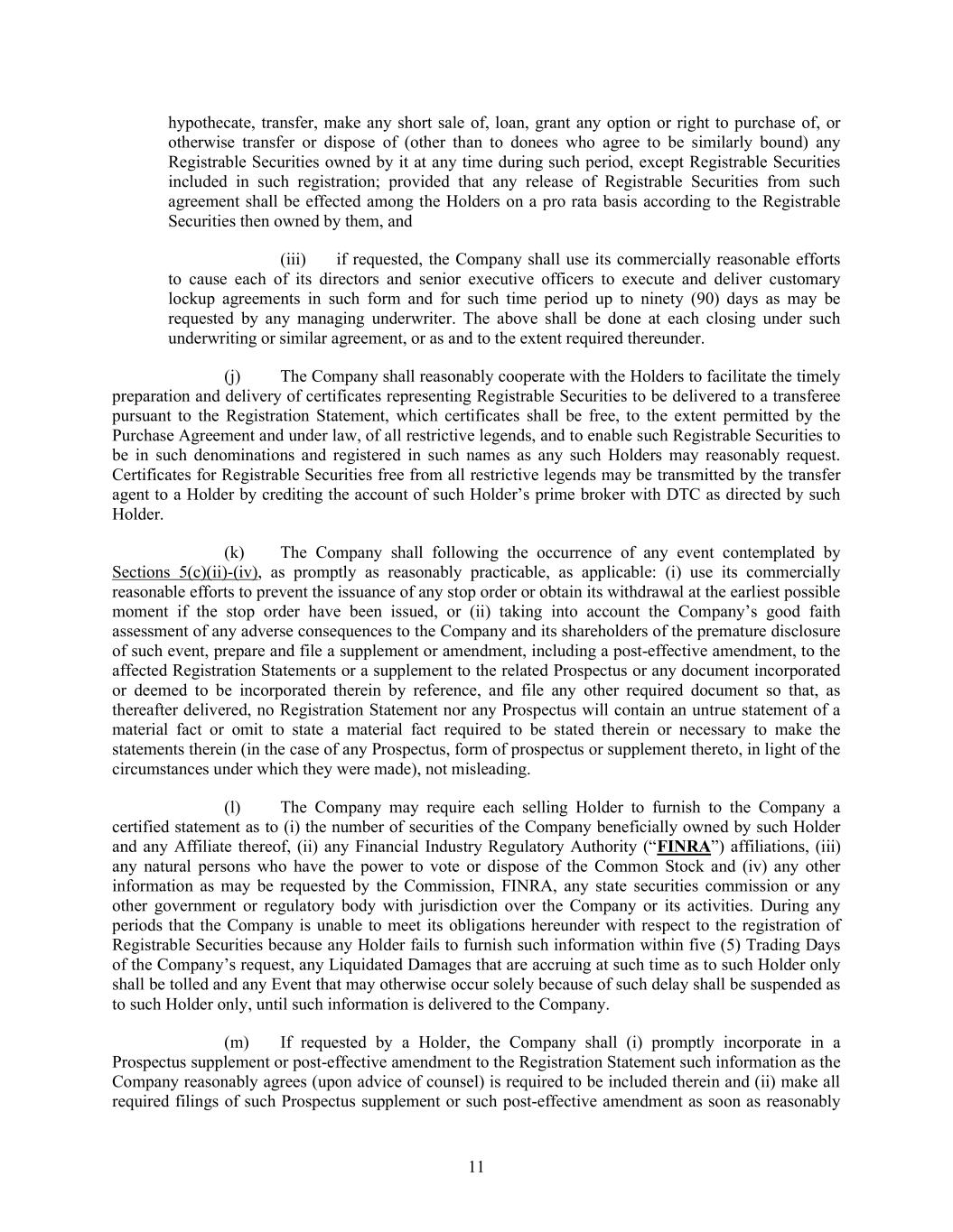 11 hypothecate, transfer, make any short sale of, loan, grant any option or right to purchase of, or otherwise transfer or dispose of (other than to donees who agree to be similarly bound) any Registrable Securities owned by it at any time during such period, except Registrable Securities included in such registration; provided that any release of Registrable Securities from such agreement shall be effected among the Holders on a pro rata basis according to the Registrable Securities then owned by them, and (iii) if requested, the Company shall use its commercially reasonable efforts to cause each of its directors and senior executive officers to execute and deliver customary lockup agreements in such form and for such time period up to ninety (90) days as may be requested by any managing underwriter. The above shall be done at each closing under such underwriting or similar agreement, or as and to the extent required thereunder. (j) The Company shall reasonably cooperate with the Holders to facilitate the timely preparation and delivery of certificates representing Registrable Securities to be delivered to a transferee pursuant to the Registration Statement, which certificates shall be free, to the extent permitted by the Purchase Agreement and under law, of all restrictive legends, and to enable such Registrable Securities to be in such denominations and registered in such names as any such Holders may reasonably request. Certificates for Registrable Securities free from all restrictive legends may be transmitted by the transfer agent to a Holder by crediting the account of such Holder’s prime broker with DTC as directed by such Holder. (k) The Company shall following the occurrence of any event contemplated by Sections 5(c)(ii)-(iv), as promptly as reasonably practicable, as applicable: (i) use its commercially reasonable efforts to prevent the issuance of any stop order or obtain its withdrawal at the earliest possible moment if the stop order have been issued, or (ii) taking into account the Company’s good faith assessment of any adverse consequences to the Company and its shareholders of the premature disclosure of such event, prepare and file a supplement or amendment, including a post-effective amendment, to the affected Registration Statements or a supplement to the related Prospectus or any document incorporated or deemed to be incorporated therein by reference, and file any other required document so that, as thereafter delivered, no Registration Statement nor any Prospectus will contain an untrue statement of a material fact or omit to state a material fact required to be stated therein or necessary to make the statements therein (in the case of any Prospectus, form of prospectus or supplement thereto, in light of the circumstances under which they were made), not misleading. (l) The Company may require each selling Holder to furnish to the Company a certified statement as to (i) the number of securities of the Company beneficially owned by such Holder and any Affiliate thereof, (ii) any Financial Industry Regulatory Authority (“FINRA”) affiliations, (iii) any natural persons who have the power to vote or dispose of the Common Stock and (iv) any other information as may be requested by the Commission, FINRA, any state securities commission or any other government or regulatory body with jurisdiction over the Company or its activities. During any periods that the Company is unable to meet its obligations hereunder with respect to the registration of Registrable Securities because any Holder fails to furnish such information within five (5) Trading Days of the Company’s request, any Liquidated Damages that are accruing at such time as to such Holder only shall be tolled and any Event that may otherwise occur solely because of such delay shall be suspended as to such Holder only, until such information is delivered to the Company. (m) If requested by a Holder, the Company shall (i) promptly incorporate in a Prospectus supplement or post-effective amendment to the Registration Statement such information as the Company reasonably agrees (upon advice of counsel) is required to be included therein and (ii) make all required filings of such Prospectus supplement or such post-effective amendment as soon as reasonably