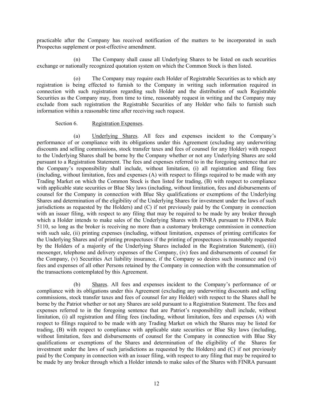12 practicable after the Company has received notification of the matters to be incorporated in such Prospectus supplement or post-effective amendment. (n) The Company shall cause all Underlying Shares to be listed on each securities exchange or nationally recognized quotation system on which the Common Stock is then listed. (o) The Company may require each Holder of Registrable Securities as to which any registration is being effected to furnish to the Company in writing such information required in connection with such registration regarding such Holder and the distribution of such Registrable Securities as the Company may, from time to time, reasonably request in writing and the Company may exclude from such registration the Registrable Securities of any Holder who fails to furnish such information within a reasonable time after receiving such request. Section 6. Registration Expenses. (a) Underlying Shares. All fees and expenses incident to the Company’s performance of or compliance with its obligations under this Agreement (excluding any underwriting discounts and selling commissions, stock transfer taxes and fees of counsel for any Holder) with respect to the Underlying Shares shall be borne by the Company whether or not any Underlying Shares are sold pursuant to a Registration Statement. The fees and expenses referred to in the foregoing sentence that are the Company’s responsibility shall include, without limitation, (i) all registration and filing fees (including, without limitation, fees and expenses (A) with respect to filings required to be made with any Trading Market on which the Common Stock is then listed for trading, (B) with respect to compliance with applicable state securities or Blue Sky laws (including, without limitation, fees and disbursements of counsel for the Company in connection with Blue Sky qualifications or exemptions of the Underlying Shares and determination of the eligibility of the Underlying Shares for investment under the laws of such jurisdictions as requested by the Holders) and (C) if not previously paid by the Company in connection with an issuer filing, with respect to any filing that may be required to be made by any broker through which a Holder intends to make sales of the Underlying Shares with FINRA pursuant to FINRA Rule 5110, so long as the broker is receiving no more than a customary brokerage commission in connection with such sale, (ii) printing expenses (including, without limitation, expenses of printing certificates for the Underlying Shares and of printing prospectuses if the printing of prospectuses is reasonably requested by the Holders of a majority of the Underlying Shares included in the Registration Statement), (iii) messenger, telephone and delivery expenses of the Company, (iv) fees and disbursements of counsel for the Company, (v) Securities Act liability insurance, if the Company so desires such insurance and (vi) fees and expenses of all other Persons retained by the Company in connection with the consummation of the transactions contemplated by this Agreement. (b) Shares. All fees and expenses incident to the Company’s performance of or compliance with its obligations under this Agreement (excluding any underwriting discounts and selling commissions, stock transfer taxes and fees of counsel for any Holder) with respect to the Shares shall be borne by the Patriot whether or not any Shares are sold pursuant to a Registration Statement. The fees and expenses referred to in the foregoing sentence that are Patriot’s responsibility shall include, without limitation, (i) all registration and filing fees (including, without limitation, fees and expenses (A) with respect to filings required to be made with any Trading Market on which the Shares may be listed for trading, (B) with respect to compliance with applicable state securities or Blue Sky laws (including, without limitation, fees and disbursements of counsel for the Company in connection with Blue Sky qualifications or exemptions of the Shares and determination of the eligibility of the Shares for investment under the laws of such jurisdictions as requested by the Holders) and (C) if not previously paid by the Company in connection with an issuer filing, with respect to any filing that may be required to be made by any broker through which a Holder intends to make sales of the Shares with FINRA pursuant
