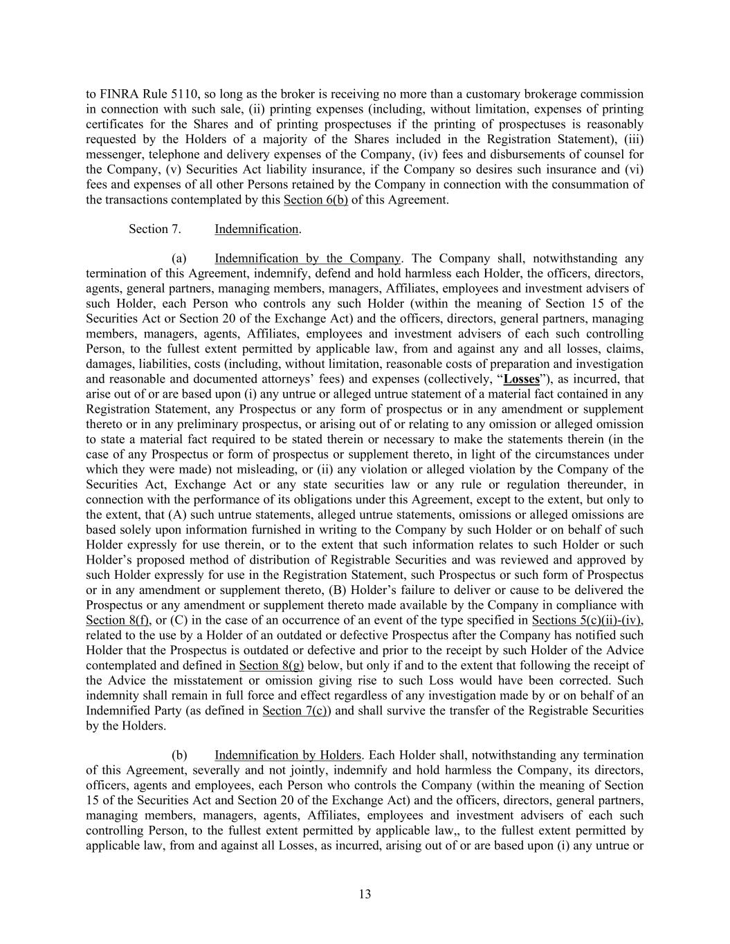 13 to FINRA Rule 5110, so long as the broker is receiving no more than a customary brokerage commission in connection with such sale, (ii) printing expenses (including, without limitation, expenses of printing certificates for the Shares and of printing prospectuses if the printing of prospectuses is reasonably requested by the Holders of a majority of the Shares included in the Registration Statement), (iii) messenger, telephone and delivery expenses of the Company, (iv) fees and disbursements of counsel for the Company, (v) Securities Act liability insurance, if the Company so desires such insurance and (vi) fees and expenses of all other Persons retained by the Company in connection with the consummation of the transactions contemplated by this Section 6(b) of this Agreement. Section 7. Indemnification. (a) Indemnification by the Company. The Company shall, notwithstanding any termination of this Agreement, indemnify, defend and hold harmless each Holder, the officers, directors, agents, general partners, managing members, managers, Affiliates, employees and investment advisers of such Holder, each Person who controls any such Holder (within the meaning of Section 15 of the Securities Act or Section 20 of the Exchange Act) and the officers, directors, general partners, managing members, managers, agents, Affiliates, employees and investment advisers of each such controlling Person, to the fullest extent permitted by applicable law, from and against any and all losses, claims, damages, liabilities, costs (including, without limitation, reasonable costs of preparation and investigation and reasonable and documented attorneys’ fees) and expenses (collectively, “Losses”), as incurred, that arise out of or are based upon (i) any untrue or alleged untrue statement of a material fact contained in any Registration Statement, any Prospectus or any form of prospectus or in any amendment or supplement thereto or in any preliminary prospectus, or arising out of or relating to any omission or alleged omission to state a material fact required to be stated therein or necessary to make the statements therein (in the case of any Prospectus or form of prospectus or supplement thereto, in light of the circumstances under which they were made) not misleading, or (ii) any violation or alleged violation by the Company of the Securities Act, Exchange Act or any state securities law or any rule or regulation thereunder, in connection with the performance of its obligations under this Agreement, except to the extent, but only to the extent, that (A) such untrue statements, alleged untrue statements, omissions or alleged omissions are based solely upon information furnished in writing to the Company by such Holder or on behalf of such Holder expressly for use therein, or to the extent that such information relates to such Holder or such Holder’s proposed method of distribution of Registrable Securities and was reviewed and approved by such Holder expressly for use in the Registration Statement, such Prospectus or such form of Prospectus or in any amendment or supplement thereto, (B) Holder’s failure to deliver or cause to be delivered the Prospectus or any amendment or supplement thereto made available by the Company in compliance with Section 8(f), or (C) in the case of an occurrence of an event of the type specified in Sections 5(c)(ii)-(iv), related to the use by a Holder of an outdated or defective Prospectus after the Company has notified such Holder that the Prospectus is outdated or defective and prior to the receipt by such Holder of the Advice contemplated and defined in Section 8(g) below, but only if and to the extent that following the receipt of the Advice the misstatement or omission giving rise to such Loss would have been corrected. Such indemnity shall remain in full force and effect regardless of any investigation made by or on behalf of an Indemnified Party (as defined in Section 7(c)) and shall survive the transfer of the Registrable Securities by the Holders. (b) Indemnification by Holders. Each Holder shall, notwithstanding any termination of this Agreement, severally and not jointly, indemnify and hold harmless the Company, its directors, officers, agents and employees, each Person who controls the Company (within the meaning of Section 15 of the Securities Act and Section 20 of the Exchange Act) and the officers, directors, general partners, managing members, managers, agents, Affiliates, employees and investment advisers of each such controlling Person, to the fullest extent permitted by applicable law,, to the fullest extent permitted by applicable law, from and against all Losses, as incurred, arising out of or are based upon (i) any untrue or