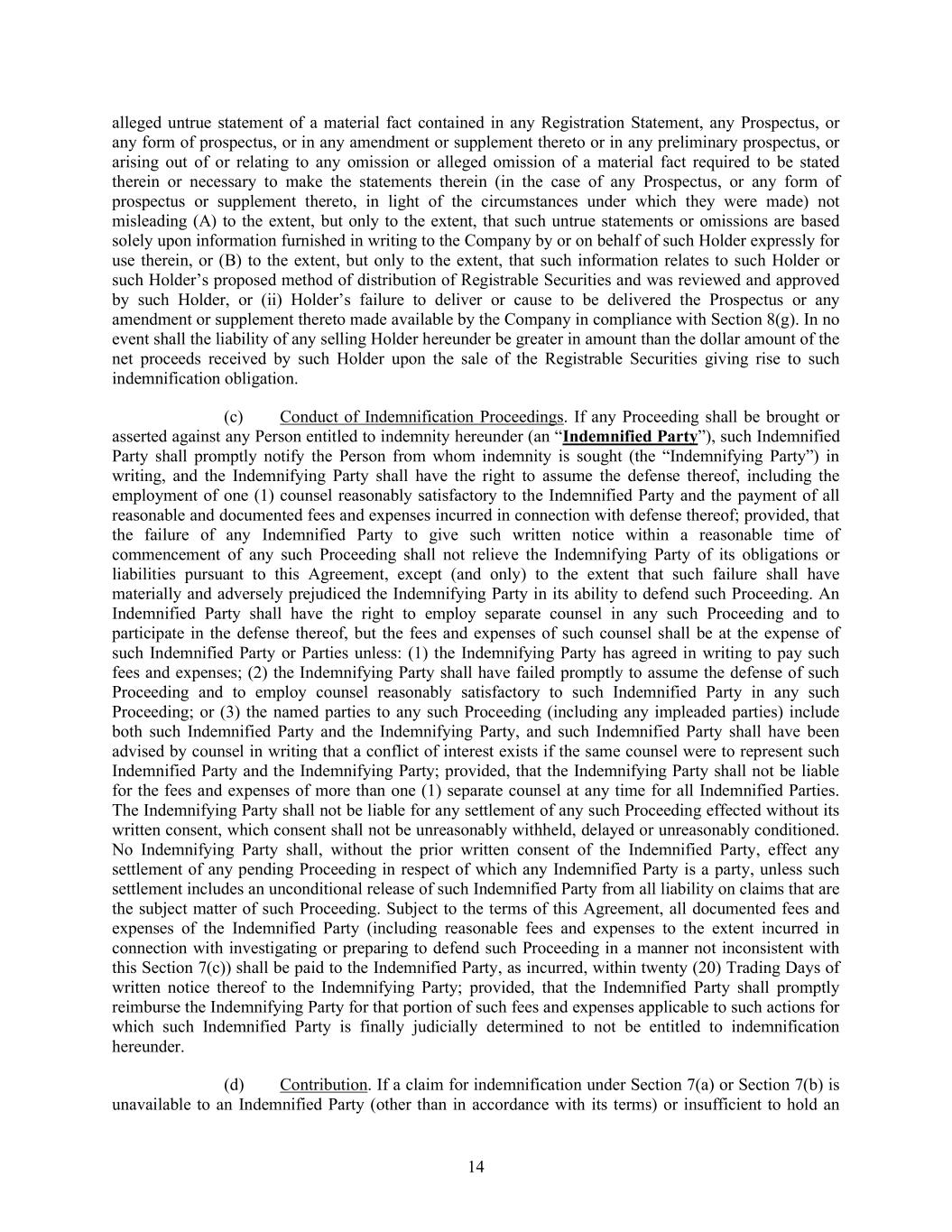 14 alleged untrue statement of a material fact contained in any Registration Statement, any Prospectus, or any form of prospectus, or in any amendment or supplement thereto or in any preliminary prospectus, or arising out of or relating to any omission or alleged omission of a material fact required to be stated therein or necessary to make the statements therein (in the case of any Prospectus, or any form of prospectus or supplement thereto, in light of the circumstances under which they were made) not misleading (A) to the extent, but only to the extent, that such untrue statements or omissions are based solely upon information furnished in writing to the Company by or on behalf of such Holder expressly for use therein, or (B) to the extent, but only to the extent, that such information relates to such Holder or such Holder’s proposed method of distribution of Registrable Securities and was reviewed and approved by such Holder, or (ii) Holder’s failure to deliver or cause to be delivered the Prospectus or any amendment or supplement thereto made available by the Company in compliance with Section 8(g). In no event shall the liability of any selling Holder hereunder be greater in amount than the dollar amount of the net proceeds received by such Holder upon the sale of the Registrable Securities giving rise to such indemnification obligation. (c) Conduct of Indemnification Proceedings. If any Proceeding shall be brought or asserted against any Person entitled to indemnity hereunder (an “Indemnified Party”), such Indemnified Party shall promptly notify the Person from whom indemnity is sought (the “Indemnifying Party”) in writing, and the Indemnifying Party shall have the right to assume the defense thereof, including the employment of one (1) counsel reasonably satisfactory to the Indemnified Party and the payment of all reasonable and documented fees and expenses incurred in connection with defense thereof; provided, that the failure of any Indemnified Party to give such written notice within a reasonable time of commencement of any such Proceeding shall not relieve the Indemnifying Party of its obligations or liabilities pursuant to this Agreement, except (and only) to the extent that such failure shall have materially and adversely prejudiced the Indemnifying Party in its ability to defend such Proceeding. An Indemnified Party shall have the right to employ separate counsel in any such Proceeding and to participate in the defense thereof, but the fees and expenses of such counsel shall be at the expense of such Indemnified Party or Parties unless: (1) the Indemnifying Party has agreed in writing to pay such fees and expenses; (2) the Indemnifying Party shall have failed promptly to assume the defense of such Proceeding and to employ counsel reasonably satisfactory to such Indemnified Party in any such Proceeding; or (3) the named parties to any such Proceeding (including any impleaded parties) include both such Indemnified Party and the Indemnifying Party, and such Indemnified Party shall have been advised by counsel in writing that a conflict of interest exists if the same counsel were to represent such Indemnified Party and the Indemnifying Party; provided, that the Indemnifying Party shall not be liable for the fees and expenses of more than one (1) separate counsel at any time for all Indemnified Parties. The Indemnifying Party shall not be liable for any settlement of any such Proceeding effected without its written consent, which consent shall not be unreasonably withheld, delayed or unreasonably conditioned. No Indemnifying Party shall, without the prior written consent of the Indemnified Party, effect any settlement of any pending Proceeding in respect of which any Indemnified Party is a party, unless such settlement includes an unconditional release of such Indemnified Party from all liability on claims that are the subject matter of such Proceeding. Subject to the terms of this Agreement, all documented fees and expenses of the Indemnified Party (including reasonable fees and expenses to the extent incurred in connection with investigating or preparing to defend such Proceeding in a manner not inconsistent with this Section 7(c)) shall be paid to the Indemnified Party, as incurred, within twenty (20) Trading Days of written notice thereof to the Indemnifying Party; provided, that the Indemnified Party shall promptly reimburse the Indemnifying Party for that portion of such fees and expenses applicable to such actions for which such Indemnified Party is finally judicially determined to not be entitled to indemnification hereunder. (d) Contribution. If a claim for indemnification under Section 7(a) or Section 7(b) is unavailable to an Indemnified Party (other than in accordance with its terms) or insufficient to hold an