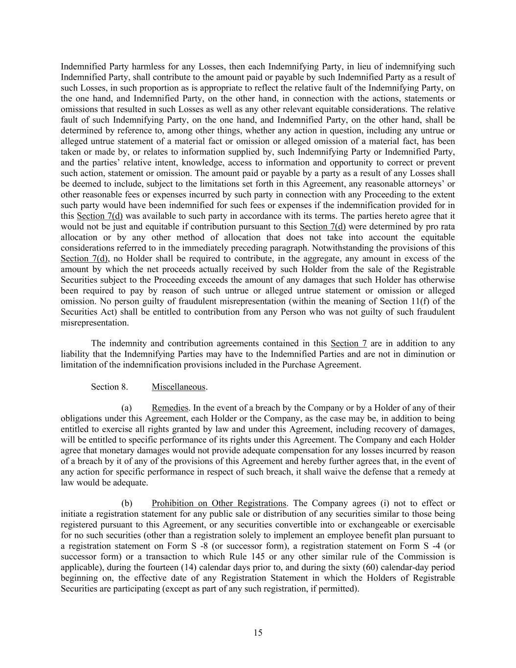 15 Indemnified Party harmless for any Losses, then each Indemnifying Party, in lieu of indemnifying such Indemnified Party, shall contribute to the amount paid or payable by such Indemnified Party as a result of such Losses, in such proportion as is appropriate to reflect the relative fault of the Indemnifying Party, on the one hand, and Indemnified Party, on the other hand, in connection with the actions, statements or omissions that resulted in such Losses as well as any other relevant equitable considerations. The relative fault of such Indemnifying Party, on the one hand, and Indemnified Party, on the other hand, shall be determined by reference to, among other things, whether any action in question, including any untrue or alleged untrue statement of a material fact or omission or alleged omission of a material fact, has been taken or made by, or relates to information supplied by, such Indemnifying Party or Indemnified Party, and the parties’ relative intent, knowledge, access to information and opportunity to correct or prevent such action, statement or omission. The amount paid or payable by a party as a result of any Losses shall be deemed to include, subject to the limitations set forth in this Agreement, any reasonable attorneys’ or other reasonable fees or expenses incurred by such party in connection with any Proceeding to the extent such party would have been indemnified for such fees or expenses if the indemnification provided for in this Section 7(d) was available to such party in accordance with its terms. The parties hereto agree that it would not be just and equitable if contribution pursuant to this Section 7(d) were determined by pro rata allocation or by any other method of allocation that does not take into account the equitable considerations referred to in the immediately preceding paragraph. Notwithstanding the provisions of this Section 7(d), no Holder shall be required to contribute, in the aggregate, any amount in excess of the amount by which the net proceeds actually received by such Holder from the sale of the Registrable Securities subject to the Proceeding exceeds the amount of any damages that such Holder has otherwise been required to pay by reason of such untrue or alleged untrue statement or omission or alleged omission. No person guilty of fraudulent misrepresentation (within the meaning of Section 11(f) of the Securities Act) shall be entitled to contribution from any Person who was not guilty of such fraudulent misrepresentation. The indemnity and contribution agreements contained in this Section 7 are in addition to any liability that the Indemnifying Parties may have to the Indemnified Parties and are not in diminution or limitation of the indemnification provisions included in the Purchase Agreement. Section 8. Miscellaneous. (a) Remedies. In the event of a breach by the Company or by a Holder of any of their obligations under this Agreement, each Holder or the Company, as the case may be, in addition to being entitled to exercise all rights granted by law and under this Agreement, including recovery of damages, will be entitled to specific performance of its rights under this Agreement. The Company and each Holder agree that monetary damages would not provide adequate compensation for any losses incurred by reason of a breach by it of any of the provisions of this Agreement and hereby further agrees that, in the event of any action for specific performance in respect of such breach, it shall waive the defense that a remedy at law would be adequate. (b) Prohibition on Other Registrations. The Company agrees (i) not to effect or initiate a registration statement for any public sale or distribution of any securities similar to those being registered pursuant to this Agreement, or any securities convertible into or exchangeable or exercisable for no such securities (other than a registration solely to implement an employee benefit plan pursuant to a registration statement on Form S -8 (or successor form), a registration statement on Form S -4 (or successor form) or a transaction to which Rule 145 or any other similar rule of the Commission is applicable), during the fourteen (14) calendar days prior to, and during the sixty (60) calendar-day period beginning on, the effective date of any Registration Statement in which the Holders of Registrable Securities are participating (except as part of any such registration, if permitted).