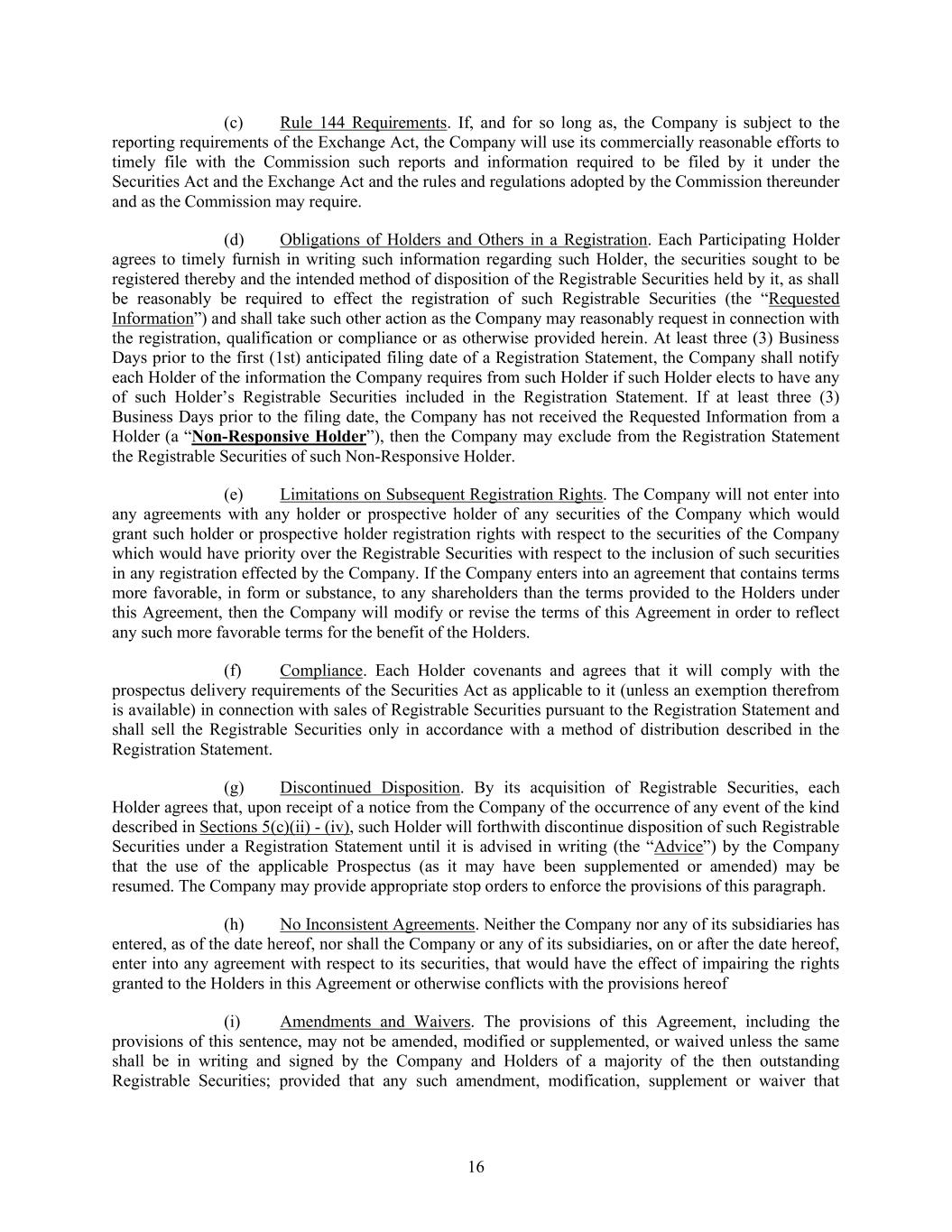 16 (c) Rule 144 Requirements. If, and for so long as, the Company is subject to the reporting requirements of the Exchange Act, the Company will use its commercially reasonable efforts to timely file with the Commission such reports and information required to be filed by it under the Securities Act and the Exchange Act and the rules and regulations adopted by the Commission thereunder and as the Commission may require. (d) Obligations of Holders and Others in a Registration. Each Participating Holder agrees to timely furnish in writing such information regarding such Holder, the securities sought to be registered thereby and the intended method of disposition of the Registrable Securities held by it, as shall be reasonably be required to effect the registration of such Registrable Securities (the “Requested Information”) and shall take such other action as the Company may reasonably request in connection with the registration, qualification or compliance or as otherwise provided herein. At least three (3) Business Days prior to the first (1st) anticipated filing date of a Registration Statement, the Company shall notify each Holder of the information the Company requires from such Holder if such Holder elects to have any of such Holder’s Registrable Securities included in the Registration Statement. If at least three (3) Business Days prior to the filing date, the Company has not received the Requested Information from a Holder (a “Non-Responsive Holder”), then the Company may exclude from the Registration Statement the Registrable Securities of such Non-Responsive Holder. (e) Limitations on Subsequent Registration Rights. The Company will not enter into any agreements with any holder or prospective holder of any securities of the Company which would grant such holder or prospective holder registration rights with respect to the securities of the Company which would have priority over the Registrable Securities with respect to the inclusion of such securities in any registration effected by the Company. If the Company enters into an agreement that contains terms more favorable, in form or substance, to any shareholders than the terms provided to the Holders under this Agreement, then the Company will modify or revise the terms of this Agreement in order to reflect any such more favorable terms for the benefit of the Holders. (f) Compliance. Each Holder covenants and agrees that it will comply with the prospectus delivery requirements of the Securities Act as applicable to it (unless an exemption therefrom is available) in connection with sales of Registrable Securities pursuant to the Registration Statement and shall sell the Registrable Securities only in accordance with a method of distribution described in the Registration Statement. (g) Discontinued Disposition. By its acquisition of Registrable Securities, each Holder agrees that, upon receipt of a notice from the Company of the occurrence of any event of the kind described in Sections 5(c)(ii) - (iv), such Holder will forthwith discontinue disposition of such Registrable Securities under a Registration Statement until it is advised in writing (the “Advice”) by the Company that the use of the applicable Prospectus (as it may have been supplemented or amended) may be resumed. The Company may provide appropriate stop orders to enforce the provisions of this paragraph. (h) No Inconsistent Agreements. Neither the Company nor any of its subsidiaries has entered, as of the date hereof, nor shall the Company or any of its subsidiaries, on or after the date hereof, enter into any agreement with respect to its securities, that would have the effect of impairing the rights granted to the Holders in this Agreement or otherwise conflicts with the provisions hereof (i) Amendments and Waivers. The provisions of this Agreement, including the provisions of this sentence, may not be amended, modified or supplemented, or waived unless the same shall be in writing and signed by the Company and Holders of a majority of the then outstanding Registrable Securities; provided that any such amendment, modification, supplement or waiver that