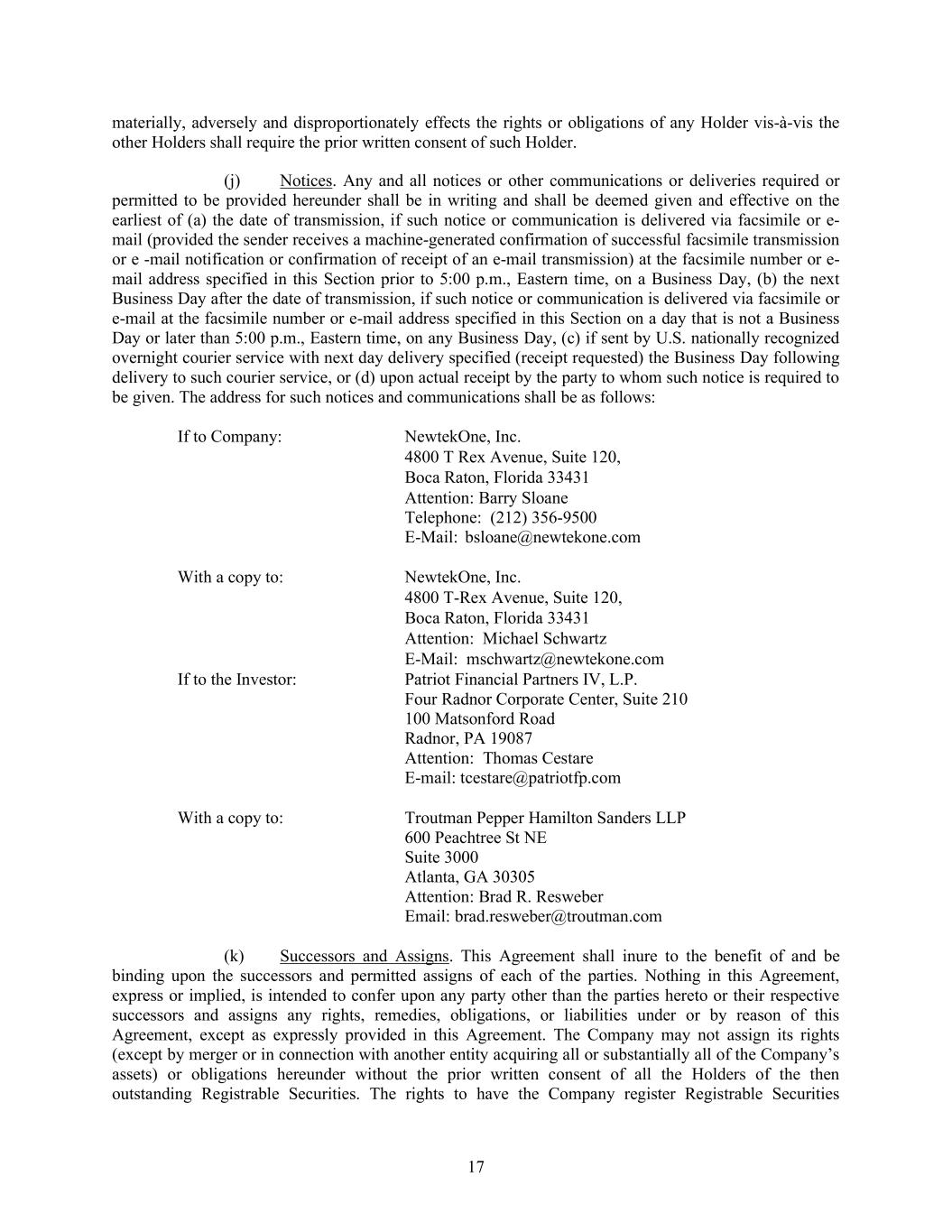 17 materially, adversely and disproportionately effects the rights or obligations of any Holder vis-à-vis the other Holders shall require the prior written consent of such Holder. (j) Notices. Any and all notices or other communications or deliveries required or permitted to be provided hereunder shall be in writing and shall be deemed given and effective on the earliest of (a) the date of transmission, if such notice or communication is delivered via facsimile or e- mail (provided the sender receives a machine-generated confirmation of successful facsimile transmission or e -mail notification or confirmation of receipt of an e-mail transmission) at the facsimile number or e- mail address specified in this Section prior to 5:00 p.m., Eastern time, on a Business Day, (b) the next Business Day after the date of transmission, if such notice or communication is delivered via facsimile or e-mail at the facsimile number or e-mail address specified in this Section on a day that is not a Business Day or later than 5:00 p.m., Eastern time, on any Business Day, (c) if sent by U.S. nationally recognized overnight courier service with next day delivery specified (receipt requested) the Business Day following delivery to such courier service, or (d) upon actual receipt by the party to whom such notice is required to be given. The address for such notices and communications shall be as follows: If to Company: NewtekOne, Inc. 4800 T Rex Avenue, Suite 120, Boca Raton, Florida 33431 Attention: Barry Sloane Telephone: (212) 356-9500 E-Mail: bsloane@newtekone.com With a copy to: NewtekOne, Inc. 4800 T-Rex Avenue, Suite 120, Boca Raton, Florida 33431 Attention: Michael Schwartz E-Mail: mschwartz@newtekone.com If to the Investor: Patriot Financial Partners IV, L.P. Four Radnor Corporate Center, Suite 210 100 Matsonford Road Radnor, PA 19087 Attention: Thomas Cestare E-mail: tcestare@patriotfp.com With a copy to: Troutman Pepper Hamilton Sanders LLP 600 Peachtree St NE Suite 3000 Atlanta, GA 30305 Attention: Brad R. Resweber Email: brad.resweber@troutman.com (k) Successors and Assigns. This Agreement shall inure to the benefit of and be binding upon the successors and permitted assigns of each of the parties. Nothing in this Agreement, express or implied, is intended to confer upon any party other than the parties hereto or their respective successors and assigns any rights, remedies, obligations, or liabilities under or by reason of this Agreement, except as expressly provided in this Agreement. The Company may not assign its rights (except by merger or in connection with another entity acquiring all or substantially all of the Company’s assets) or obligations hereunder without the prior written consent of all the Holders of the then outstanding Registrable Securities. The rights to have the Company register Registrable Securities
