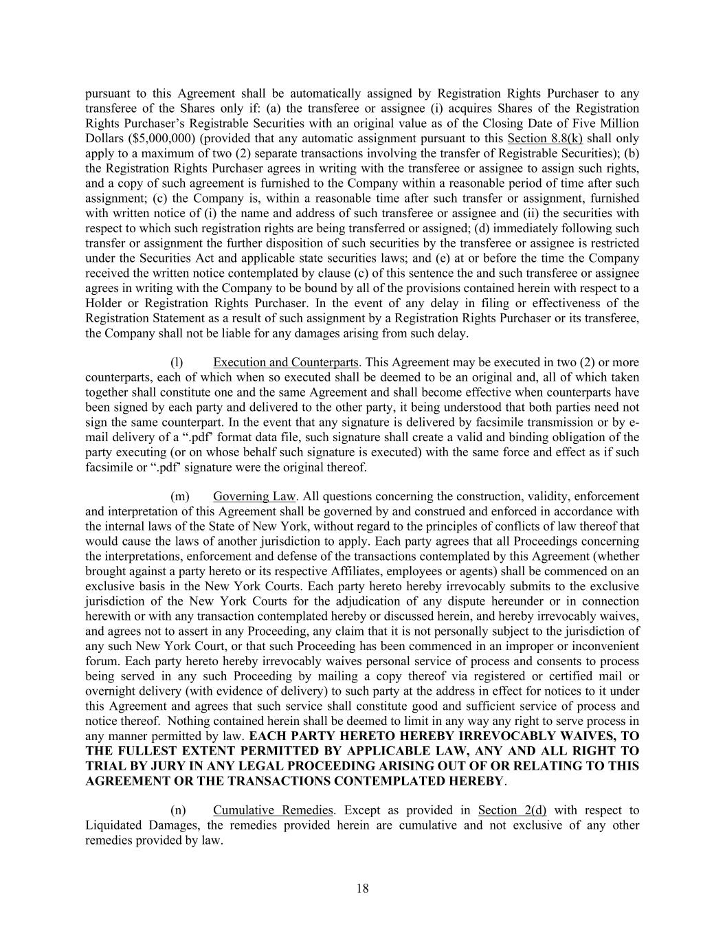 18 pursuant to this Agreement shall be automatically assigned by Registration Rights Purchaser to any transferee of the Shares only if: (a) the transferee or assignee (i) acquires Shares of the Registration Rights Purchaser’s Registrable Securities with an original value as of the Closing Date of Five Million Dollars ($5,000,000) (provided that any automatic assignment pursuant to this Section 8.8(k) shall only apply to a maximum of two (2) separate transactions involving the transfer of Registrable Securities); (b) the Registration Rights Purchaser agrees in writing with the transferee or assignee to assign such rights, and a copy of such agreement is furnished to the Company within a reasonable period of time after such assignment; (c) the Company is, within a reasonable time after such transfer or assignment, furnished with written notice of (i) the name and address of such transferee or assignee and (ii) the securities with respect to which such registration rights are being transferred or assigned; (d) immediately following such transfer or assignment the further disposition of such securities by the transferee or assignee is restricted under the Securities Act and applicable state securities laws; and (e) at or before the time the Company received the written notice contemplated by clause (c) of this sentence the and such transferee or assignee agrees in writing with the Company to be bound by all of the provisions contained herein with respect to a Holder or Registration Rights Purchaser. In the event of any delay in filing or effectiveness of the Registration Statement as a result of such assignment by a Registration Rights Purchaser or its transferee, the Company shall not be liable for any damages arising from such delay. (l) Execution and Counterparts. This Agreement may be executed in two (2) or more counterparts, each of which when so executed shall be deemed to be an original and, all of which taken together shall constitute one and the same Agreement and shall become effective when counterparts have been signed by each party and delivered to the other party, it being understood that both parties need not sign the same counterpart. In the event that any signature is delivered by facsimile transmission or by e- mail delivery of a “.pdf’ format data file, such signature shall create a valid and binding obligation of the party executing (or on whose behalf such signature is executed) with the same force and effect as if such facsimile or “.pdf’ signature were the original thereof. (m) Governing Law. All questions concerning the construction, validity, enforcement and interpretation of this Agreement shall be governed by and construed and enforced in accordance with the internal laws of the State of New York, without regard to the principles of conflicts of law thereof that would cause the laws of another jurisdiction to apply. Each party agrees that all Proceedings concerning the interpretations, enforcement and defense of the transactions contemplated by this Agreement (whether brought against a party hereto or its respective Affiliates, employees or agents) shall be commenced on an exclusive basis in the New York Courts. Each party hereto hereby irrevocably submits to the exclusive jurisdiction of the New York Courts for the adjudication of any dispute hereunder or in connection herewith or with any transaction contemplated hereby or discussed herein, and hereby irrevocably waives, and agrees not to assert in any Proceeding, any claim that it is not personally subject to the jurisdiction of any such New York Court, or that such Proceeding has been commenced in an improper or inconvenient forum. Each party hereto hereby irrevocably waives personal service of process and consents to process being served in any such Proceeding by mailing a copy thereof via registered or certified mail or overnight delivery (with evidence of delivery) to such party at the address in effect for notices to it under this Agreement and agrees that such service shall constitute good and sufficient service of process and notice thereof. Nothing contained herein shall be deemed to limit in any way any right to serve process in any manner permitted by law. EACH PARTY HERETO HEREBY IRREVOCABLY WAIVES, TO THE FULLEST EXTENT PERMITTED BY APPLICABLE LAW, ANY AND ALL RIGHT TO TRIAL BY JURY IN ANY LEGAL PROCEEDING ARISING OUT OF OR RELATING TO THIS AGREEMENT OR THE TRANSACTIONS CONTEMPLATED HEREBY. (n) Cumulative Remedies. Except as provided in Section 2(d) with respect to Liquidated Damages, the remedies provided herein are cumulative and not exclusive of any other remedies provided by law.