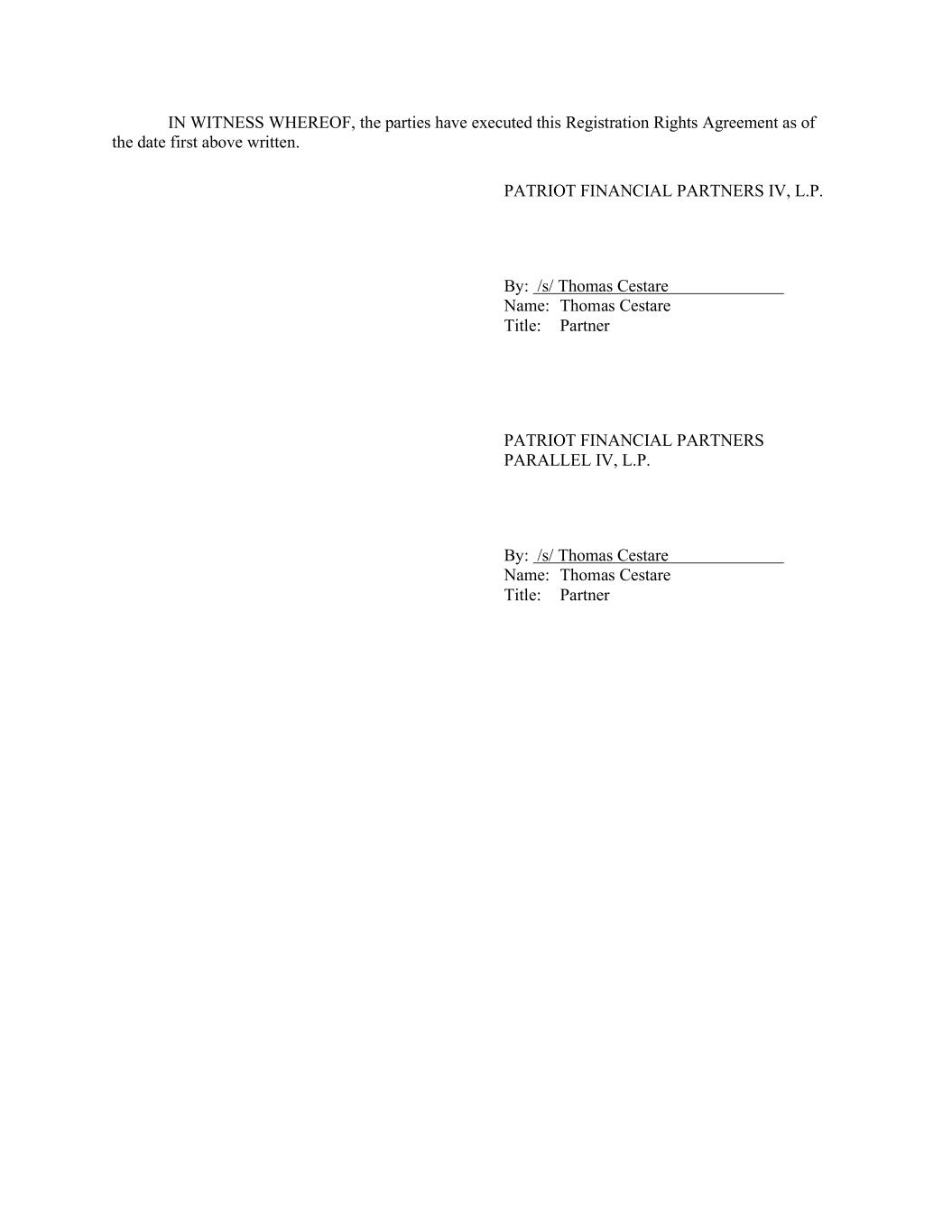 IN WITNESS WHEREOF, the parties have executed this Registration Rights Agreement as of the date first above written. PATRIOT FINANCIAL PARTNERS IV, L.P. By: /s/ Thomas Cestare Name: Thomas Cestare Title: Partner PATRIOT FINANCIAL PARTNERS PARALLEL IV, L.P. By: /s/ Thomas Cestare Name: Thomas Cestare Title: Partner