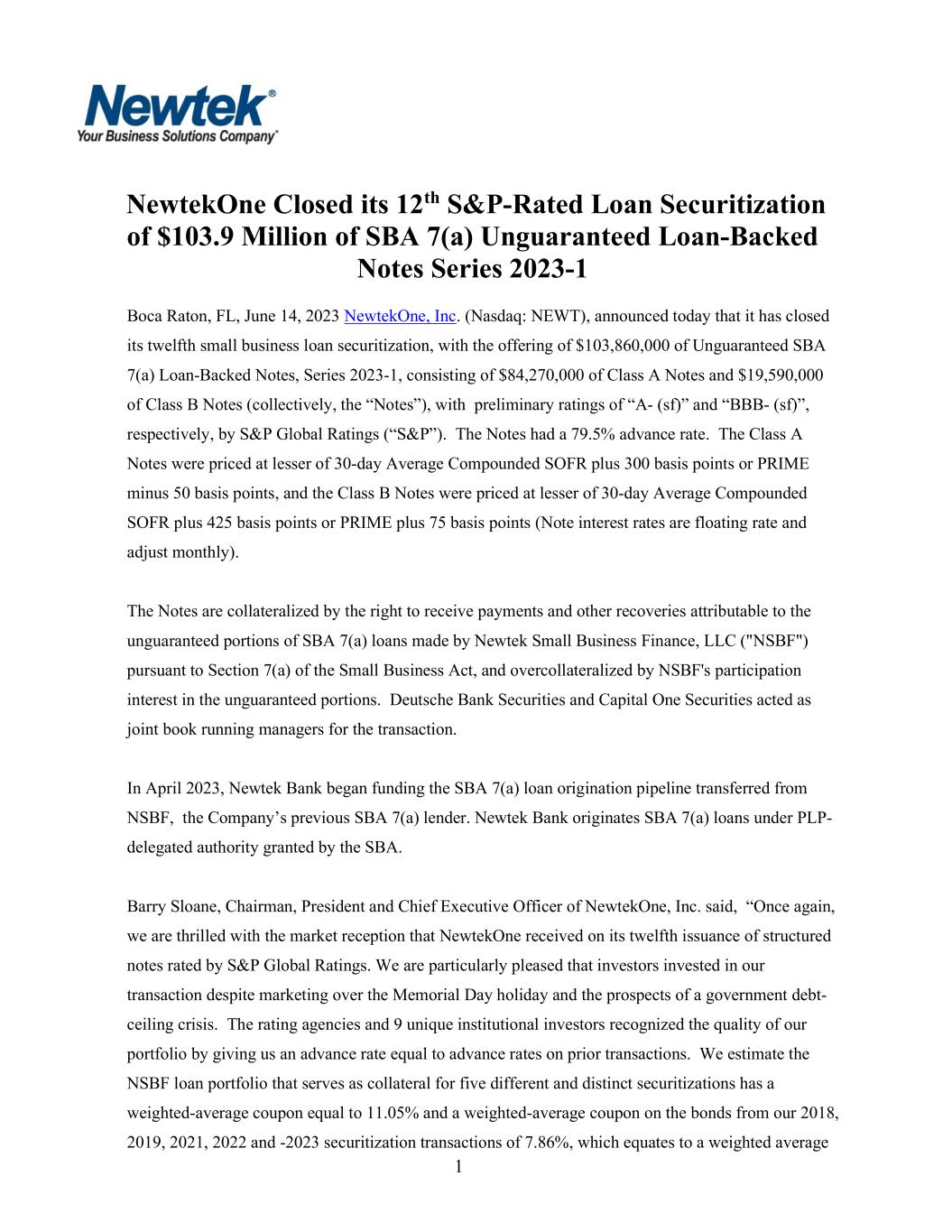 1 NewtekOne Closed its 12th S&P-Rated Loan Securitization of $103.9 Million of SBA 7(a) Unguaranteed Loan-Backed Notes Series 2023-1 Boca Raton, FL, June 14, 2023 NewtekOne, Inc. (Nasdaq: NEWT), announced today that it has closed its twelfth small business loan securitization, with the offering of $103,860,000 of Unguaranteed SBA 7(a) Loan-Backed Notes, Series 2023-1, consisting of $84,270,000 of Class A Notes and $19,590,000 of Class B Notes (collectively, the “Notes”), with preliminary ratings of “A- (sf)” and “BBB- (sf)”, respectively, by S&P Global Ratings (“S&P”). The Notes had a 79.5% advance rate. The Class A Notes were priced at lesser of 30-day Average Compounded SOFR plus 300 basis points or PRIME minus 50 basis points, and the Class B Notes were priced at lesser of 30-day Average Compounded SOFR plus 425 basis points or PRIME plus 75 basis points (Note interest rates are floating rate and adjust monthly). The Notes are collateralized by the right to receive payments and other recoveries attributable to the unguaranteed portions of SBA 7(a) loans made by Newtek Small Business Finance, LLC ("NSBF") pursuant to Section 7(a) of the Small Business Act, and overcollateralized by NSBF's participation interest in the unguaranteed portions. Deutsche Bank Securities and Capital One Securities acted as joint book running managers for the transaction. In April 2023, Newtek Bank began funding the SBA 7(a) loan origination pipeline transferred from NSBF, the Company’s previous SBA 7(a) lender. Newtek Bank originates SBA 7(a) loans under PLP- delegated authority granted by the SBA. Barry Sloane, Chairman, President and Chief Executive Officer of NewtekOne, Inc. said, “Once again, we are thrilled with the market reception that NewtekOne received on its twelfth issuance of structured notes rated by S&P Global Ratings. We are particularly pleased that investors invested in our transaction despite marketing over the Memorial Day holiday and the prospects of a government debt- ceiling crisis. The rating agencies and 9 unique institutional investors recognized the quality of our portfolio by giving us an advance rate equal to advance rates on prior transactions. We estimate the NSBF loan portfolio that serves as collateral for five different and distinct securitizations has a weighted-average coupon equal to 11.05% and a weighted-average coupon on the bonds from our 2018, 2019, 2021, 2022 and -2023 securitization transactions of 7.86%, which equates to a weighted average