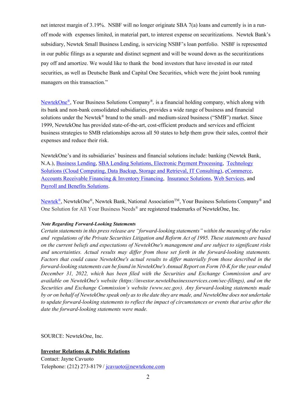 2 net interest margin of 3.19%. NSBF will no longer originate SBA 7(a) loans and currently is in a run- off mode with expenses limited, in material part, to interest expense on securitizations. Newtek Bank’s subsidiary, Newtek Small Business Lending, is servicing NSBF’s loan portfolio. NSBF is represented in our public filings as a separate and distinct segment and will be wound down as the securitizations pay off and amortize. We would like to thank the bond investors that have invested in our rated securities, as well as Deutsche Bank and Capital One Securities, which were the joint book running managers on this transaction.” NewtekOne®, Your Business Solutions Company®, is a financial holding company, which along with its bank and non-bank consolidated subsidiaries, provides a wide range of business and financial solutions under the Newtek® brand to the small- and medium-sized business (“SMB”) market. Since 1999, NewtekOne has provided state-of-the-art, cost-efficient products and services and efficient business strategies to SMB relationships across all 50 states to help them grow their sales, control their expenses and reduce their risk. NewtekOne’s and its subsidiaries’ business and financial solutions include: banking (Newtek Bank, N.A.), Business Lending, SBA Lending Solutions, Electronic Payment Processing, Technology Solutions (Cloud Computing, Data Backup, Storage and Retrieval, IT Consulting), eCommerce, Accounts Receivable Financing & Inventory Financing, Insurance Solutions, Web Services, and Payroll and Benefits Solutions. Newtek®, NewtekOne®, Newtek Bank, National AssociationTM, Your Business Solutions Company® and One Solution for All Your Business Needs® are registered trademarks of NewtekOne, Inc. Note Regarding Forward-Looking Statements Certain statements in this press release are “forward-looking statements” within the meaning of the rules and regulations of the Private Securities Litigation and Reform Act of 1995. These statements are based on the current beliefs and expectations of NewtekOne's management and are subject to significant risks and uncertainties. Actual results may differ from those set forth in the forward-looking statements. Factors that could cause NewtekOne's actual results to differ materially from those described in the forward-looking statements can be found in NewtekOne's Annual Report on Form 10-K for the year ended December 31, 2022, which has been filed with the Securities and Exchange Commission and are available on NewtekOne's website (https://investor.newtekbusinessservices.com/sec-filings), and on the Securities and Exchange Commission’s website (www.sec.gov). Any forward-looking statements made by or on behalf of NewtekOne speak only as to the date they are made, and NewtekOne does not undertake to update forward-looking statements to reflect the impact of circumstances or events that arise after the date the forward-looking statements were made. SOURCE: NewtekOne, Inc. Investor Relations & Public Relations Contact: Jayne Cavuoto Telephone: (212) 273-8179 / jcavuoto@newtekone.com