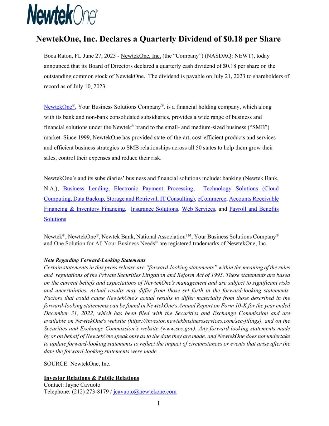 1 NewtekOne, Inc. Declares a Quarterly Dividend of $0.18 per Share Boca Raton, FL June 27, 2023 - NewtekOne, Inc. (the “Company”) (NASDAQ: NEWT), today announced that its Board of Directors declared a quarterly cash dividend of $0.18 per share on the outstanding common stock of NewtekOne. The dividend is payable on July 21, 2023 to shareholders of record as of July 10, 2023. NewtekOne®, Your Business Solutions Company®, is a financial holding company, which along with its bank and non-bank consolidated subsidiaries, provides a wide range of business and financial solutions under the Newtek® brand to the small- and medium-sized business (“SMB”) market. Since 1999, NewtekOne has provided state-of-the-art, cost-efficient products and services and efficient business strategies to SMB relationships across all 50 states to help them grow their sales, control their expenses and reduce their risk. NewtekOne’s and its subsidiaries’ business and financial solutions include: banking (Newtek Bank, N.A.), Business Lending, Electronic Payment Processing, Technology Solutions (Cloud Computing, Data Backup, Storage and Retrieval, IT Consulting), eCommerce, Accounts Receivable Financing & Inventory Financing, Insurance Solutions, Web Services, and Payroll and Benefits Solutions Newtek®, NewtekOne®, Newtek Bank, National AssociationTM, Your Business Solutions Company® and One Solution for All Your Business Needs® are registered trademarks of NewtekOne, Inc. Note Regarding Forward-Looking Statements Certain statements in this press release are “forward-looking statements” within the meaning of the rules and regulations of the Private Securities Litigation and Reform Act of 1995. These statements are based on the current beliefs and expectations of NewtekOne's management and are subject to significant risks and uncertainties. Actual results may differ from those set forth in the forward-looking statements. Factors that could cause NewtekOne's actual results to differ materially from those described in the forward-looking statements can be found in NewtekOne's Annual Report on Form 10-K for the year ended December 31, 2022, which has been filed with the Securities and Exchange Commission and are available on NewtekOne's website (https://investor.newtekbusinessservices.com/sec-filings), and on the Securities and Exchange Commission’s website (www.sec.gov). Any forward-looking statements made by or on behalf of NewtekOne speak only as to the date they are made, and NewtekOne does not undertake to update forward-looking statements to reflect the impact of circumstances or events that arise after the date the forward-looking statements were made. SOURCE: NewtekOne, Inc. Investor Relations & Public Relations Contact: Jayne Cavuoto Telephone: (212) 273-8179 / jcavuoto@newtekone.com