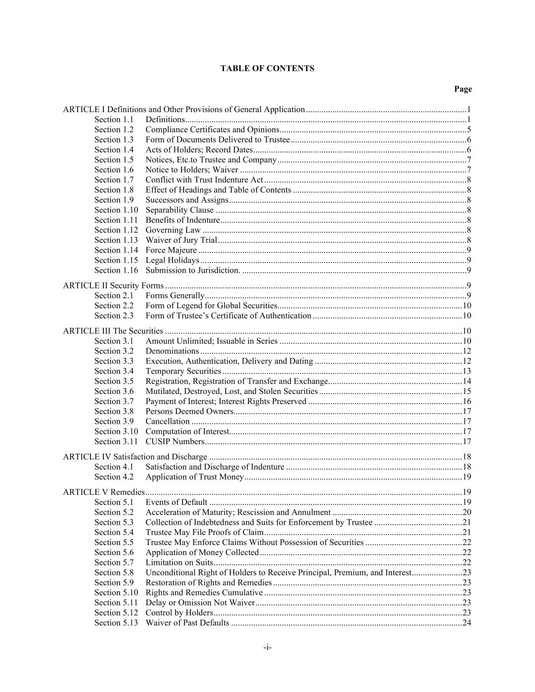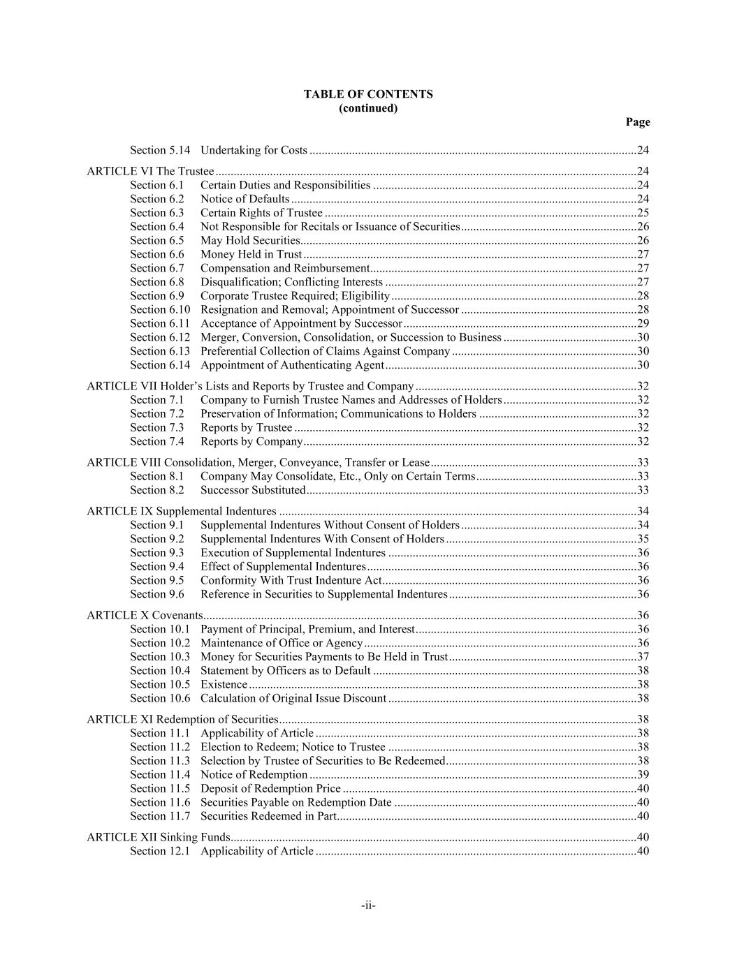 TABLE OF CONTENTS (continued) Page -ii- Section 5.14 Undertaking for Costs ............................................................................................................ 24 ARTICLE VI The Trustee ........................................................................................................................................... 24 Section 6.1 Certain Duties and Responsibilities ....................................................................................... 24 Section 6.2 Notice of Defaults .................................................................................................................. 24 Section 6.3 Certain Rights of Trustee ....................................................................................................... 25 Section 6.4 Not Responsible for Recitals or Issuance of Securities .......................................................... 26 Section 6.5 May Hold Securities ............................................................................................................... 26 Section 6.6 Money Held in Trust .............................................................................................................. 27 Section 6.7 Compensation and Reimbursement ........................................................................................ 27 Section 6.8 Disqualification; Conflicting Interests ................................................................................... 27 Section 6.9 Corporate Trustee Required; Eligibility ................................................................................. 28 Section 6.10 Resignation and Removal; Appointment of Successor .......................................................... 28 Section 6.11 Acceptance of Appointment by Successor ............................................................................. 29 Section 6.12 Merger, Conversion, Consolidation, or Succession to Business ............................................ 30 Section 6.13 Preferential Collection of Claims Against Company ............................................................. 30 Section 6.14 Appointment of Authenticating Agent ................................................................................... 30 ARTICLE VII Holder’s Lists and Reports by Trustee and Company ......................................................................... 32 Section 7.1 Company to Furnish Trustee Names and Addresses of Holders ............................................ 32 Section 7.2 Preservation of Information; Communications to Holders .................................................... 32 Section 7.3 Reports by Trustee ................................................................................................................. 32 Section 7.4 Reports by Company .............................................................................................................. 32 ARTICLE VIII Consolidation, Merger, Conveyance, Transfer or Lease .................................................................... 33 Section 8.1 Company May Consolidate, Etc., Only on Certain Terms ..................................................... 33 Section 8.2 Successor Substituted ............................................................................................................. 33 ARTICLE IX Supplemental Indentures ...................................................................................................................... 34 Section 9.1 Supplemental Indentures Without Consent of Holders .......................................................... 34 Section 9.2 Supplemental Indentures With Consent of Holders ............................................................... 35 Section 9.3 Execution of Supplemental Indentures .................................................................................. 36 Section 9.4 Effect of Supplemental Indentures ......................................................................................... 36 Section 9.5 Conformity With Trust Indenture Act .................................................................................... 36 Section 9.6 Reference in Securities to Supplemental Indentures .............................................................. 36 ARTICLE X Covenants ............................................................................................................................................... 36 Section 10.1 Payment of Principal, Premium, and Interest ......................................................................... 36 Section 10.2 Maintenance of Office or Agency .......................................................................................... 36 Section 10.3 Money for Securities Payments to Be Held in Trust .............................................................. 37 Section 10.4 Statement by Officers as to Default ....................................................................................... 38 Section 10.5 Existence ................................................................................................................................ 38 Section 10.6 Calculation of Original Issue Discount .................................................................................. 38 ARTICLE XI Redemption of Securities ...................................................................................................................... 38 Section 11.1 Applicability of Article .......................................................................................................... 38 Section 11.2 Election to Redeem; Notice to Trustee .................................................................................. 38 Section 11.3 Selection by Trustee of Securities to Be Redeemed ............................................................... 38 Section 11.4 Notice of Redemption ..................................................................................................