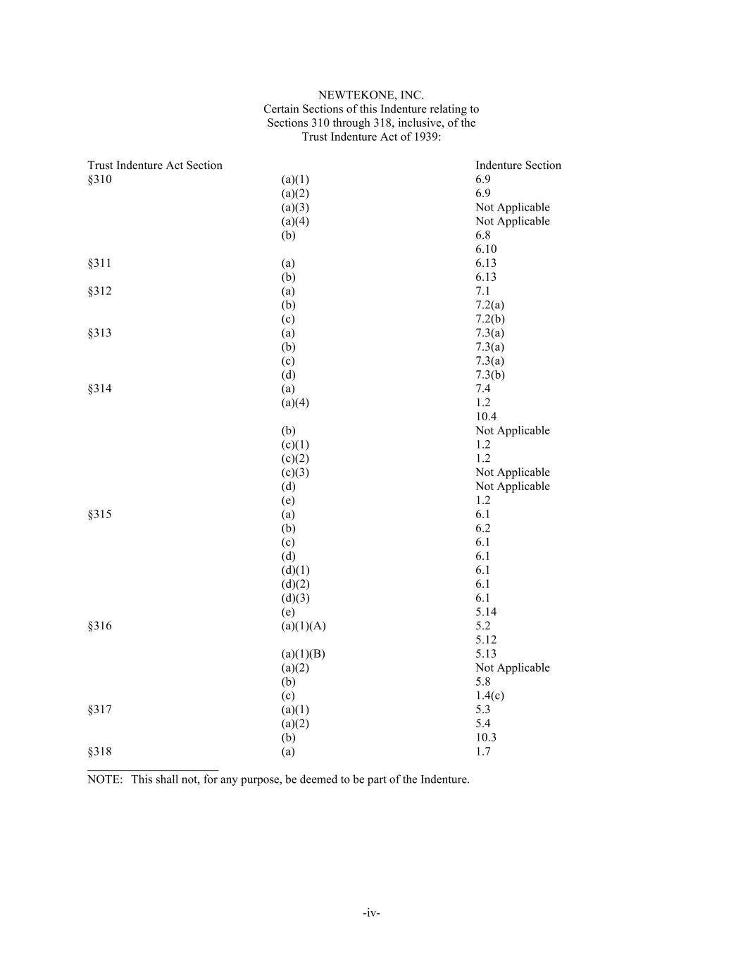 -iv- NEWTEKONE, INC. Certain Sections of this Indenture relating to Sections 310 through 318, inclusive, of the Trust Indenture Act of 1939: Trust Indenture Act Section Indenture Section §310 (a)(1) 6.9 (a)(2) 6.9 (a)(3) Not Applicable (a)(4) Not Applicable (b) 6.8 6.10 §311 (a) 6.13 (b) 6.13 §312 (a) 7.1 (b) 7.2(a) (c) 7.2(b) §313 (a) 7.3(a) (b) 7.3(a) (c) 7.3(a) (d) 7.3(b) §314 (a) 7.4 (a)(4) 1.2 10.4 (b) Not Applicable (c)(1) 1.2 (c)(2) 1.2 (c)(3) Not Applicable (d) Not Applicable (e) 1.2 §315 (a) 6.1 (b) 6.2 (c) 6.1 (d) 6.1 (d)(1) 6.1 (d)(2) 6.1 (d)(3) 6.1 (e) 5.14 §316 (a)(1)(A) 5.2 5.12 (a)(1)(B) 5.13 (a)(2) Not Applicable (b) 5.8 (c) 1.4(c) §317 (a)(1) 5.3 (a)(2) 5.4 (b) 10.3 §318 (a) 1.7 NOTE: This shall not, for any purpose, be deemed to be part of the Indenture.