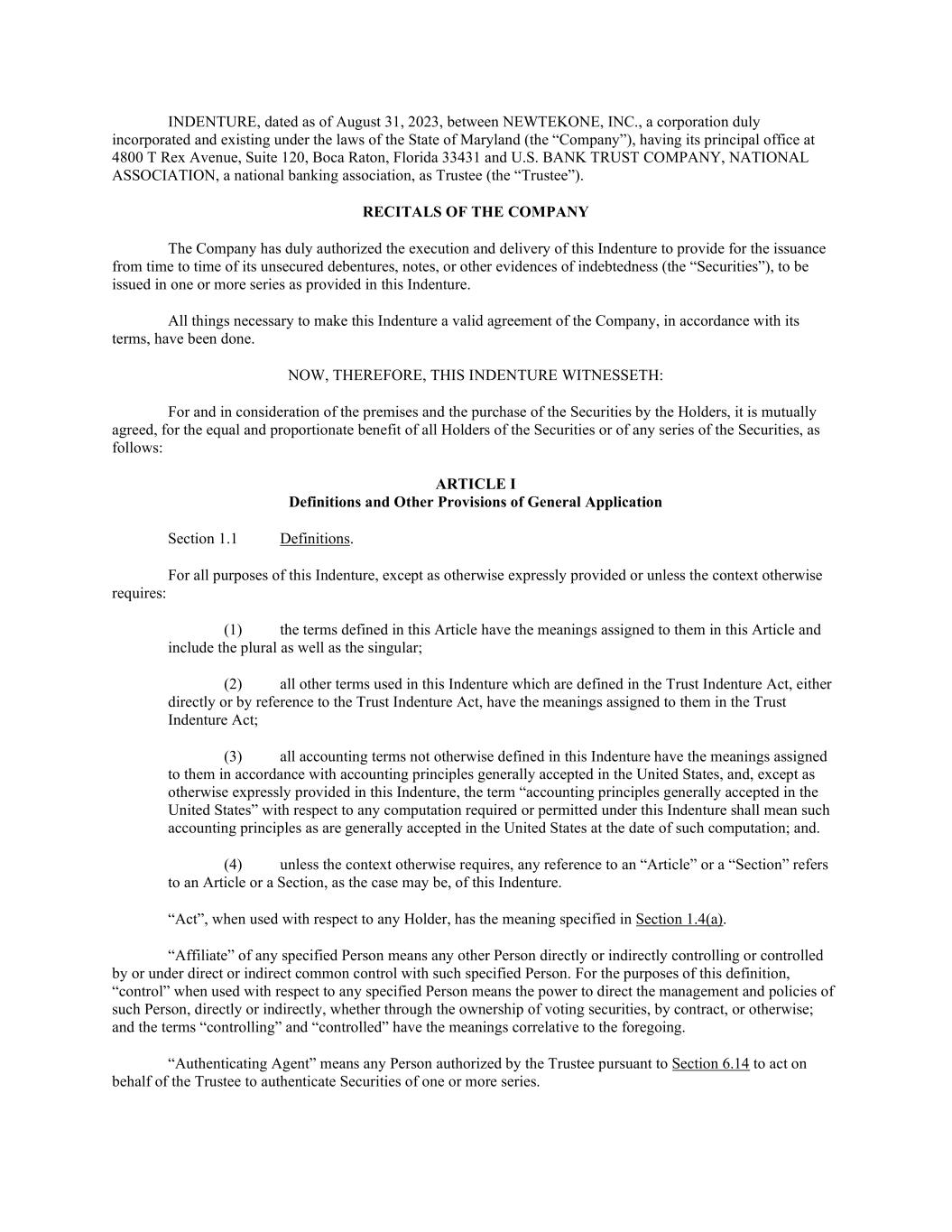 INDENTURE, dated as of August 31, 2023, between NEWTEKONE, INC., a corporation duly incorporated and existing under the laws of the State of Maryland (the “Company”), having its principal office at 4800 T Rex Avenue, Suite 120, Boca Raton, Florida 33431 and U.S. BANK TRUST COMPANY, NATIONAL ASSOCIATION, a national banking association, as Trustee (the “Trustee”). RECITALS OF THE COMPANY The Company has duly authorized the execution and delivery of this Indenture to provide for the issuance from time to time of its unsecured debentures, notes, or other evidences of indebtedness (the “Securities”), to be issued in one or more series as provided in this Indenture. All things necessary to make this Indenture a valid agreement of the Company, in accordance with its terms, have been done. NOW, THEREFORE, THIS INDENTURE WITNESSETH: For and in consideration of the premises and the purchase of the Securities by the Holders, it is mutually agreed, for the equal and proportionate benefit of all Holders of the Securities or of any series of the Securities, as follows: ARTICLE I Definitions and Other Provisions of General Application Section 1.1 Definitions. For all purposes of this Indenture, except as otherwise expressly provided or unless the context otherwise requires: (1) the terms defined in this Article have the meanings assigned to them in this Article and include the plural as well as the singular; (2) all other terms used in this Indenture which are defined in the Trust Indenture Act, either directly or by reference to the Trust Indenture Act, have the meanings assigned to them in the Trust Indenture Act; (3) all accounting terms not otherwise defined in this Indenture have the meanings assigned to them in accordance with accounting principles generally accepted in the United States, and, except as otherwise expressly provided in this Indenture, the term “accounting principles generally accepted in the United States” with respect to any computation required or permitted under this Indenture shall mean such accounting principles as are generally accepted in the United States at the date of such computation; and. (4) unless the context otherwise requires, any reference to an “Article” or a “Section” refers to an Article or a Section, as the case may be, of this Indenture. “Act”, when used with respect to any Holder, has the meaning specified in Section 1.4(a). “Affiliate” of any specified Person means any other Person directly or indirectly controlling or controlled by or under direct or indirect common control with such specified Person. For the purposes of this definition, “control” when used with respect to any specified Person means the power to direct the management and policies of such Person, directly or indirectly, whether through the ownership of voting securities, by contract, or otherwise; and the terms “controlling” and “controlled” have the meanings correlative to the foregoing. “Authenticating Agent” means any Person authorized by the Trustee pursuant to Section 6.14 to act on behalf of the Trustee to authenticate Securities of one or more series.