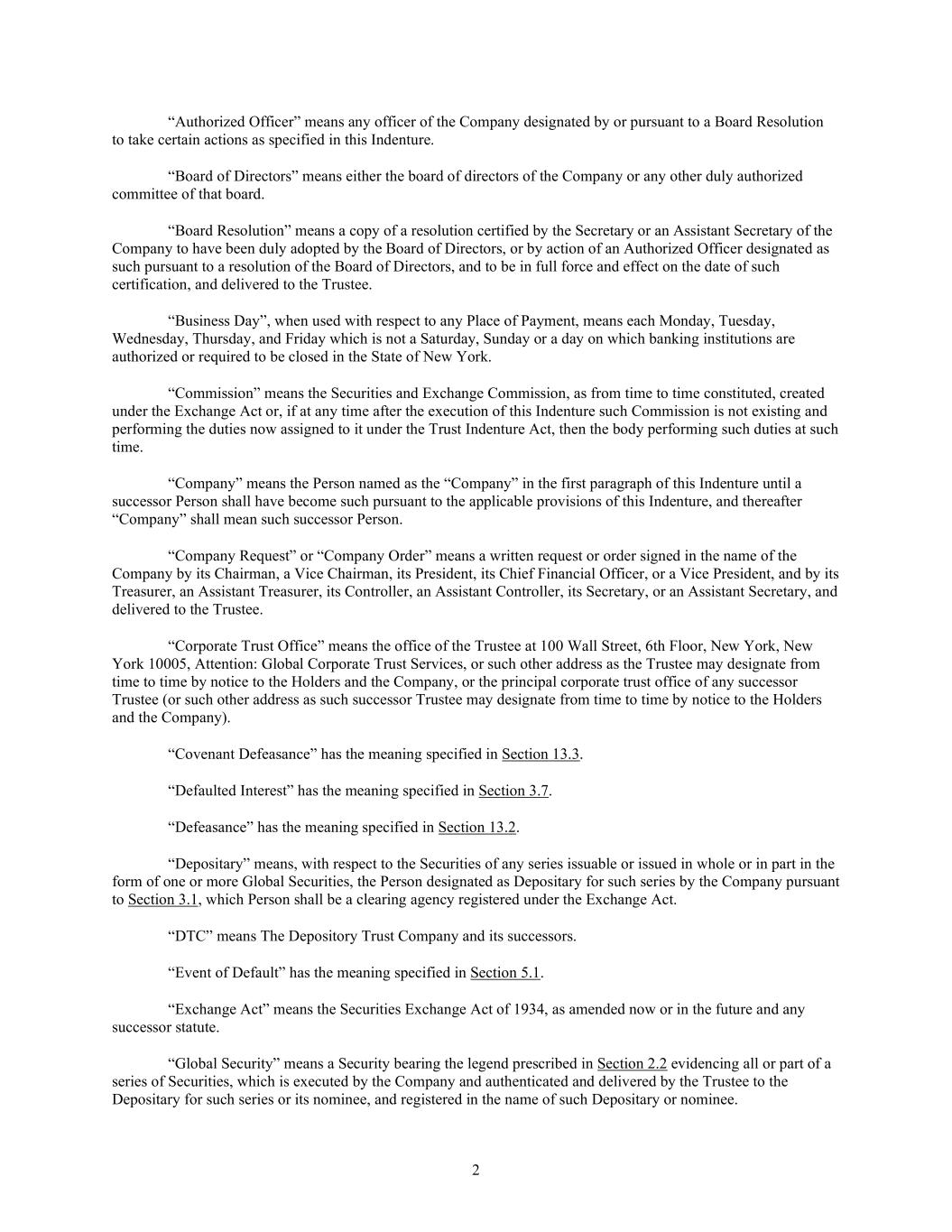 2 “Authorized Officer” means any officer of the Company designated by or pursuant to a Board Resolution to take certain actions as specified in this Indenture. “Board of Directors” means either the board of directors of the Company or any other duly authorized committee of that board. “Board Resolution” means a copy of a resolution certified by the Secretary or an Assistant Secretary of the Company to have been duly adopted by the Board of Directors, or by action of an Authorized Officer designated as such pursuant to a resolution of the Board of Directors, and to be in full force and effect on the date of such certification, and delivered to the Trustee. “Business Day”, when used with respect to any Place of Payment, means each Monday, Tuesday, Wednesday, Thursday, and Friday which is not a Saturday, Sunday or a day on which banking institutions are authorized or required to be closed in the State of New York. “Commission” means the Securities and Exchange Commission, as from time to time constituted, created under the Exchange Act or, if at any time after the execution of this Indenture such Commission is not existing and performing the duties now assigned to it under the Trust Indenture Act, then the body performing such duties at such time. “Company” means the Person named as the “Company” in the first paragraph of this Indenture until a successor Person shall have become such pursuant to the applicable provisions of this Indenture, and thereafter “Company” shall mean such successor Person. “Company Request” or “Company Order” means a written request or order signed in the name of the Company by its Chairman, a Vice Chairman, its President, its Chief Financial Officer, or a Vice President, and by its Treasurer, an Assistant Treasurer, its Controller, an Assistant Controller, its Secretary, or an Assistant Secretary, and delivered to the Trustee. “Corporate Trust Office” means the office of the Trustee at 100 Wall Street, 6th Floor, New York, New York 10005, Attention: Global Corporate Trust Services, or such other address as the Trustee may designate from time to time by notice to the Holders and the Company, or the principal corporate trust office of any successor Trustee (or such other address as such successor Trustee may designate from time to time by notice to the Holders and the Company). “Covenant Defeasance” has the meaning specified in Section 13.3. “Defaulted Interest” has the meaning specified in Section 3.7. “Defeasance” has the meaning specified in Section 13.2. “Depositary” means, with respect to the Securities of any series issuable or issued in whole or in part in the form of one or more Global Securities, the Person designated as Depositary for such series by the Company pursuant to Section 3.1, which Person shall be a clearing agency registered under the Exchange Act. “DTC” means The Depository Trust Company and its successors. “Event of Default” has the meaning specified in Section 5.1. “Exchange Act” means the Securities Exchange Act of 1934, as amended now or in the future and any successor statute. “Global Security” means a Security bearing the legend prescribed in Section 2.2 evidencing all or part of a series of Securities, which is executed by the Company and authenticated and delivered by the Trustee to the Depositary for such series or its nominee, and registered in the name of such Depositary or nominee.