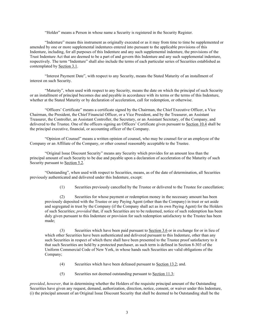 3 “Holder” means a Person in whose name a Security is registered in the Security Register. “Indenture” means this instrument as originally executed or as it may from time to time be supplemented or amended by one or more supplemental indentures entered into pursuant to the applicable provisions of this Indenture, including, for all purposes of this Indenture and any such supplemental indenture, the provisions of the Trust Indenture Act that are deemed to be a part of and govern this Indenture and any such supplemental indenture, respectively. The term “Indenture” shall also include the terms of each particular series of Securities established as contemplated by Section 3.1. “Interest Payment Date”, with respect to any Security, means the Stated Maturity of an installment of interest on such Security. “Maturity”, when used with respect to any Security, means the date on which the principal of such Security or an installment of principal becomes due and payable in accordance with its terms or the terms of this Indenture, whether at the Stated Maturity or by declaration of acceleration, call for redemption, or otherwise. “Officers’ Certificate” means a certificate signed by the Chairman, the Chief Executive Officer, a Vice Chairman, the President, the Chief Financial Officer, or a Vice President, and by the Treasurer, an Assistant Treasurer, the Controller, an Assistant Controller, the Secretary, or an Assistant Secretary, of the Company, and delivered to the Trustee. One of the officers signing an Officers’ Certificate given pursuant to Section 10.4 shall be the principal executive, financial, or accounting officer of the Company. “Opinion of Counsel” means a written opinion of counsel, who may be counsel for or an employee of the Company or an Affiliate of the Company, or other counsel reasonably acceptable to the Trustee. “Original Issue Discount Security” means any Security which provides for an amount less than the principal amount of such Security to be due and payable upon a declaration of acceleration of the Maturity of such Security pursuant to Section 5.2. “Outstanding”, when used with respect to Securities, means, as of the date of determination, all Securities previously authenticated and delivered under this Indenture, except: (1) Securities previously cancelled by the Trustee or delivered to the Trustee for cancellation; (2) Securities for whose payment or redemption money in the necessary amount has been previously deposited with the Trustee or any Paying Agent (other than the Company) in trust or set aside and segregated in trust by the Company (if the Company shall act as its own Paying Agent) for the Holders of such Securities; provided that, if such Securities are to be redeemed, notice of such redemption has been duly given pursuant to this Indenture or provision for such redemption satisfactory to the Trustee has been made; (3) Securities which have been paid pursuant to Section 3.6 or in exchange for or in lieu of which other Securities have been authenticated and delivered pursuant to this Indenture, other than any such Securities in respect of which there shall have been presented to the Trustee proof satisfactory to it that such Securities are held by a protected purchaser, as such term is defined in Section 8-303 of the Uniform Commercial Code of New York, in whose hands such Securities are valid obligations of the Company; (4) Securities which have been defeased pursuant to Section 13.2; and. (5) Securities not deemed outstanding pursuant to Section 11.3; provided, however, that in determining whether the Holders of the requisite principal amount of the Outstanding Securities have given any request, demand, authorization, direction, notice, consent, or waiver under this Indenture, (i) the principal amount of an Original Issue Discount Security that shall be deemed to be Outstanding shall be the