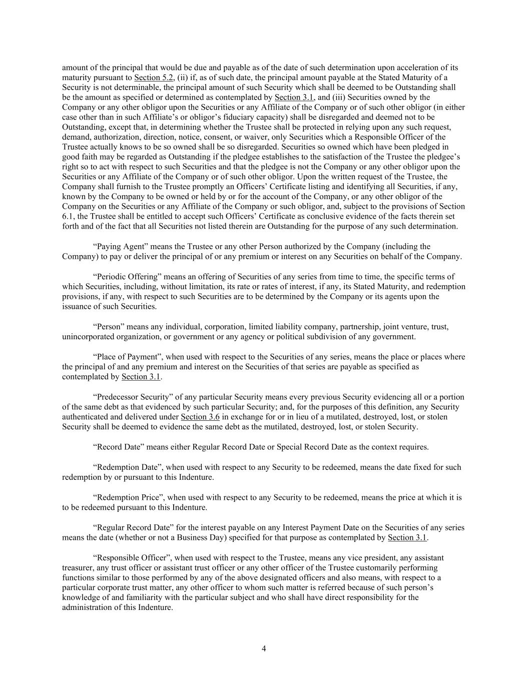4 amount of the principal that would be due and payable as of the date of such determination upon acceleration of its maturity pursuant to Section 5.2, (ii) if, as of such date, the principal amount payable at the Stated Maturity of a Security is not determinable, the principal amount of such Security which shall be deemed to be Outstanding shall be the amount as specified or determined as contemplated by Section 3.1, and (iii) Securities owned by the Company or any other obligor upon the Securities or any Affiliate of the Company or of such other obligor (in either case other than in such Affiliate’s or obligor’s fiduciary capacity) shall be disregarded and deemed not to be Outstanding, except that, in determining whether the Trustee shall be protected in relying upon any such request, demand, authorization, direction, notice, consent, or waiver, only Securities which a Responsible Officer of the Trustee actually knows to be so owned shall be so disregarded. Securities so owned which have been pledged in good faith may be regarded as Outstanding if the pledgee establishes to the satisfaction of the Trustee the pledgee’s right so to act with respect to such Securities and that the pledgee is not the Company or any other obligor upon the Securities or any Affiliate of the Company or of such other obligor. Upon the written request of the Trustee, the Company shall furnish to the Trustee promptly an Officers’ Certificate listing and identifying all Securities, if any, known by the Company to be owned or held by or for the account of the Company, or any other obligor of the Company on the Securities or any Affiliate of the Company or such obligor, and, subject to the provisions of Section 6.1, the Trustee shall be entitled to accept such Officers’ Certificate as conclusive evidence of the facts therein set forth and of the fact that all Securities not listed therein are Outstanding for the purpose of any such determination. “Paying Agent” means the Trustee or any other Person authorized by the Company (including the Company) to pay or deliver the principal of or any premium or interest on any Securities on behalf of the Company. “Periodic Offering” means an offering of Securities of any series from time to time, the specific terms of which Securities, including, without limitation, its rate or rates of interest, if any, its Stated Maturity, and redemption provisions, if any, with respect to such Securities are to be determined by the Company or its agents upon the issuance of such Securities. “Person” means any individual, corporation, limited liability company, partnership, joint venture, trust, unincorporated organization, or government or any agency or political subdivision of any government. “Place of Payment”, when used with respect to the Securities of any series, means the place or places where the principal of and any premium and interest on the Securities of that series are payable as specified as contemplated by Section 3.1. “Predecessor Security” of any particular Security means every previous Security evidencing all or a portion of the same debt as that evidenced by such particular Security; and, for the purposes of this definition, any Security authenticated and delivered under Section 3.6 in exchange for or in lieu of a mutilated, destroyed, lost, or stolen Security shall be deemed to evidence the same debt as the mutilated, destroyed, lost, or stolen Security. “Record Date” means either Regular Record Date or Special Record Date as the context requires. “Redemption Date”, when used with respect to any Security to be redeemed, means the date fixed for such redemption by or pursuant to this Indenture. “Redemption Price”, when used with respect to any Security to be redeemed, means the price at which it is to be redeemed pursuant to this Indenture. “Regular Record Date” for the interest payable on any Interest Payment Date on the Securities of any series means the date (whether or not a Business Day) specified for that purpose as contemplated by Section 3.1. “Responsible Officer”, when used with respect to the Trustee, means any vice president, any assistant treasurer, any trust officer or assistant trust officer or any other officer of the Trustee customarily performing functions similar to those performed by any of the above designated officers and also means, with respect to a particular corporate trust matter, any other officer to whom such matter is referred because of such person’s knowledge of and familiarity with the particular subject and who shall have direct responsibility for the administration of this Indenture.