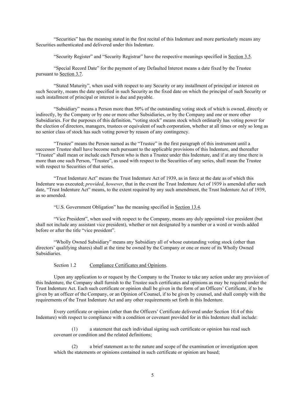 5 “Securities” has the meaning stated in the first recital of this Indenture and more particularly means any Securities authenticated and delivered under this Indenture. “Security Register” and “Security Registrar” have the respective meanings specified in Section 3.5. “Special Record Date” for the payment of any Defaulted Interest means a date fixed by the Trustee pursuant to Section 3.7. “Stated Maturity”, when used with respect to any Security or any installment of principal or interest on such Security, means the date specified in such Security as the fixed date on which the principal of such Security or such installment of principal or interest is due and payable. “Subsidiary” means a Person more than 50% of the outstanding voting stock of which is owned, directly or indirectly, by the Company or by one or more other Subsidiaries, or by the Company and one or more other Subsidiaries. For the purposes of this definition, “voting stock” means stock which ordinarily has voting power for the election of directors, managers, trustees or equivalent of such corporation, whether at all times or only so long as no senior class of stock has such voting power by reason of any contingency. “Trustee” means the Person named as the “Trustee” in the first paragraph of this instrument until a successor Trustee shall have become such pursuant to the applicable provisions of this Indenture, and thereafter “Trustee” shall mean or include each Person who is then a Trustee under this Indenture, and if at any time there is more than one such Person, “Trustee”, as used with respect to the Securities of any series, shall mean the Trustee with respect to Securities of that series. “Trust Indenture Act” means the Trust Indenture Act of 1939, as in force at the date as of which this Indenture was executed; provided, however, that in the event the Trust Indenture Act of 1939 is amended after such date, “Trust Indenture Act” means, to the extent required by any such amendment, the Trust Indenture Act of 1939, as so amended. “U.S. Government Obligation” has the meaning specified in Section 13.4. “Vice President”, when used with respect to the Company, means any duly appointed vice president (but shall not include any assistant vice president), whether or not designated by a number or a word or words added before or after the title “vice president”. “Wholly Owned Subsidiary” means any Subsidiary all of whose outstanding voting stock (other than directors’ qualifying shares) shall at the time be owned by the Company or one or more of its Wholly Owned Subsidiaries. Section 1.2 Compliance Certificates and Opinions. Upon any application to or request by the Company to the Trustee to take any action under any provision of this Indenture, the Company shall furnish to the Trustee such certificates and opinions as may be required under the Trust Indenture Act. Each such certificate or opinion shall be given in the form of an Officers’ Certificate, if to be given by an officer of the Company, or an Opinion of Counsel, if to be given by counsel, and shall comply with the requirements of the Trust Indenture Act and any other requirements set forth in this Indenture. Every certificate or opinion (other than the Officers’ Certificate delivered under Section 10.4 of this Indenture) with respect to compliance with a condition or covenant provided for in this Indenture shall include: (1) a statement that each individual signing such certificate or opinion has read such covenant or condition and the related definitions; (2) a brief statement as to the nature and scope of the examination or investigation upon which the statements or opinions contained in such certificate or opinion are based;