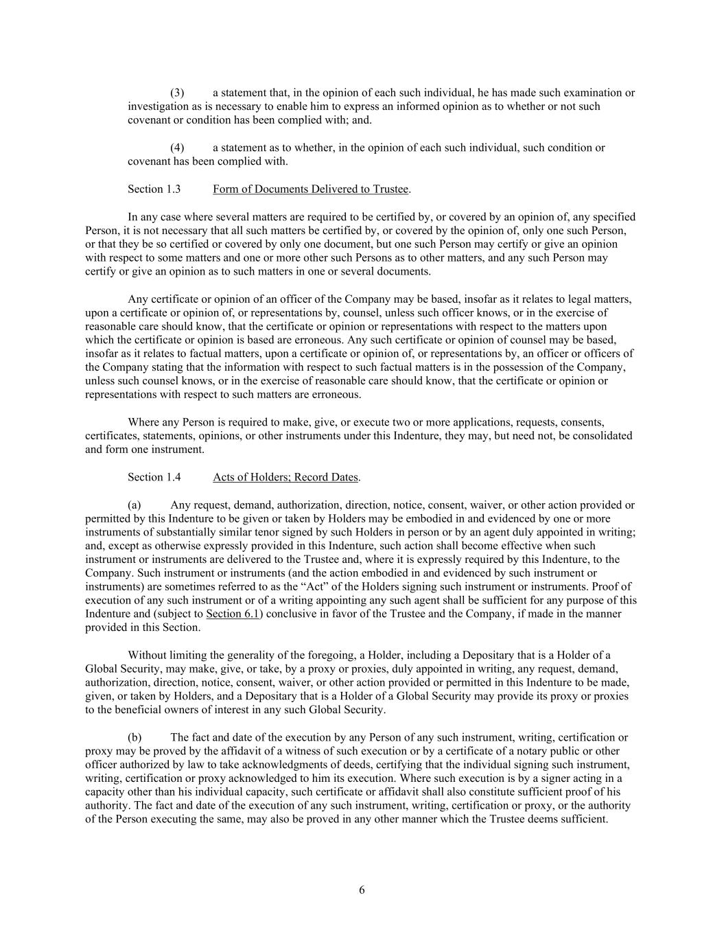 6 (3) a statement that, in the opinion of each such individual, he has made such examination or investigation as is necessary to enable him to express an informed opinion as to whether or not such covenant or condition has been complied with; and. (4) a statement as to whether, in the opinion of each such individual, such condition or covenant has been complied with. Section 1.3 Form of Documents Delivered to Trustee. In any case where several matters are required to be certified by, or covered by an opinion of, any specified Person, it is not necessary that all such matters be certified by, or covered by the opinion of, only one such Person, or that they be so certified or covered by only one document, but one such Person may certify or give an opinion with respect to some matters and one or more other such Persons as to other matters, and any such Person may certify or give an opinion as to such matters in one or several documents. Any certificate or opinion of an officer of the Company may be based, insofar as it relates to legal matters, upon a certificate or opinion of, or representations by, counsel, unless such officer knows, or in the exercise of reasonable care should know, that the certificate or opinion or representations with respect to the matters upon which the certificate or opinion is based are erroneous. Any such certificate or opinion of counsel may be based, insofar as it relates to factual matters, upon a certificate or opinion of, or representations by, an officer or officers of the Company stating that the information with respect to such factual matters is in the possession of the Company, unless such counsel knows, or in the exercise of reasonable care should know, that the certificate or opinion or representations with respect to such matters are erroneous. Where any Person is required to make, give, or execute two or more applications, requests, consents, certificates, statements, opinions, or other instruments under this Indenture, they may, but need not, be consolidated and form one instrument. Section 1.4 Acts of Holders; Record Dates. (a) Any request, demand, authorization, direction, notice, consent, waiver, or other action provided or permitted by this Indenture to be given or taken by Holders may be embodied in and evidenced by one or more instruments of substantially similar tenor signed by such Holders in person or by an agent duly appointed in writing; and, except as otherwise expressly provided in this Indenture, such action shall become effective when such instrument or instruments are delivered to the Trustee and, where it is expressly required by this Indenture, to the Company. Such instrument or instruments (and the action embodied in and evidenced by such instrument or instruments) are sometimes referred to as the “Act” of the Holders signing such instrument or instruments. Proof of execution of any such instrument or of a writing appointing any such agent shall be sufficient for any purpose of this Indenture and (subject to Section 6.1) conclusive in favor of the Trustee and the Company, if made in the manner provided in this Section. Without limiting the generality of the foregoing, a Holder, including a Depositary that is a Holder of a Global Security, may make, give, or take, by a proxy or proxies, duly appointed in writing, any request, demand, authorization, direction, notice, consent, waiver, or other action provided or permitted in this Indenture to be made, given, or taken by Holders, and a Depositary that is a Holder of a Global Security may provide its proxy or proxies to the beneficial owners of interest in any such Global Security. (b) The fact and date of the execution by any Person of any such instrument, writing, certification or proxy may be proved by the affidavit of a witness of such execution or by a certificate of a notary public or other officer authorized by law to take acknowledgments of deeds, certifying that the individual signing such instrument, writing, certification or proxy acknowledged to him its execution. Where such execution is by a signer acting in a capacity other than his individual capacity, such certificate or affidavit shall also constitute sufficient proof of his authority. The fact and date of the execution of any such instrument, writing, certification or proxy, or the authority of the Person executing the same, may also be proved in any other manner which the Trustee deems sufficient.